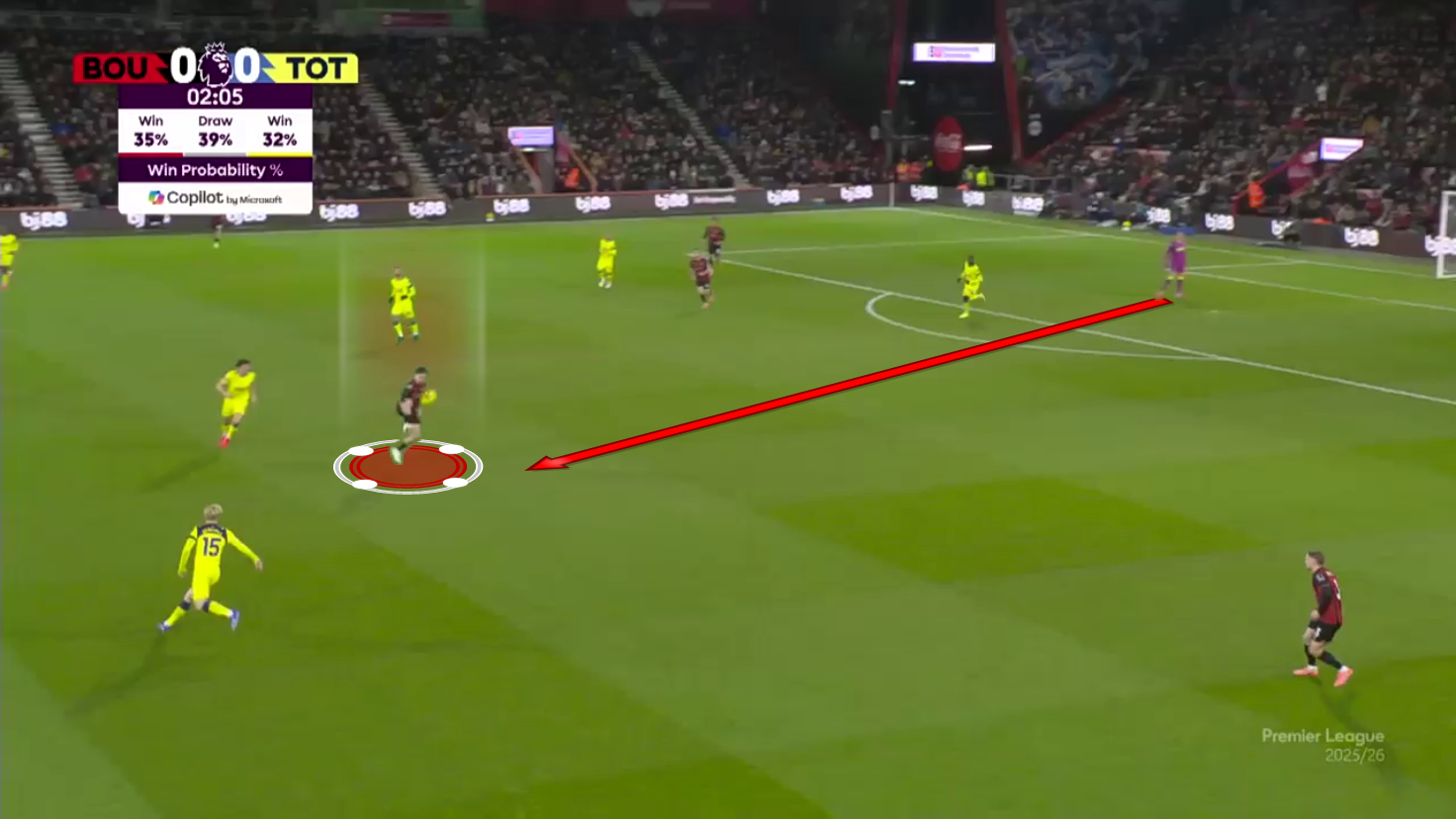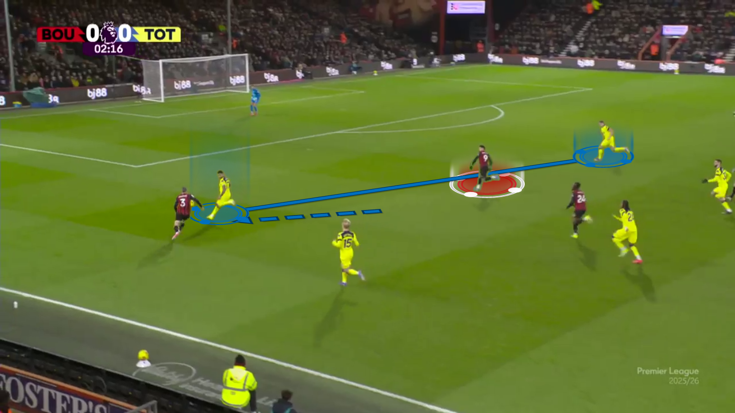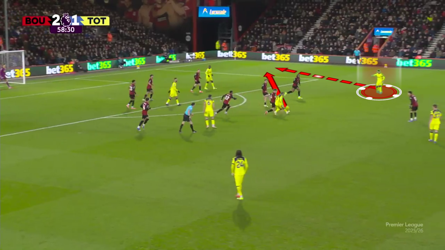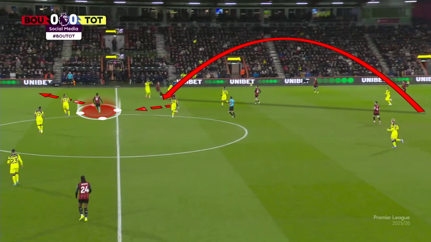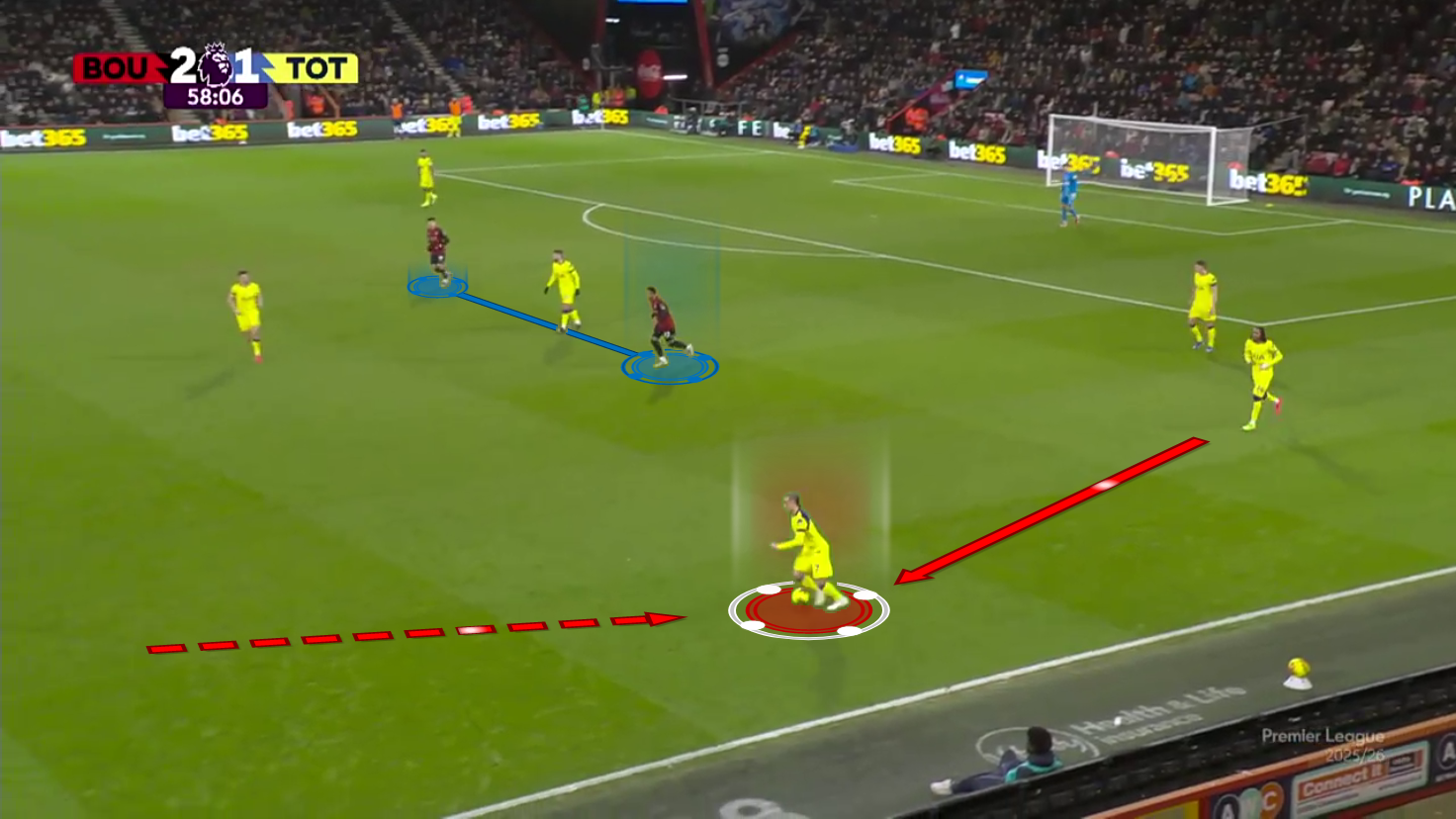 Spurs very aggressively condensed around Semenyo in the central areas, trying to win the ball there, but instead, Bournemouth now had the ability to switch play again easily.