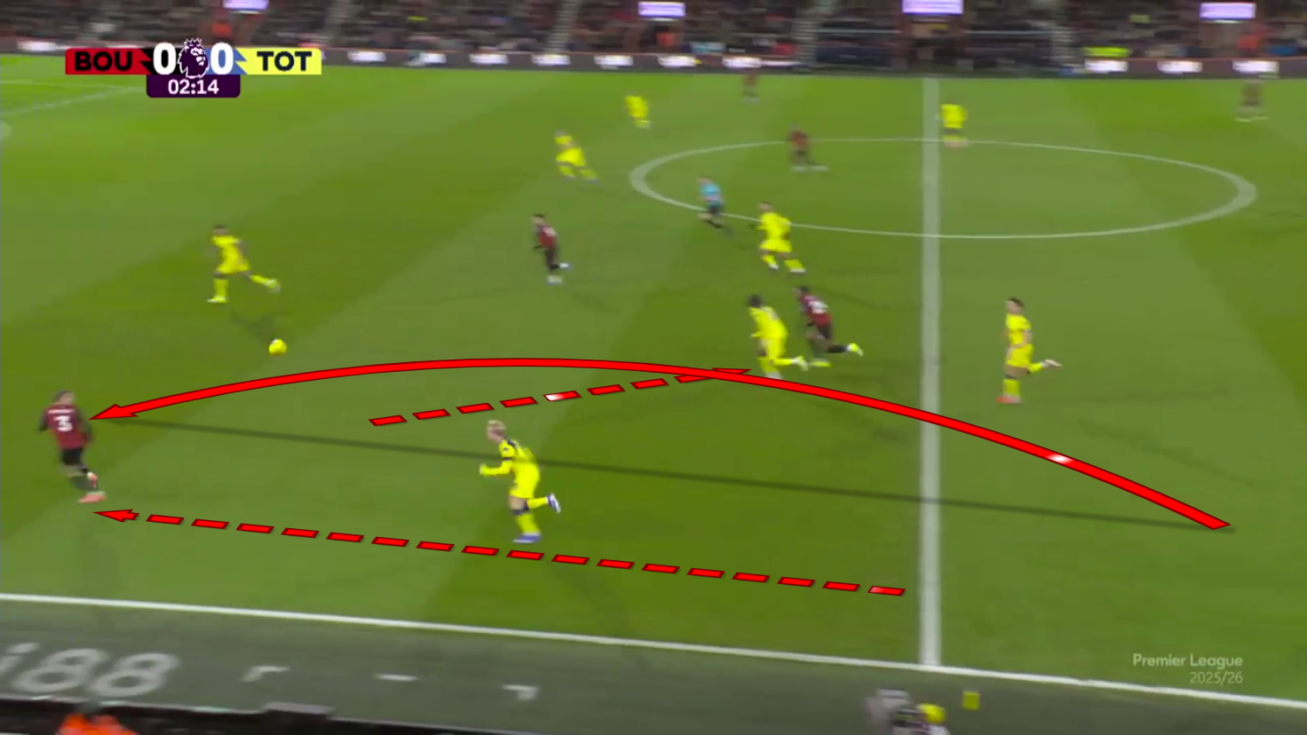 Here, Evanilson is wide open in the centre, and Romero has to defend Truffert at a very high pace, so Bournemouth gets into the box easily, where the shot is blocked.