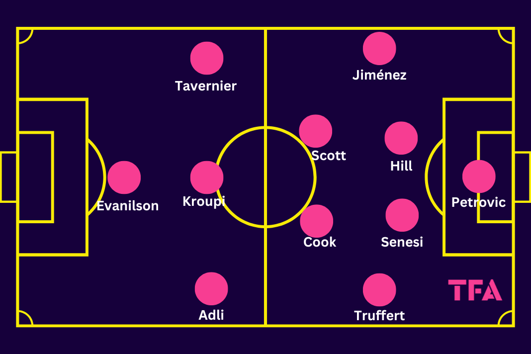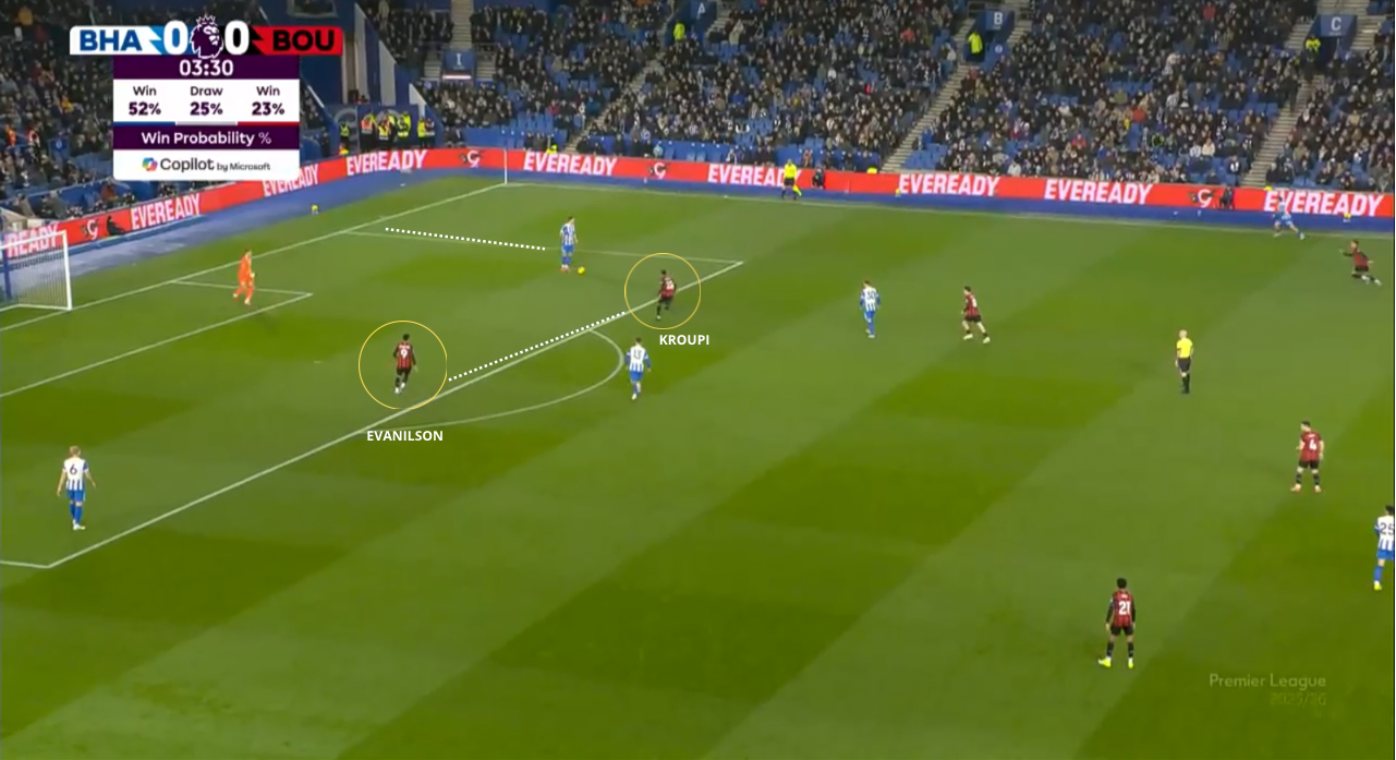 Eli Junior Kroupi operated as the number 10 behind Evanilson, while Marcus Tavernier and Amine Adli provided width and verticality, particularly targeting the space behind Brighton’s high line.