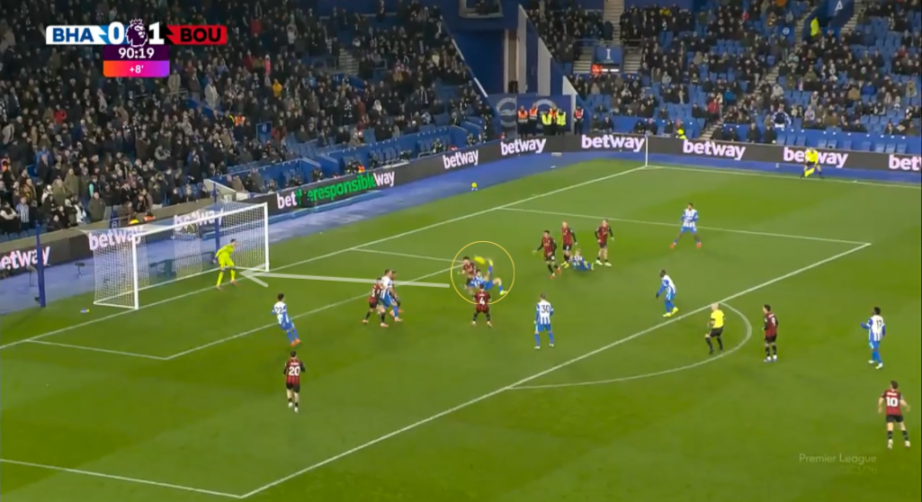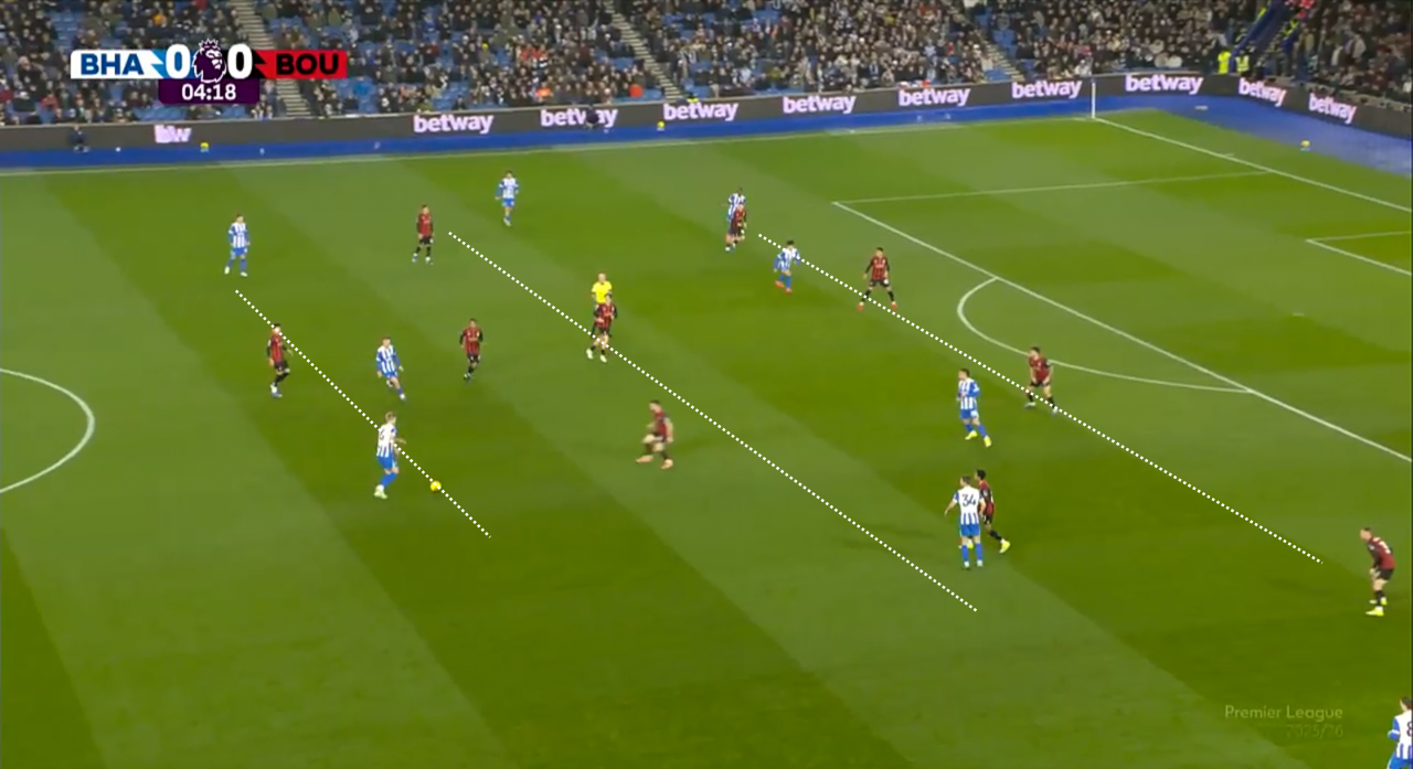 Andoni Iraola’s side executed their plan effectively for long periods, combining first-half pressing with a compact second-half low block to limit Brighton’s access to central zones.