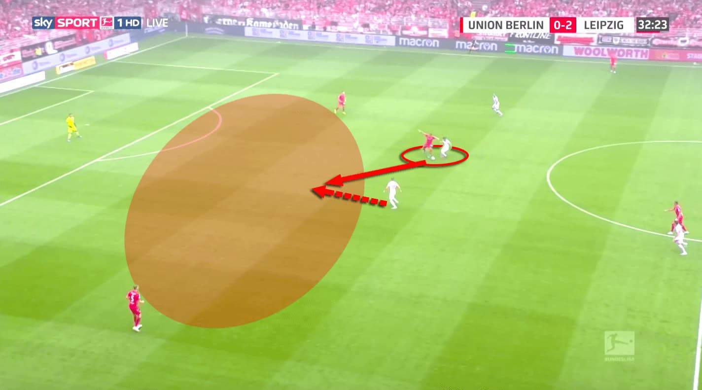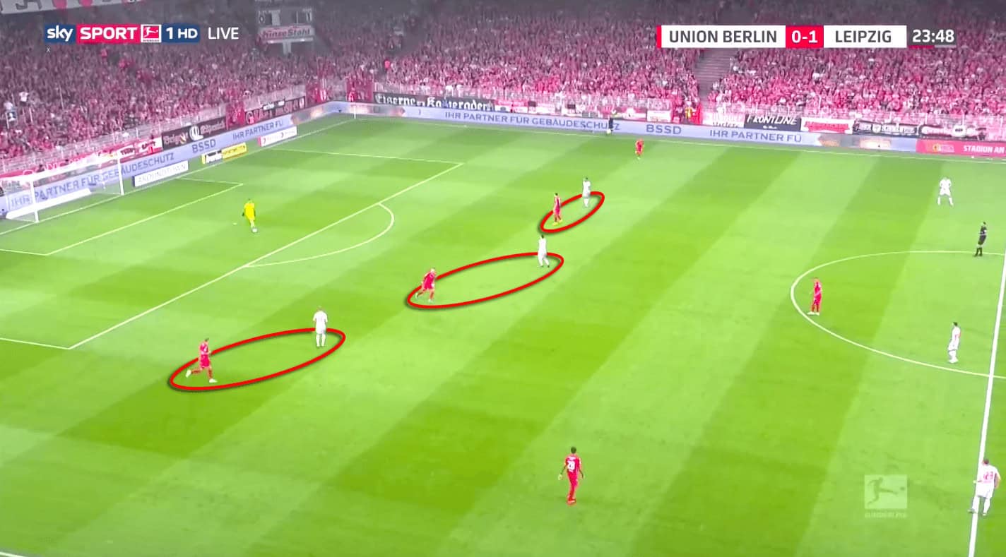 Another way of breaking Union’s midfield was that Leipzig’s advanced midfielders positioned themselves high and far away from each other. That way, Union Berlin was incapable of marking the ball far advanced midfielder who could receive the ball after a switch of play.