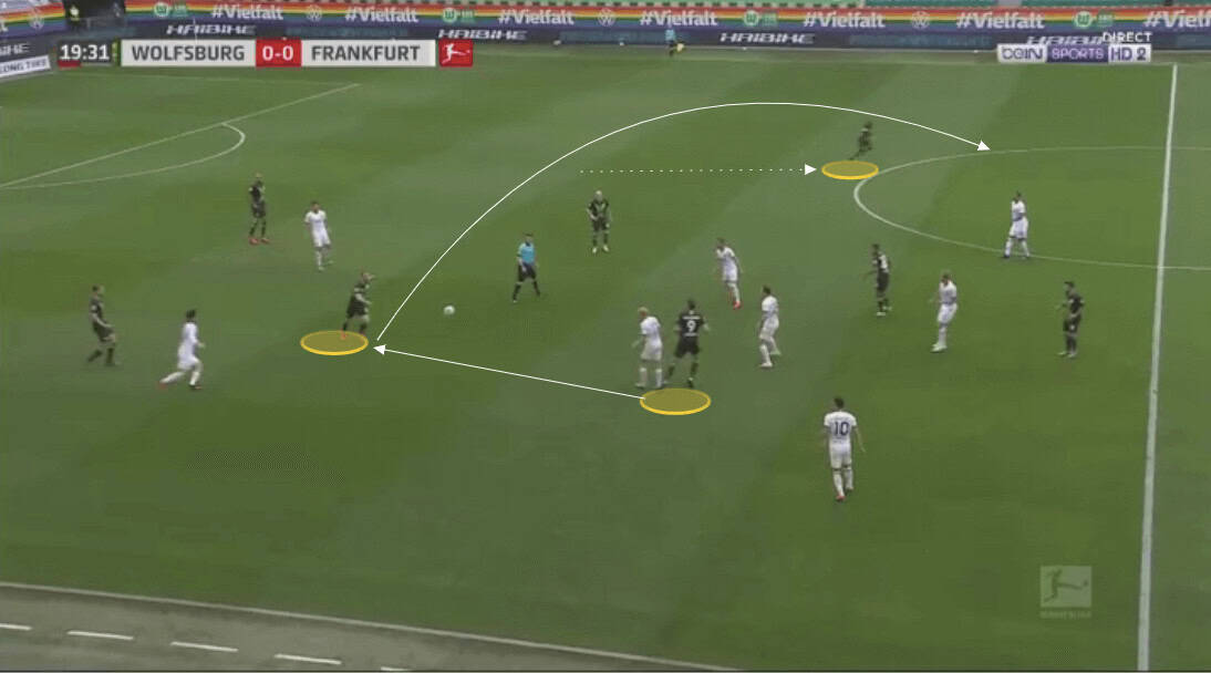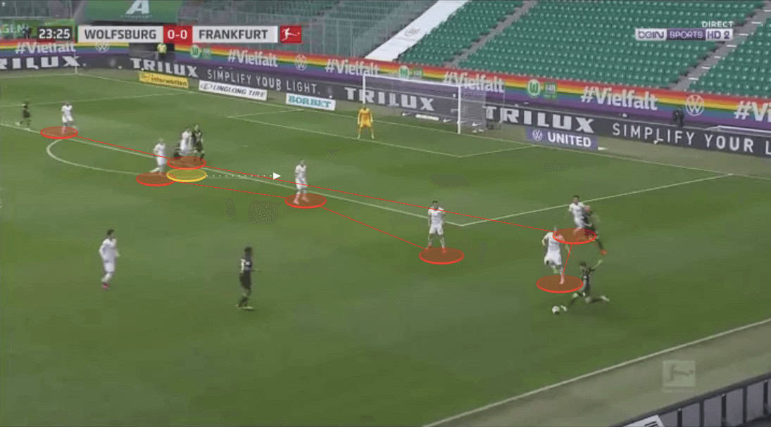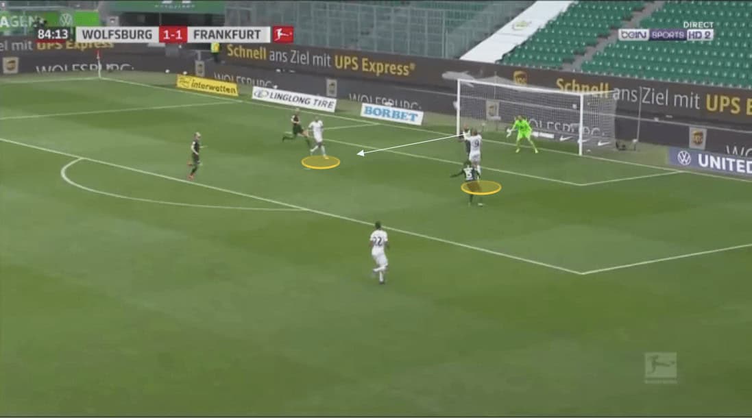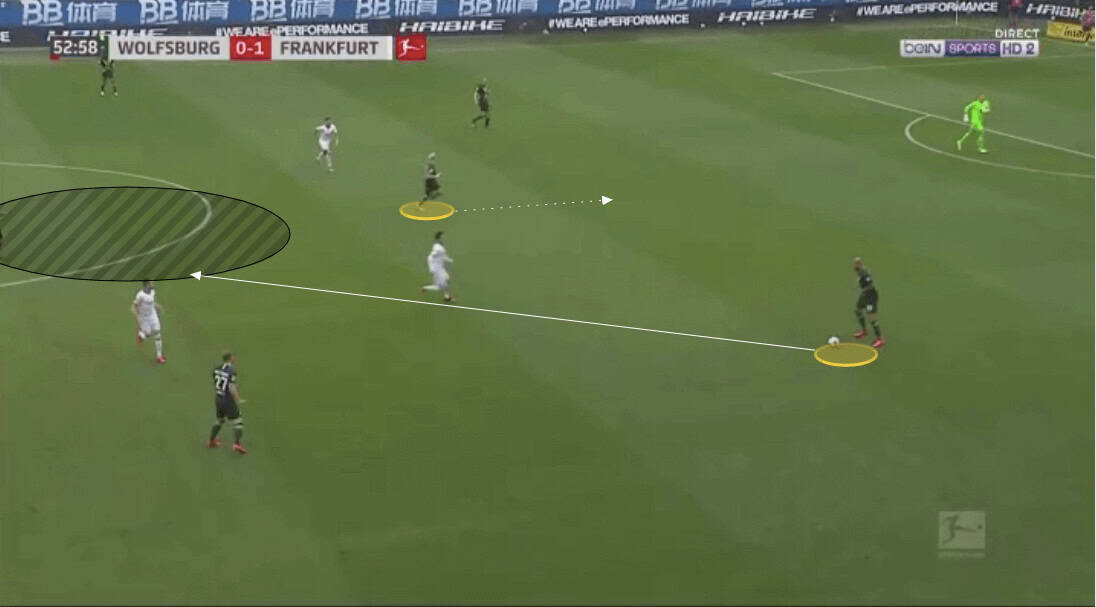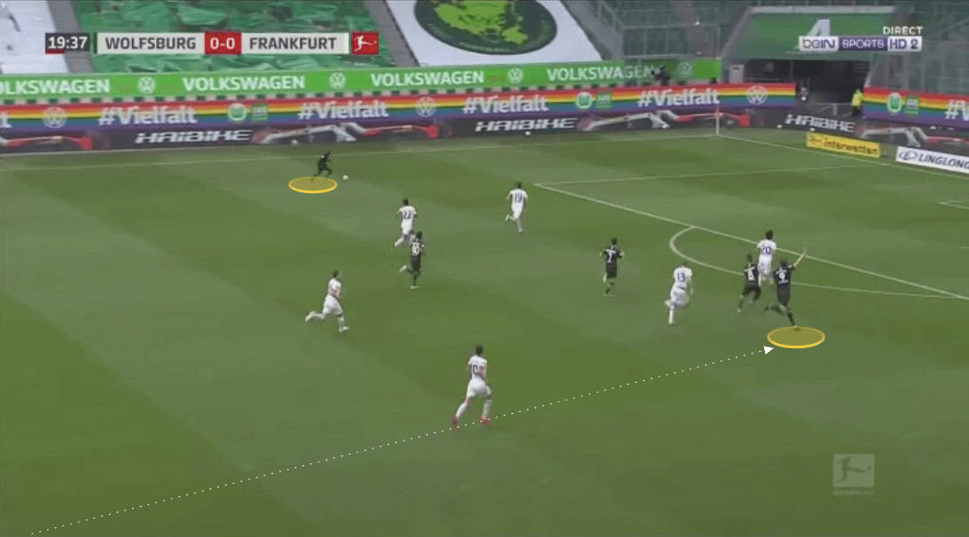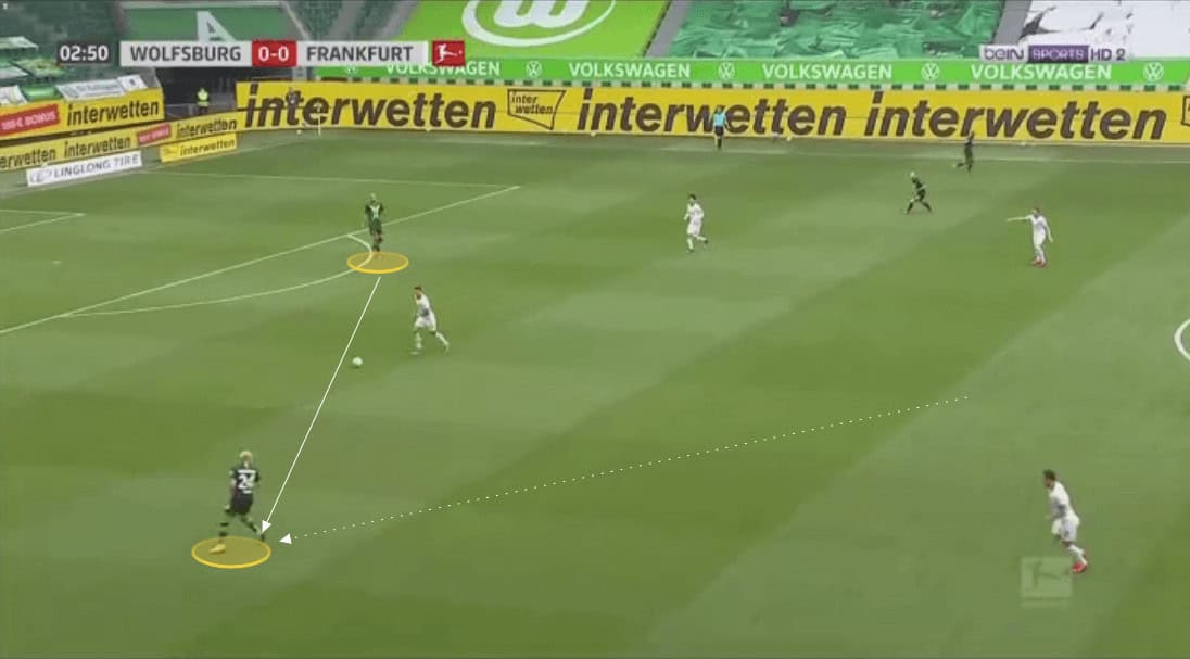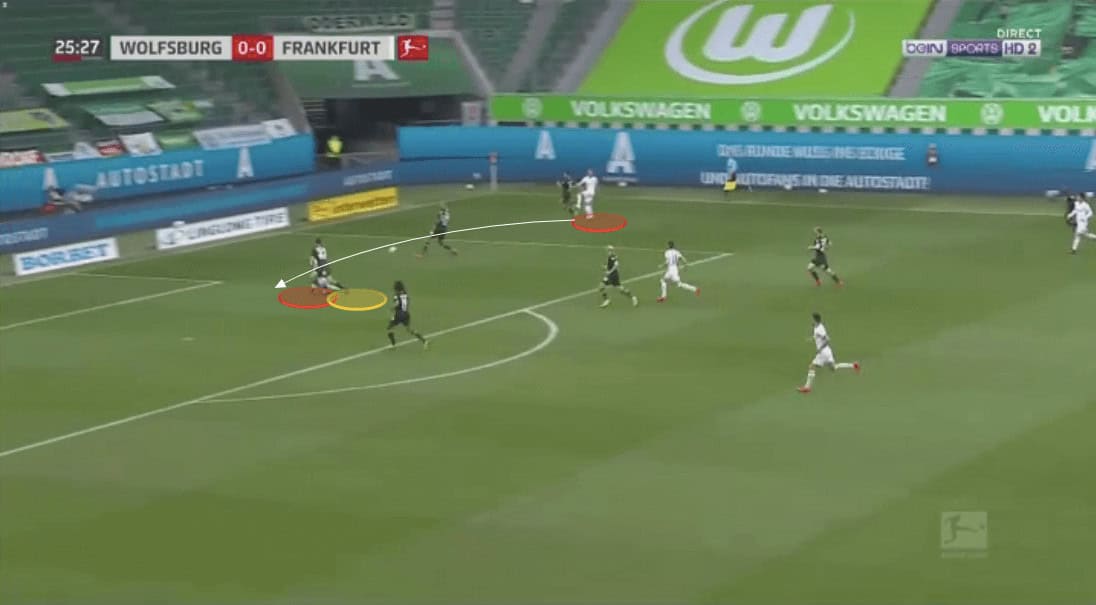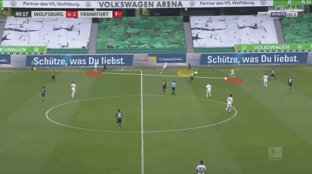 Wolfsburg looked to overload in wider areas and we can see how Mbabu plays the pass inside whilst Steffen stays outside ensuring Hinteregger is dragged over. There are big spaces between Frankfurt’s backline here and Wolfsburg could have exploited this more.