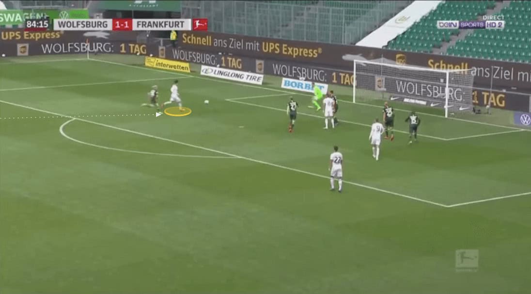Yet the header went past Sow, and Kamada was able to arrive into the vacant space left open with Mbabu having attempted to block the initial cross and unlike Frankfurt, Wolfsburg’s midfield wasn’t close enough to their defence to drop in and fill the vacant spaces.