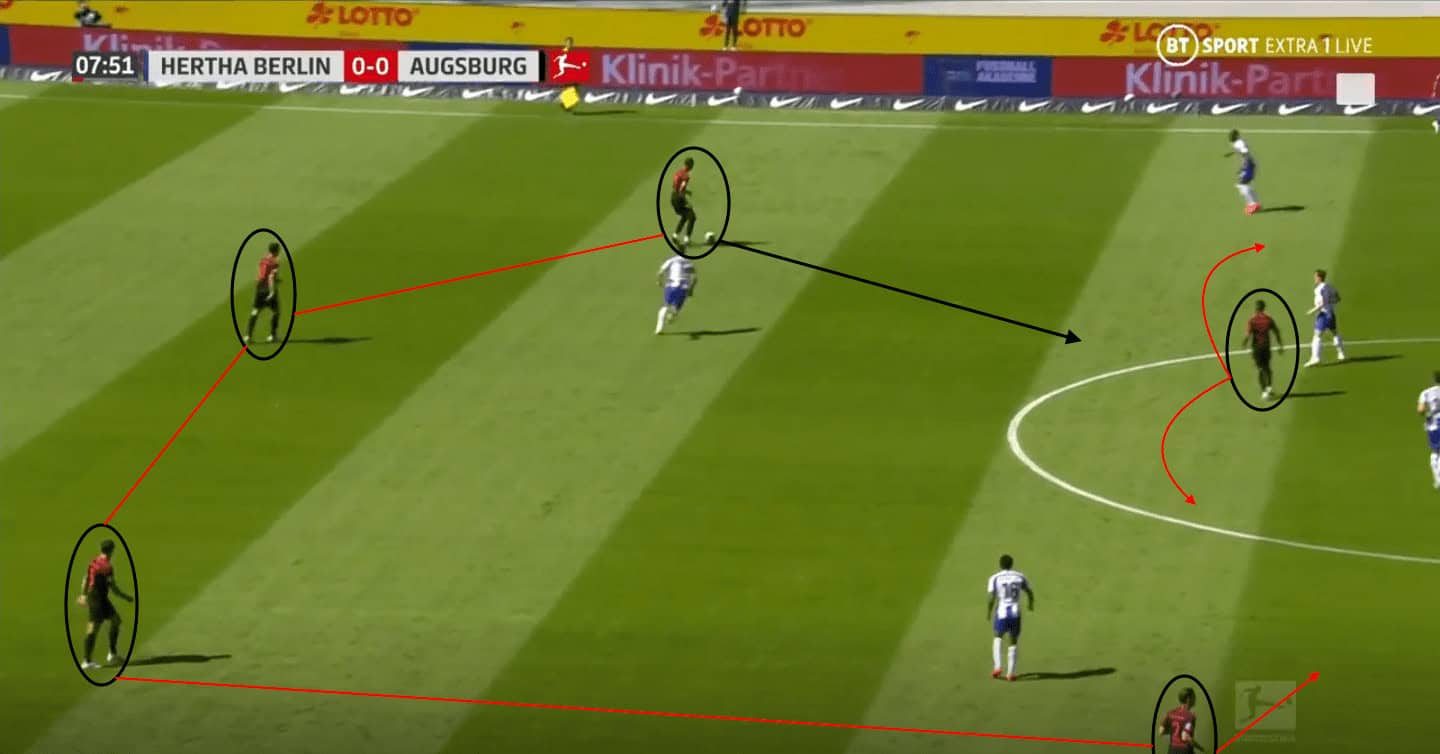 As Mittelstädt receives, this draws the Augsburg defensive unit out of shape, allowing Darida to make a run into the half-space, using the right side to dominate their build-up play once more.