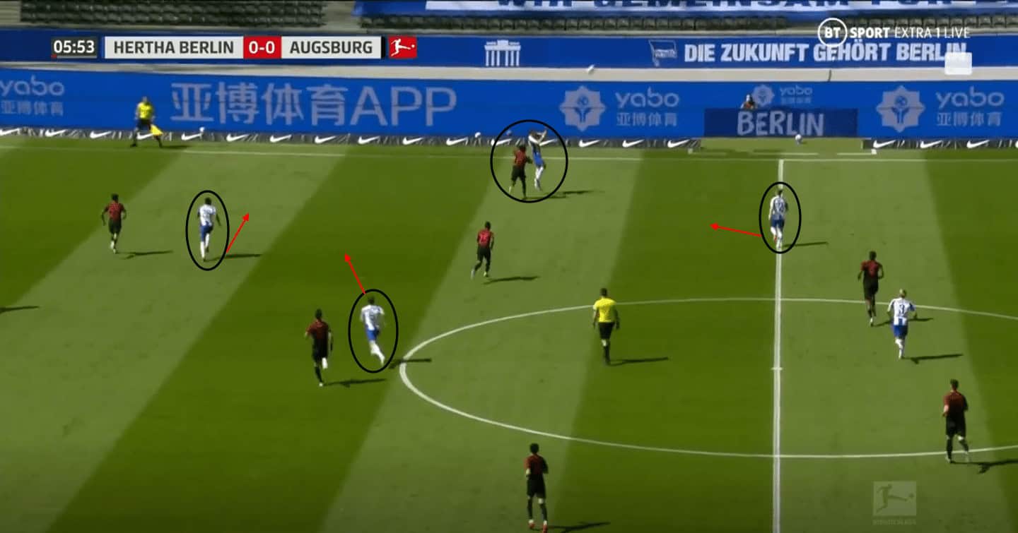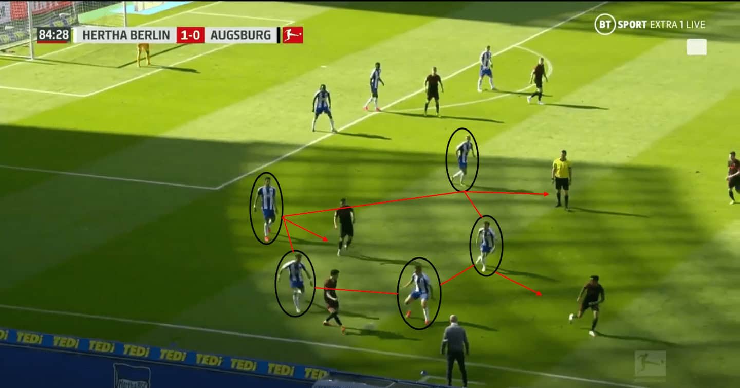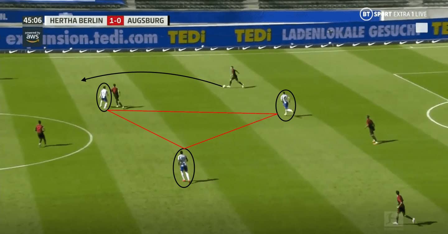 Hertha would prevent the Augsburg defenders in possession from switching play or playing through the centre with their triangle shape press covering the passing lanes and forcing Augsburg into long passes forwards.