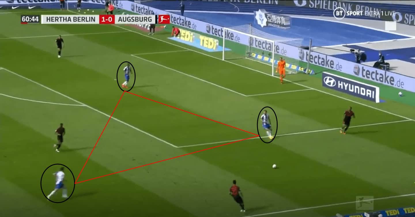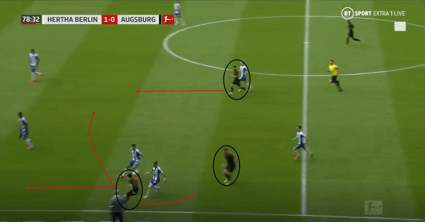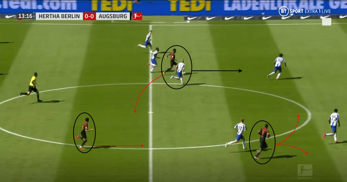 Hertha would prevent the Augsburg defenders in possession from switching play or playing through the centre with their triangle shape press covering the passing lanes and forcing Augsburg into long passes forwards.