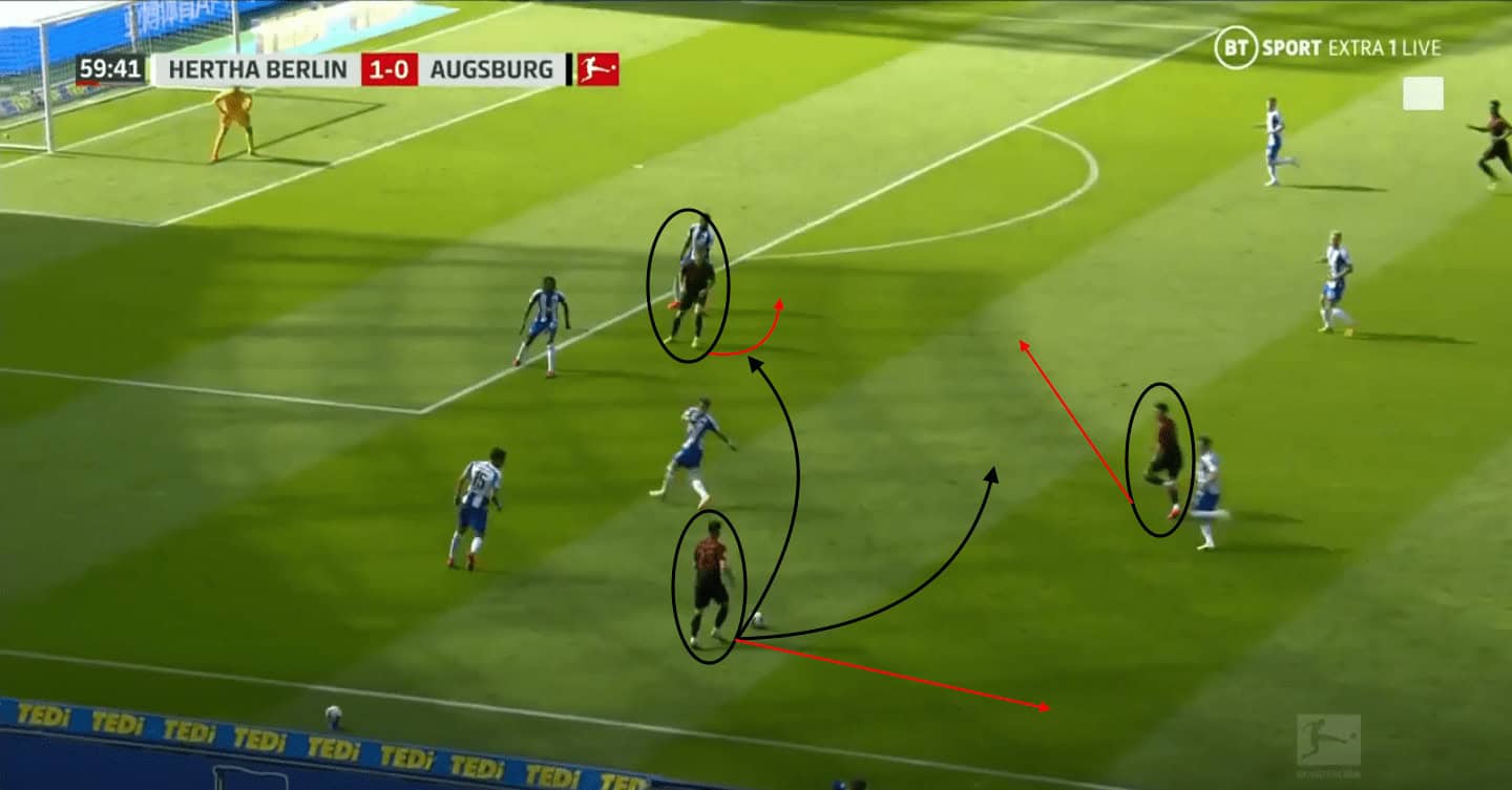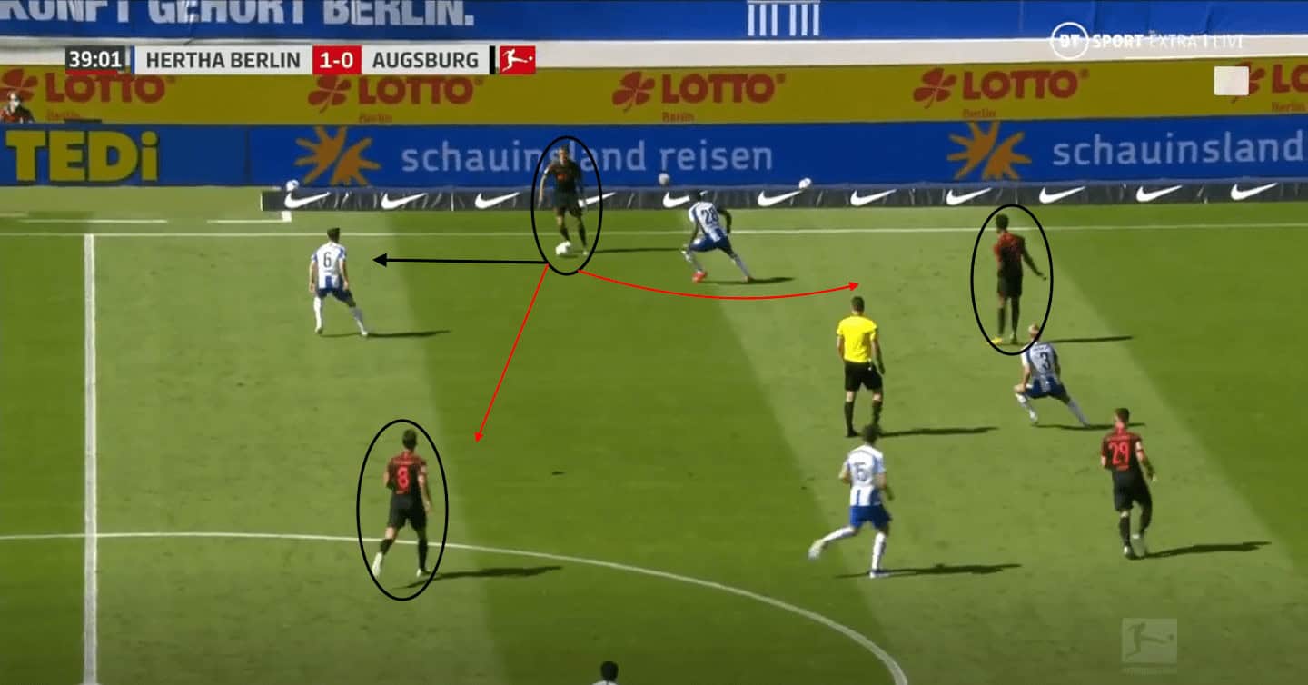 Uduokhai also has an option to play back to his defender counterpart, Suchy, who could then look to switch the ball to the wide right area due to Augsburg’s solid positioning in their defence. However, Uduokhai makes a poor decision to stay on the ball for too long, and Hertha are able to regain possession in a dangerous area.