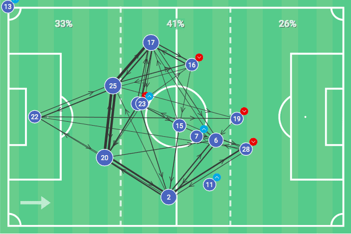 The below graphic provides us with a clear indication of Labbadia’s tactics when in possession, with 41% of Hertha’s play being in the middle third.