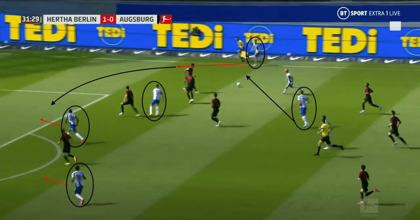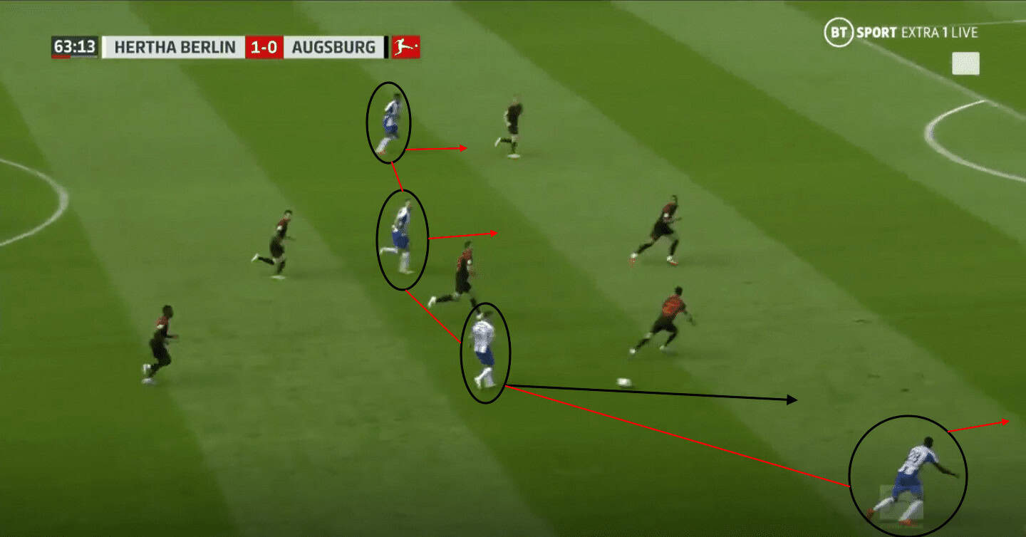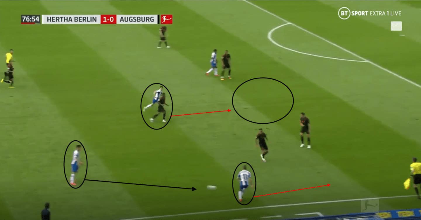 Lukébakio can be seen advancing into the half-space behind Grujic, which forces the Augsburg left central defender to follow, creating space for Darida to exploit. If Grujic couldn’t progress the ball forwards to Lukébakio or Darida, Pekarík was supporting from the front to provide Grujic with another option. This tactic to use and overload the wide areas to build the play forced Augsburg out of their narrow and compact defensive shape, creating space for Hertha to exploit further up the pitch.