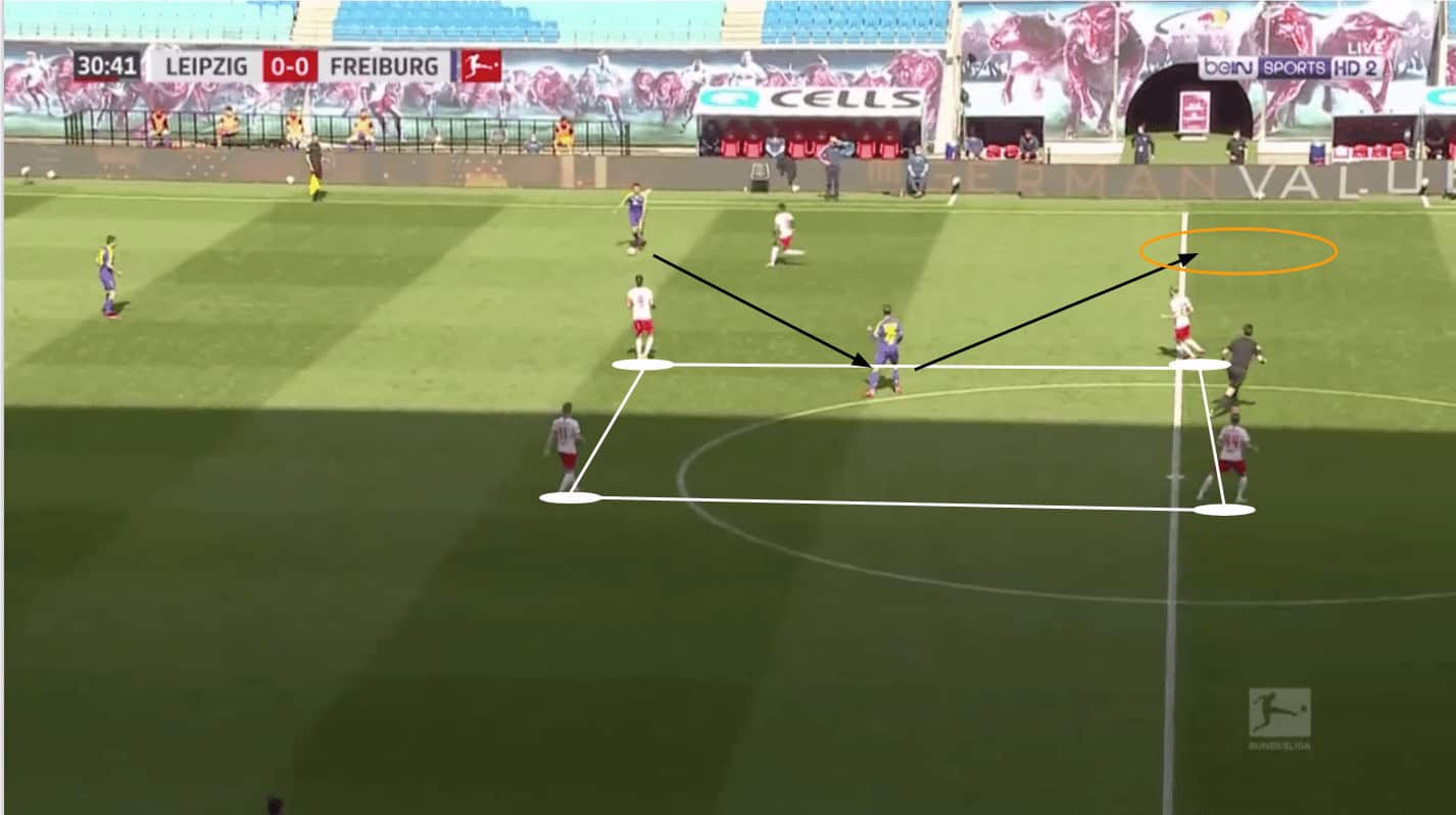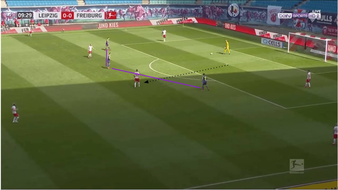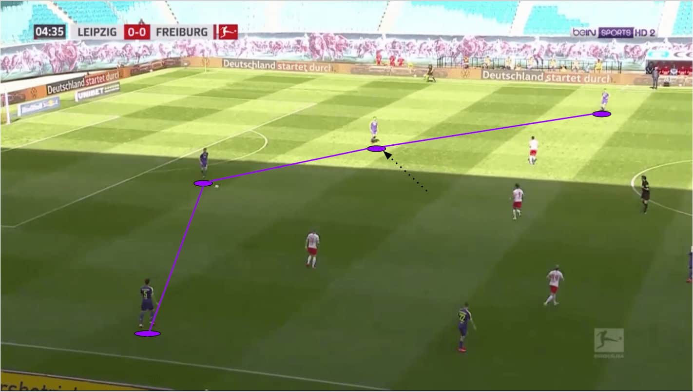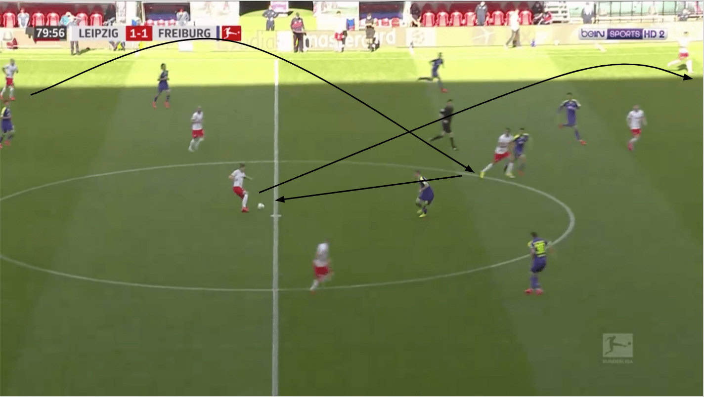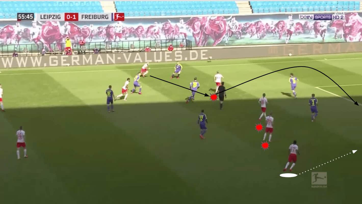 Klostermann would push up higher when Gulácsi had the ball at his feet. He and Konrad Laimer would position themselves in the space between Freiburg defenders. This positioning allows for multiple possibilities: it creates more room for the other two Leipzig centre-backs to receive the ball because those exterior wingers are less likely to press Halstenberg or Mukiele. If they did, they’d be allowing a central pass, which would likely have more immediate consequences. It also allowed Leipzig to more easily create numerical advantages on the wing at a quicker pace. When the ball went out wide, Freiburg would press, and Leipzig would quickly play through them by utilising their numerical advantage.