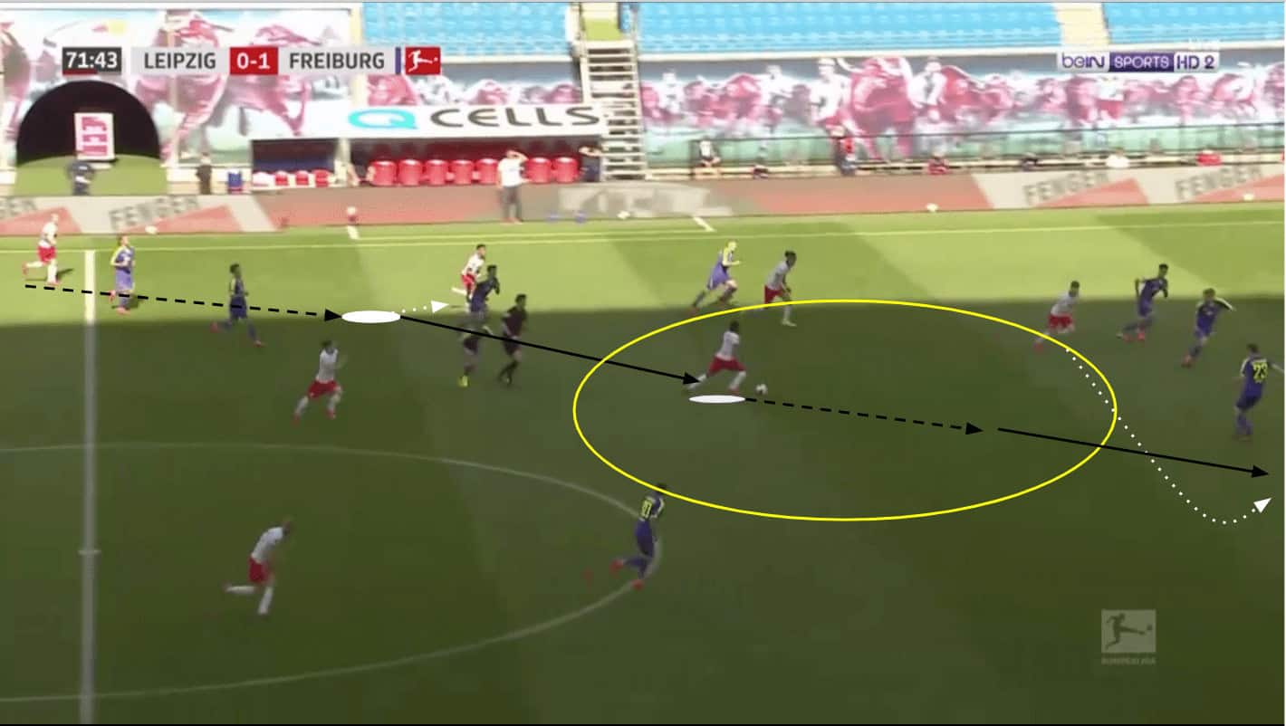 Nkunku dribbled and quickly found Ademola Lookman, who had come on for Mukiele. Lookman was intelligently positioned behind Freiburg’s midfield, and he was able to turn and dribble in space before slotting a pass to Werner, who pushed his shot just wide. These counter-attacks continued to occur throughout the match as Freiburg struggled to deal with the number of players Leipzig committed to the centre of the pitch.