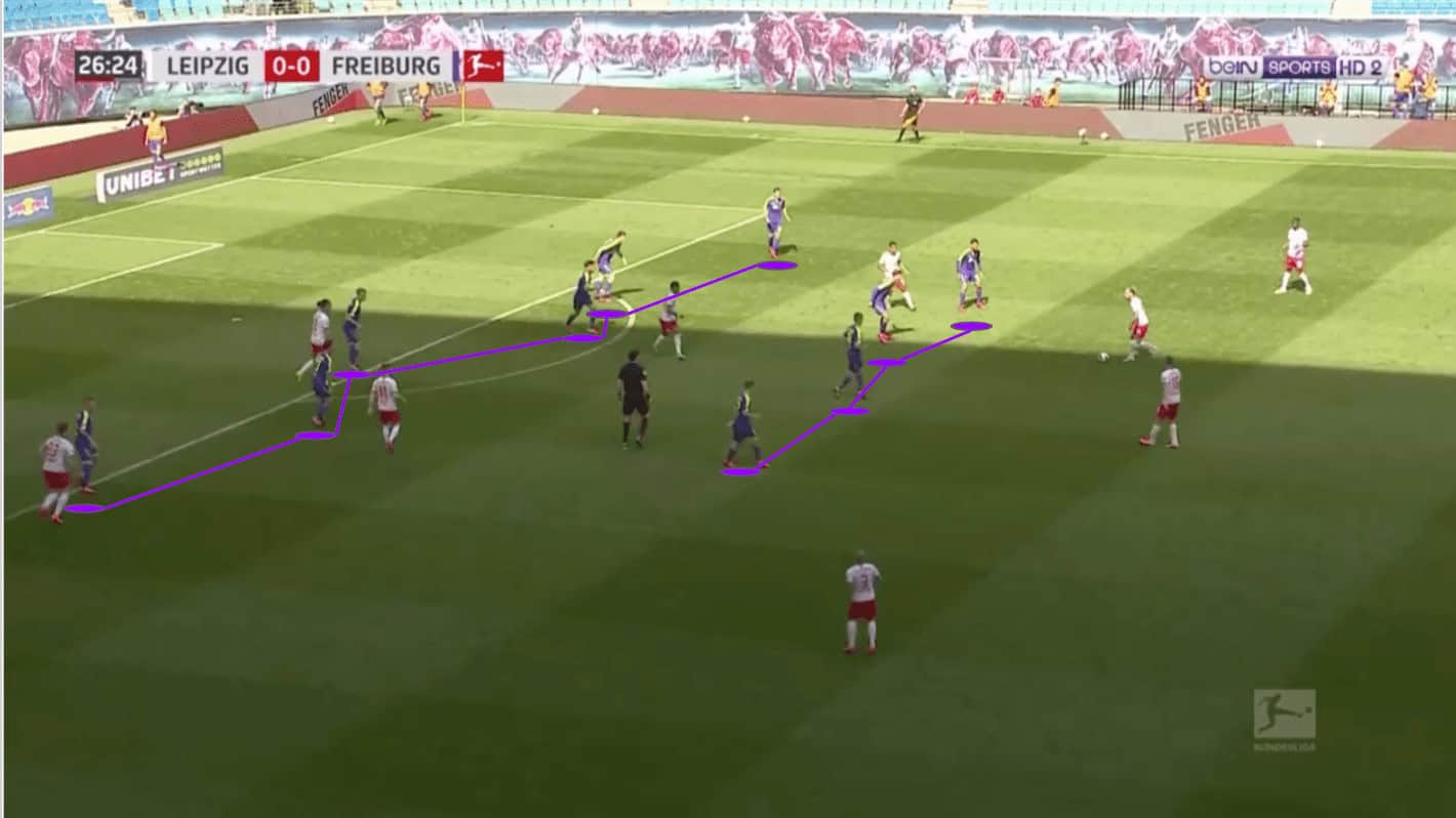 Koch would drop from his position in the midfield into the backline to create a makeshift back four. This allowed Freiburg to spread out more, spreading out RB Leipzig’s front three in the process. This would create more passing lanes for Freiburg to play into the centre of the pitch. However, they now only had two true central midfielders who could receive a pass, meaning they were outnumbered in midfield.