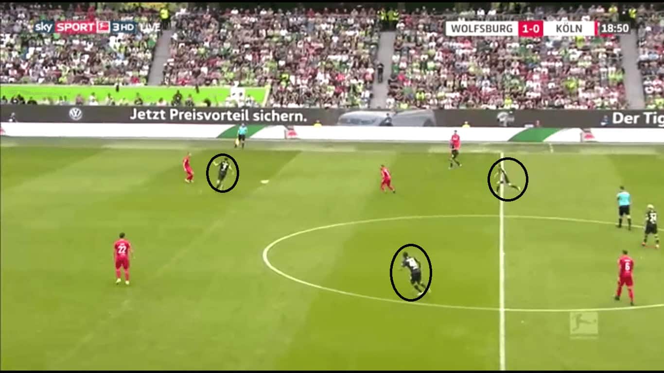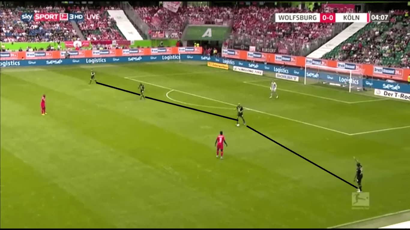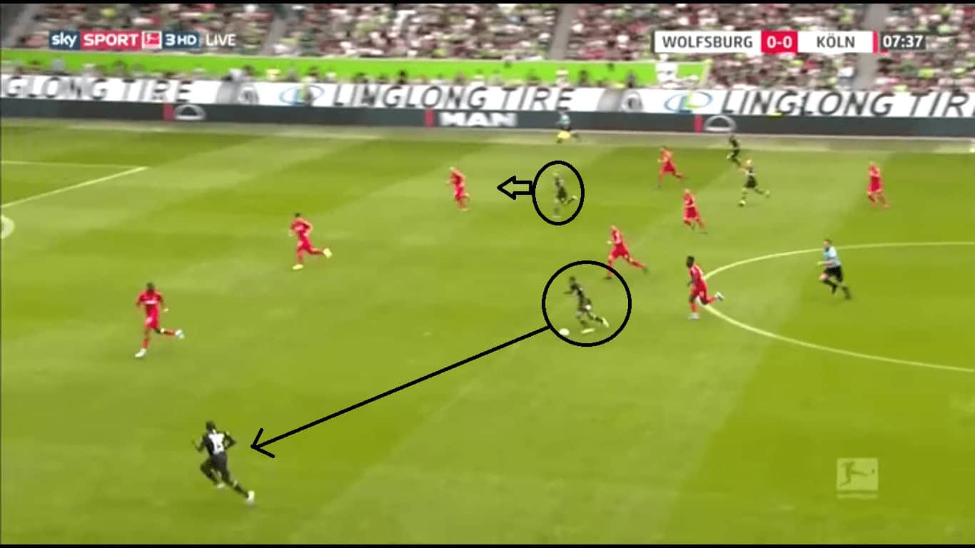 One of the most interesting aspects of this game was how Wolfsburg’s formation worked. It was far from a standard three-man defence. Guilavogui playing as the middle centre-back meant that Wolfsburg were able to transition from the defence to midfield very quickly. Guilavogui’s experience in midfield enabled him to venture further up the pitch as well as win duels while playing a high line. He was ably covered by Knoche and Brooks. This facilitated Wolfsburg’s high-press from defence to attack.