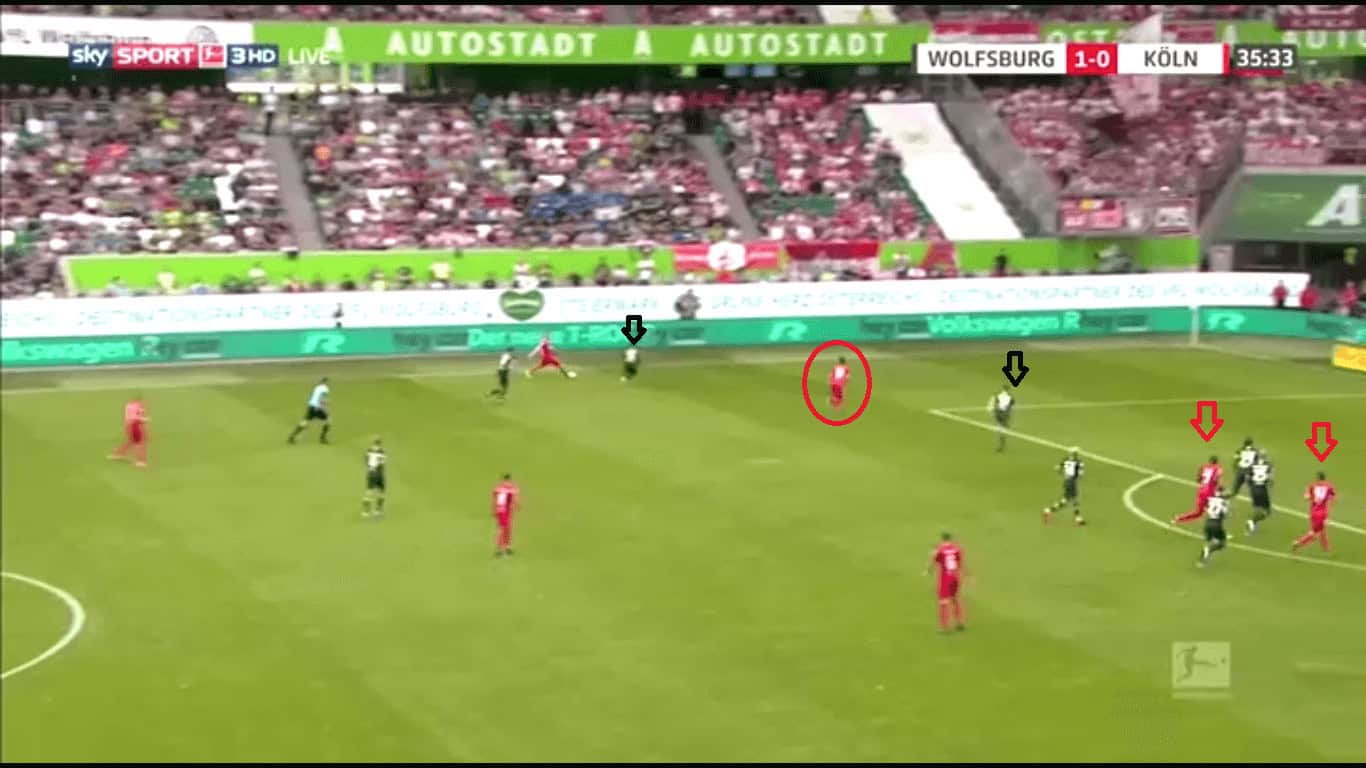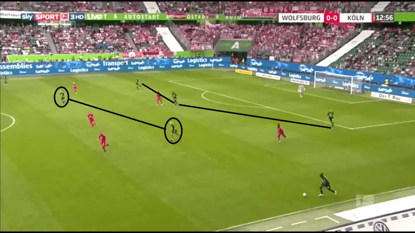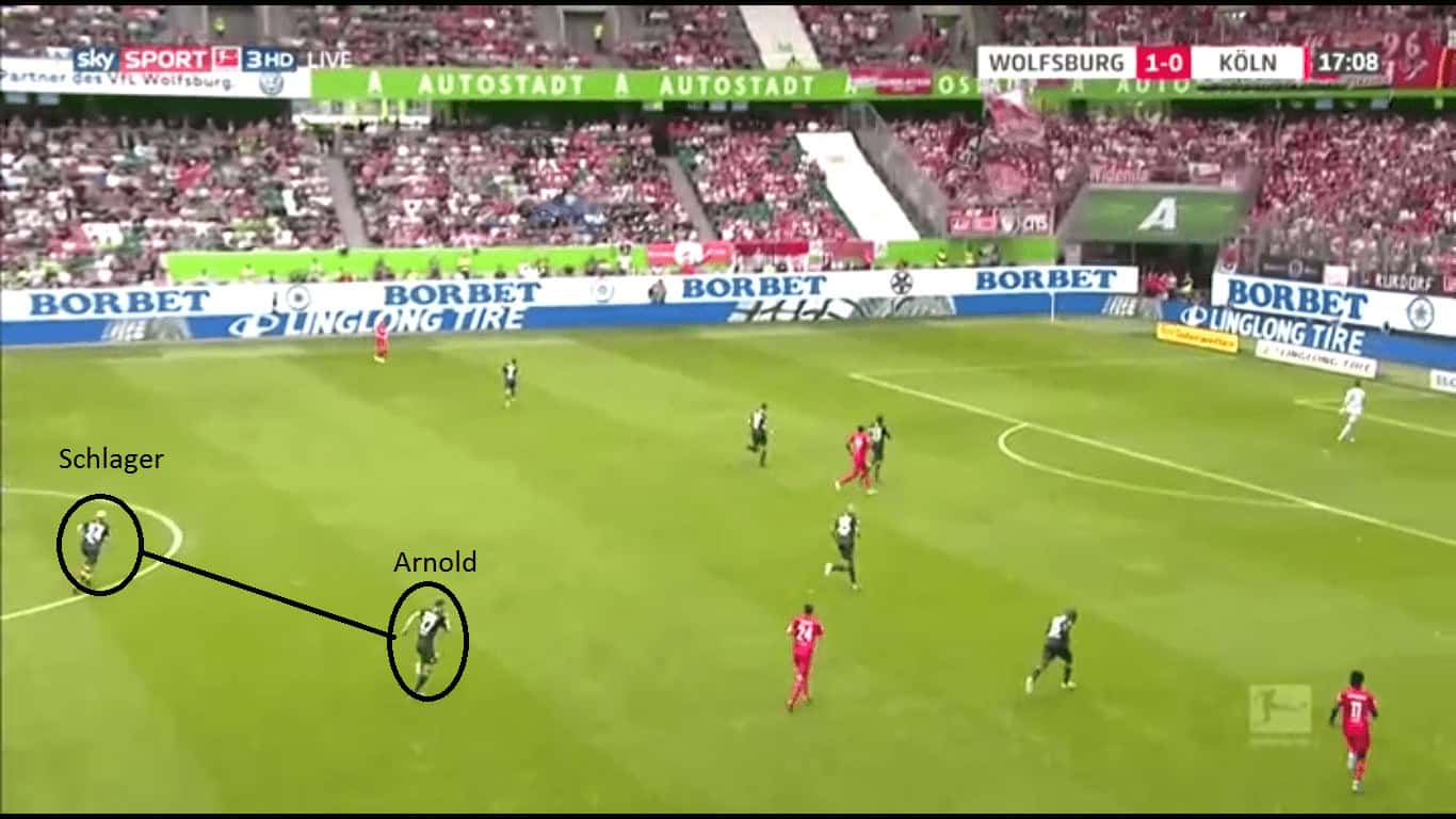 Wolfsburg got their combinations right all over the pitch. Another case of this was in midfield with Schlager and Arnold playing together. The all-action Schlager had a brilliant debut game for Wolfsburg as he covered every blade of grass. The Austrian made 39 passes recording an assist, made two dribbles, attempted three tackles and made two clearances. His teammate in Arnold scored a wonderful opening goal and made 52 passes. The duo were excellent together with Arnold’s calm passing and intelligent positioning perfectly complementing Schlager’s intense pressing. Arnold, especially, was important in winning the ball back if Köln managed to beat Wolfsburg’s press. His ball circulation to the wider areas was reliable as well.