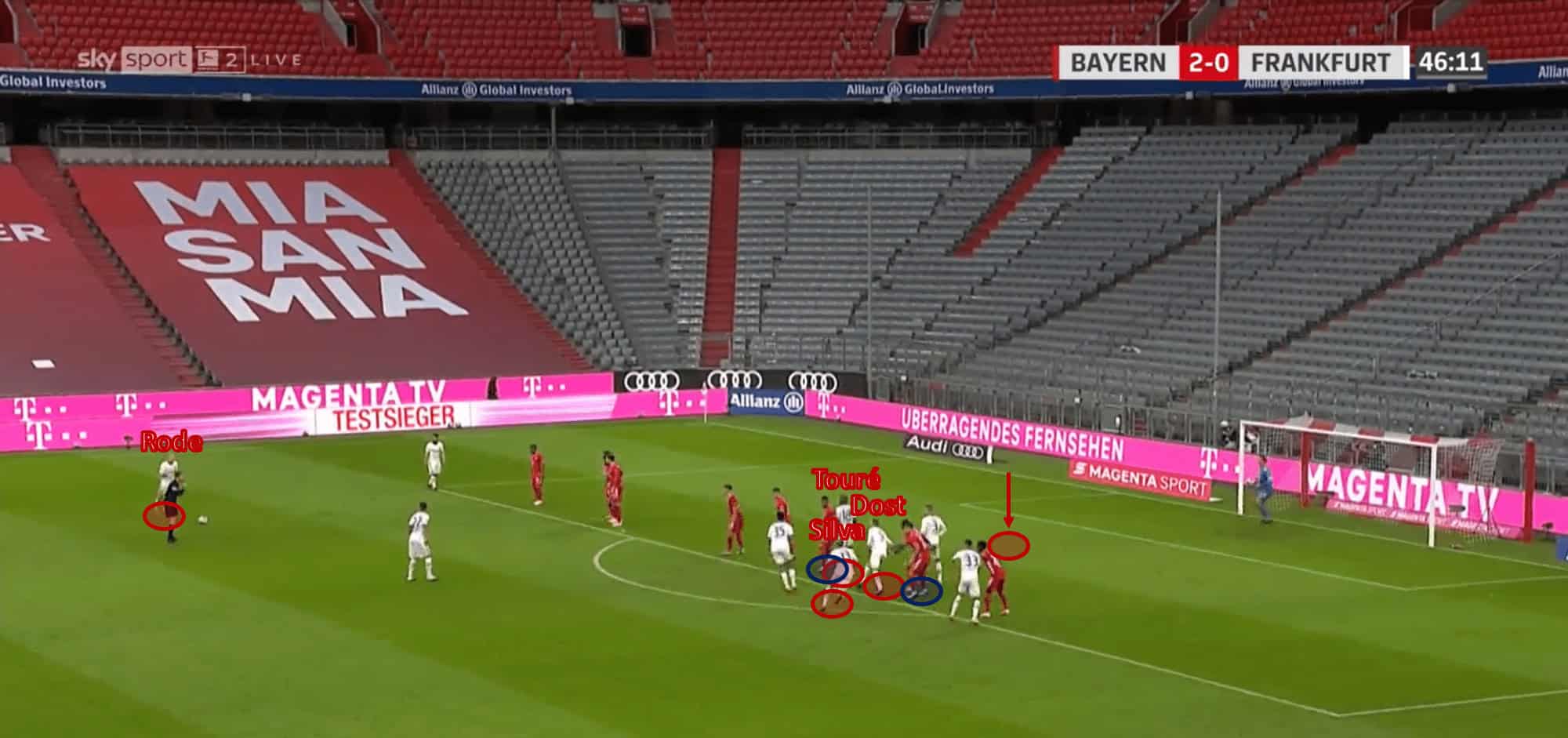 In the above analysis, we see Rode standing before a freekick opportunity. Marked is the intended destination of the ball. Silva and Dost look to distract the two highlighted Bayern defenders with their runs.