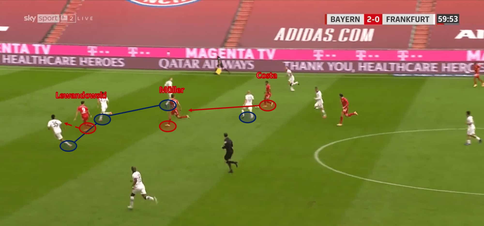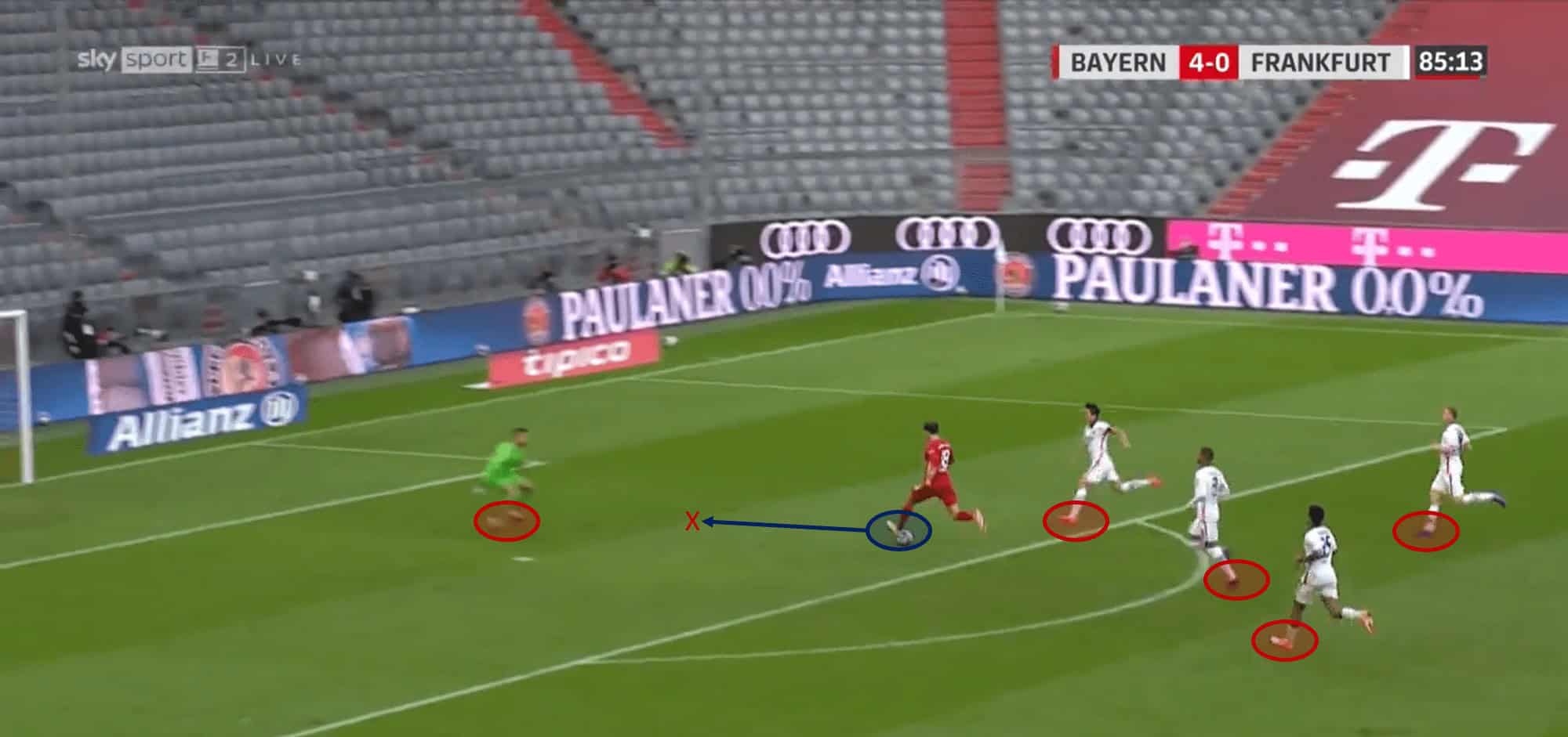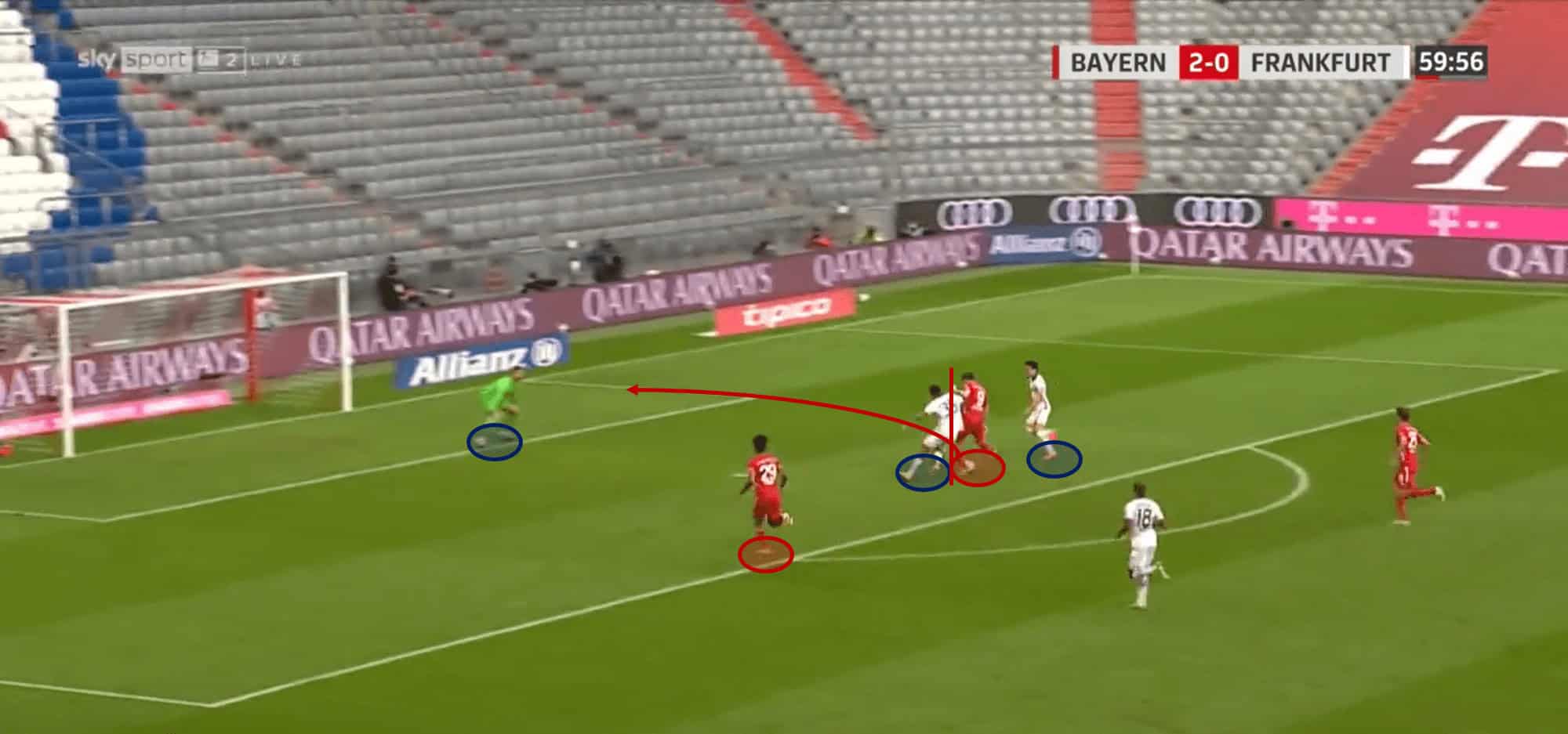 In this game, Frankfurt’s defence were constantly exploited for employing such a high press. A typical attacking scenario for Bayern would begin with them regaining possession in their defensive third and passing the ball back to Neuer in goal. From here, the keeper would play the long vertical ball into Bayern’s midfield territory, which would take out at least one layer of Frankfurt’s press in one pass. Owing to Flick’s setup, in these situations Bayern always had a player (often Goretzka from midfield) making bursting runs into the final-third to provide a shooting option.