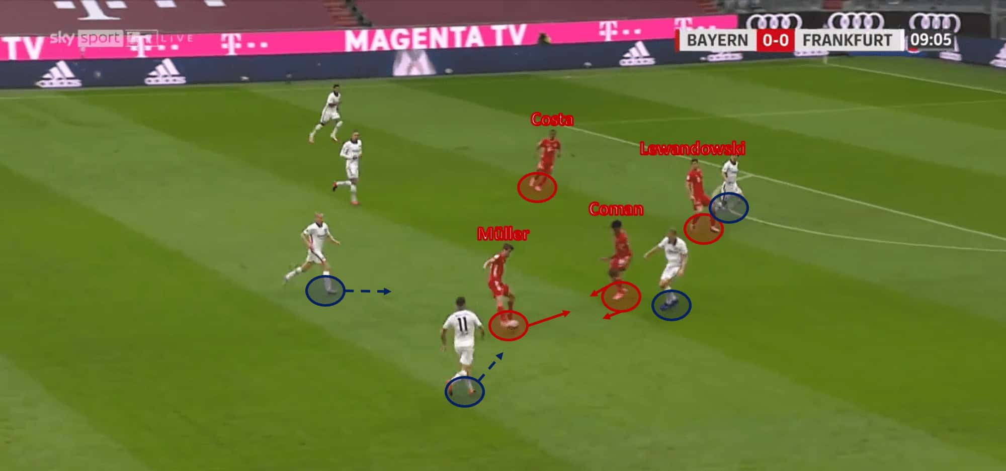 This band of attacking players was used to great effect in Bayern’s first goal. At least four Bayern attackers would move up the field at the same space, allowing for quick and smooth link-up play to occur and drag the Frankfurt defence into one area, only to send the ball in the opposite direction. Coman was especially vital in this regard against Frankfurt, linking up particularly well with Müller and using his strong dribbling ability to carry the ball into the final third. His pace and urgency were very effective against a side who typically press high, leaving plenty of space in behind to attack.