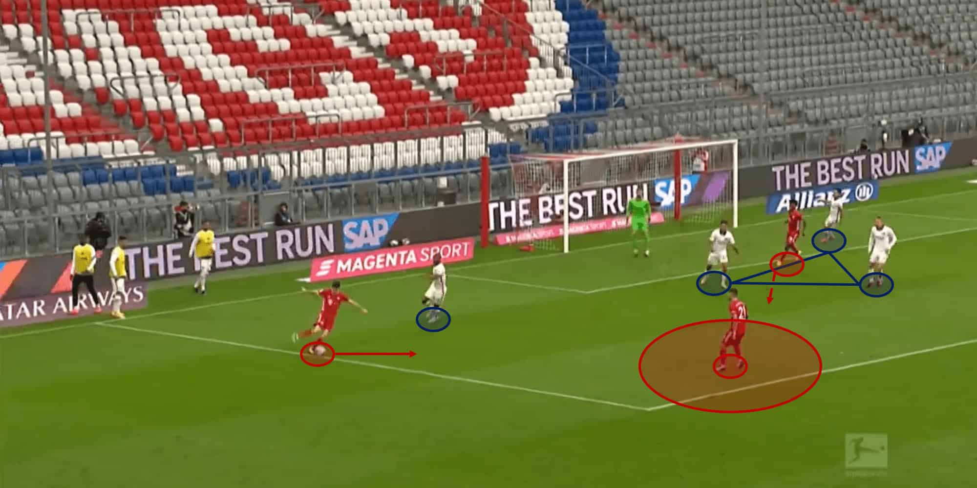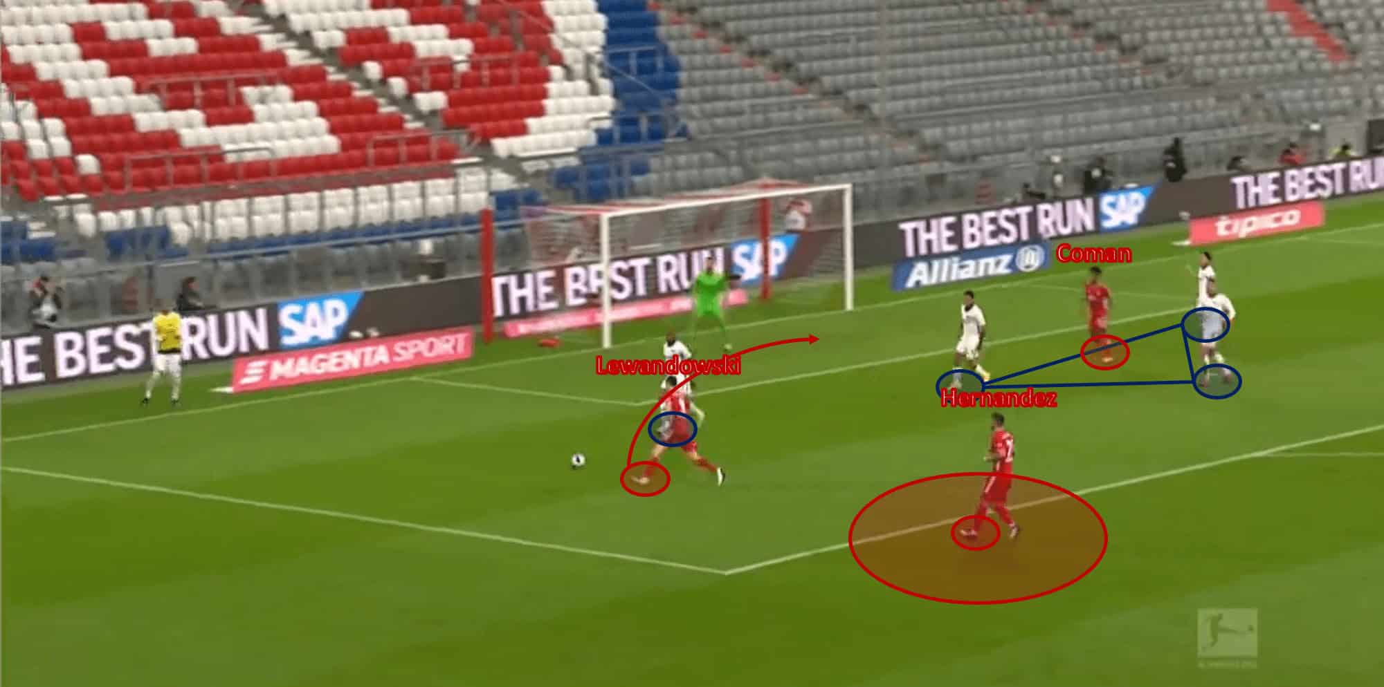 Coman takes the ball, runs towards the penalty area, with a few options he could explore. Müller continues to make the run down the half-space, but he ultimately opts to meet Lewandowski’s run, to assist the first goal.