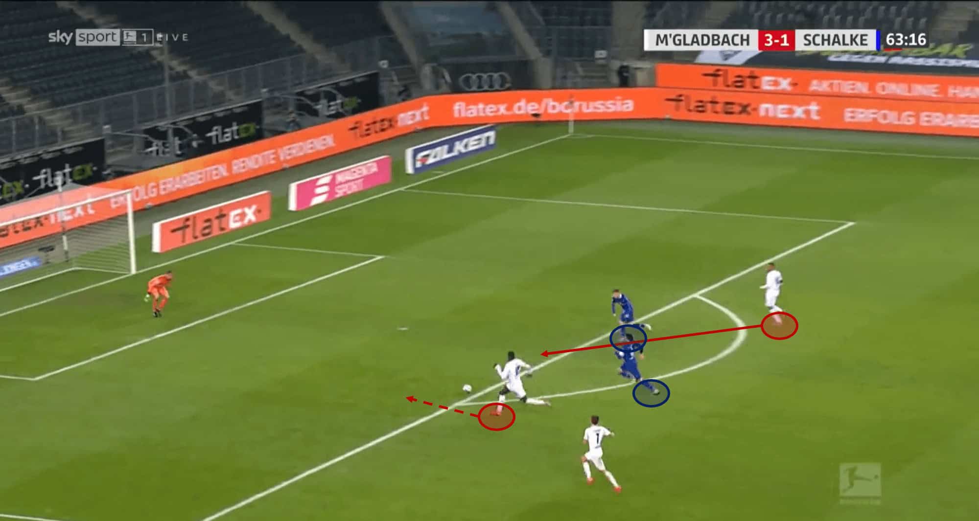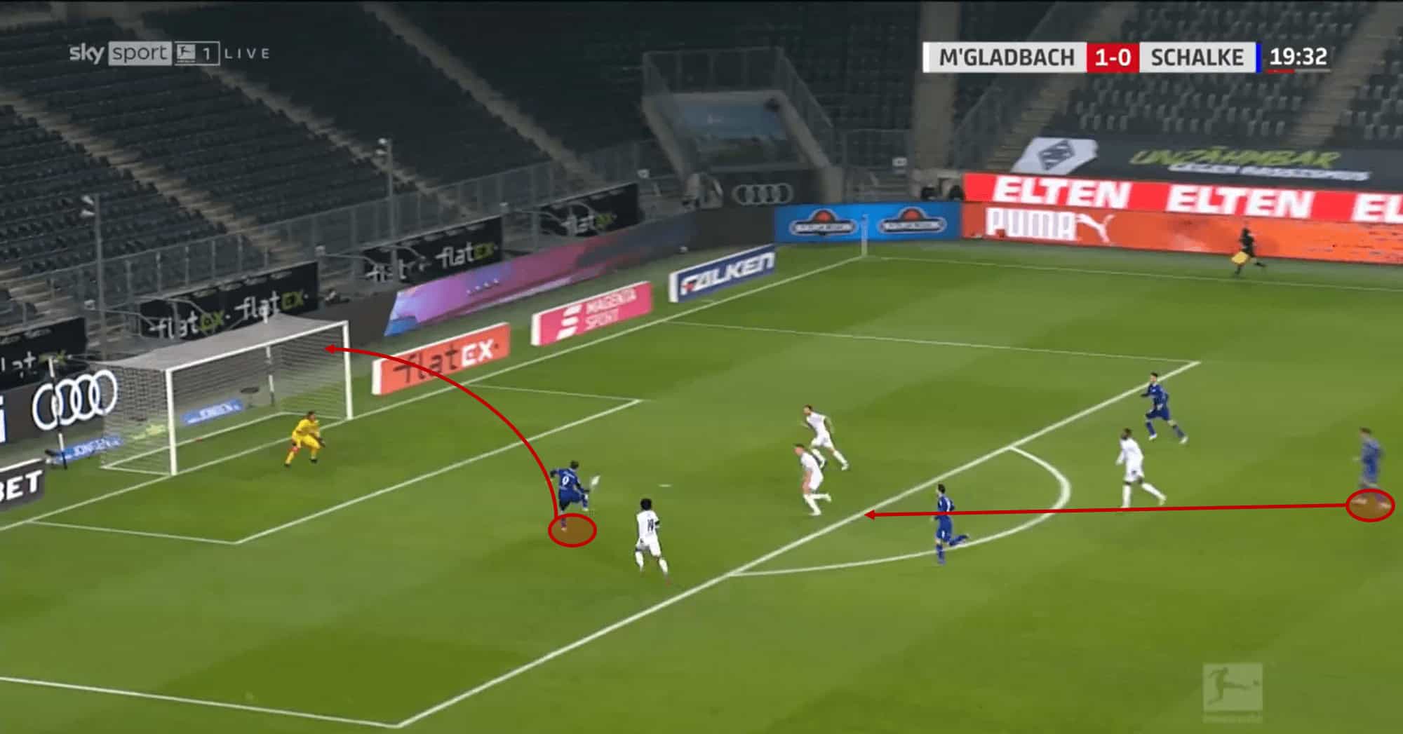 Their goal in this game was to drag one of Kabak or Nastasić out of the defensive line, to create space for the through ball into one of their fast attackers. In attacking transitions, Gladbach will typically have four players operating between the lines, which facilitates their short interchanges. In this game, this worked well, and they did not have to rely on their plan B too often, which would be to force their full-backs high and wide to provide width.