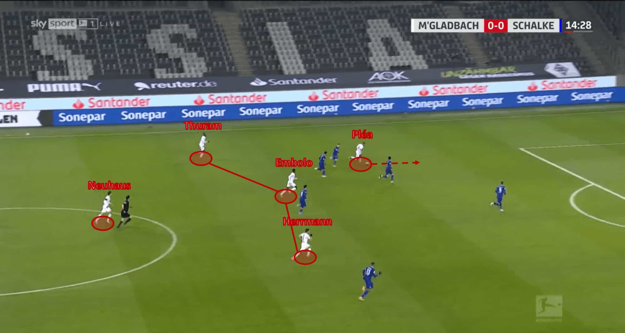 In an attacking transition, we see Gladbach’s forward line shape up with three men running behind Pléa and Neuhaus instigating the play with his long passing.