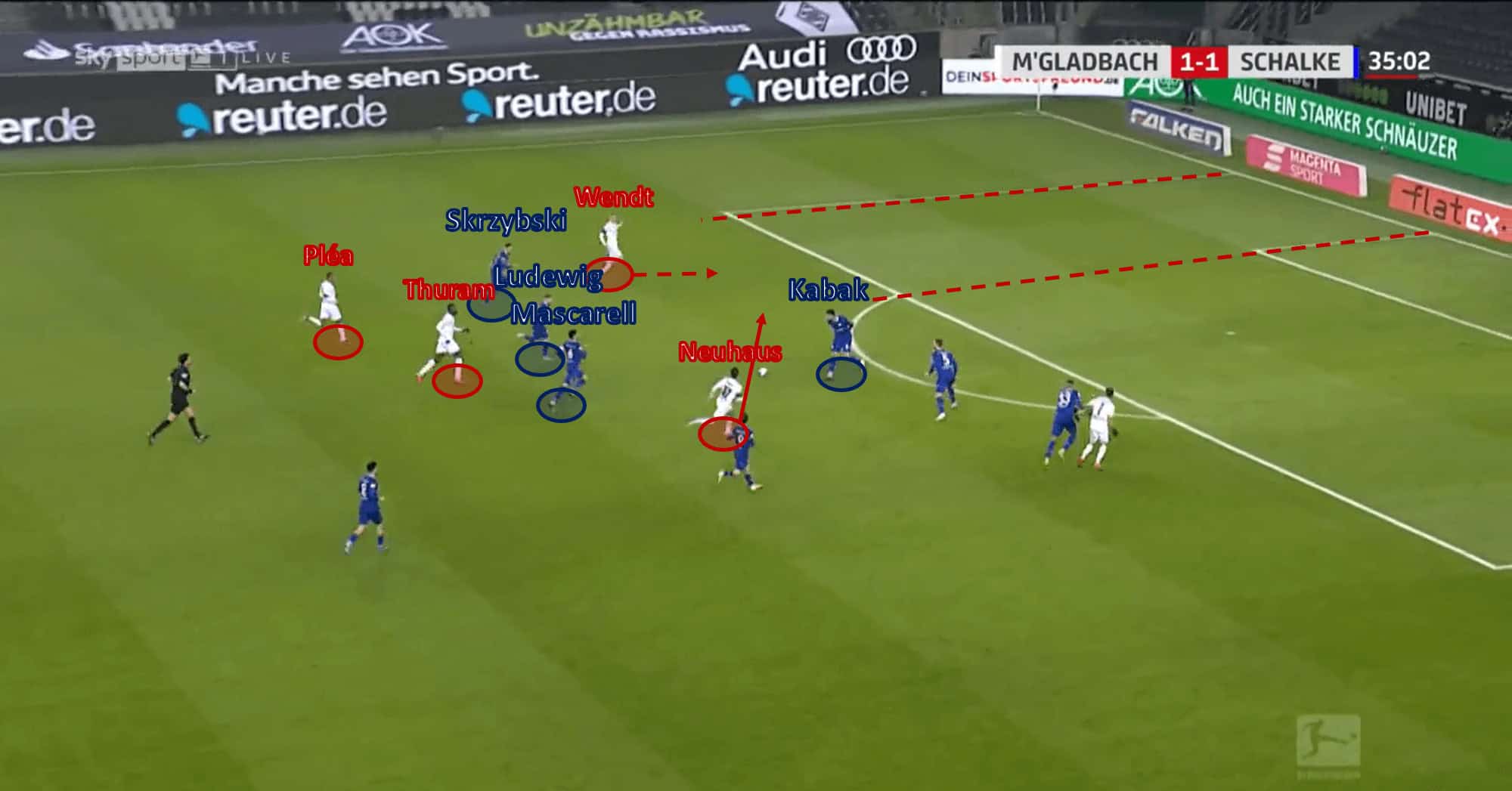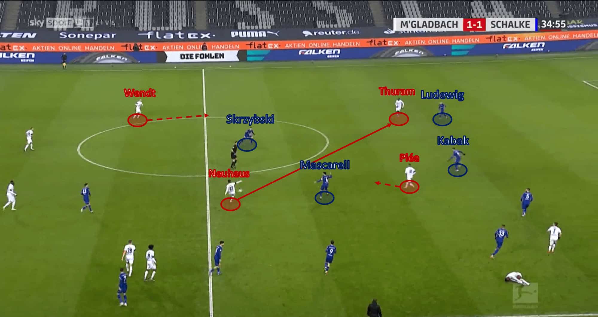 Schalke’s defenders have been dragged out of position by Pléa and Thuram to create space for Wendt, who is sent down the half-space by Neuhaus, which ends in a composed finish into the bottom left.