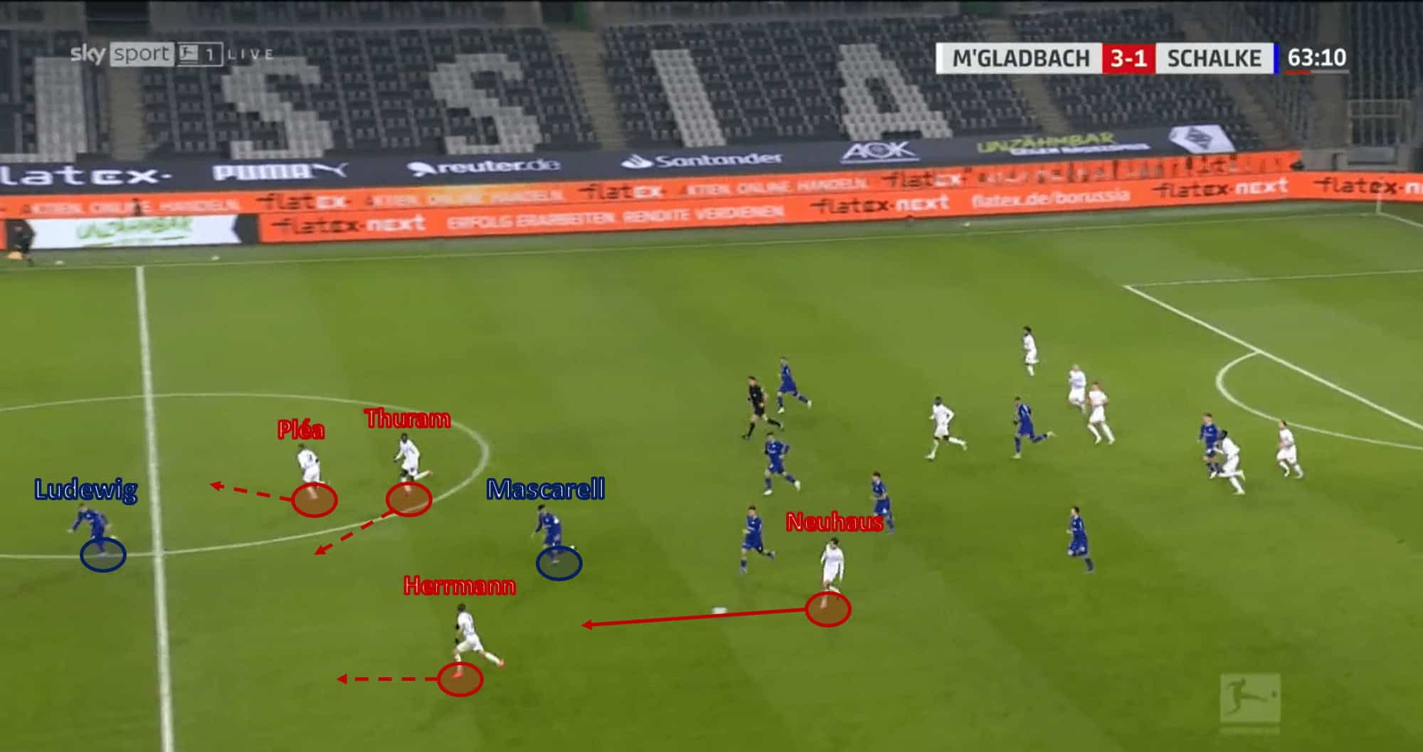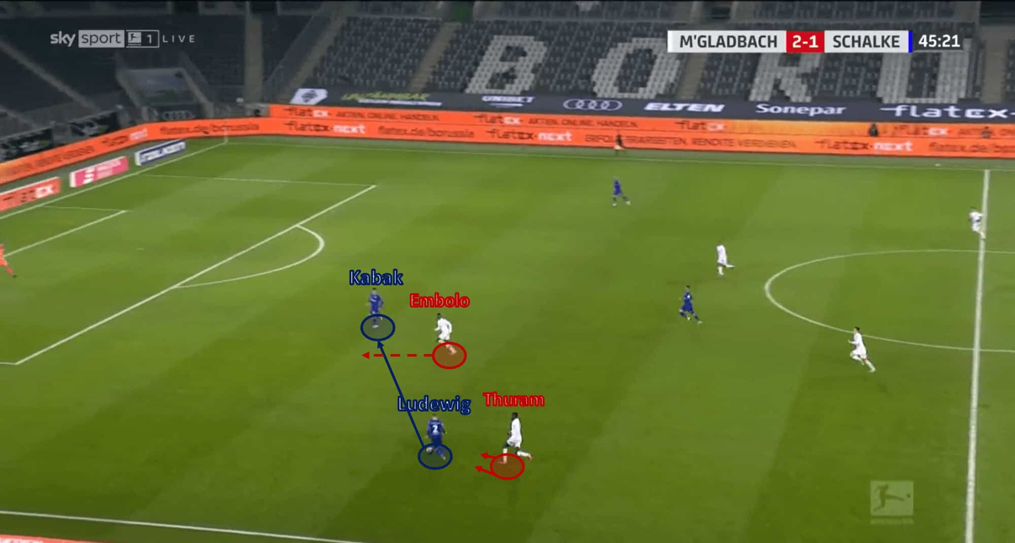 Gladbach hit Schalke on the break like this numerous times in the game, and they were able to create ample opportunities through doing so. Schalke struggled to contend with Gladbach’s speed of thought in these moments, with the interplay of Thuram, Pléa, Embolo, and Herrmann too fast for them. Individually, Schalke’s centre-backs are not bad players, nowhere near. Nevertheless, their decision-making and coordination in this game was quite bad, a game to forget for them both.