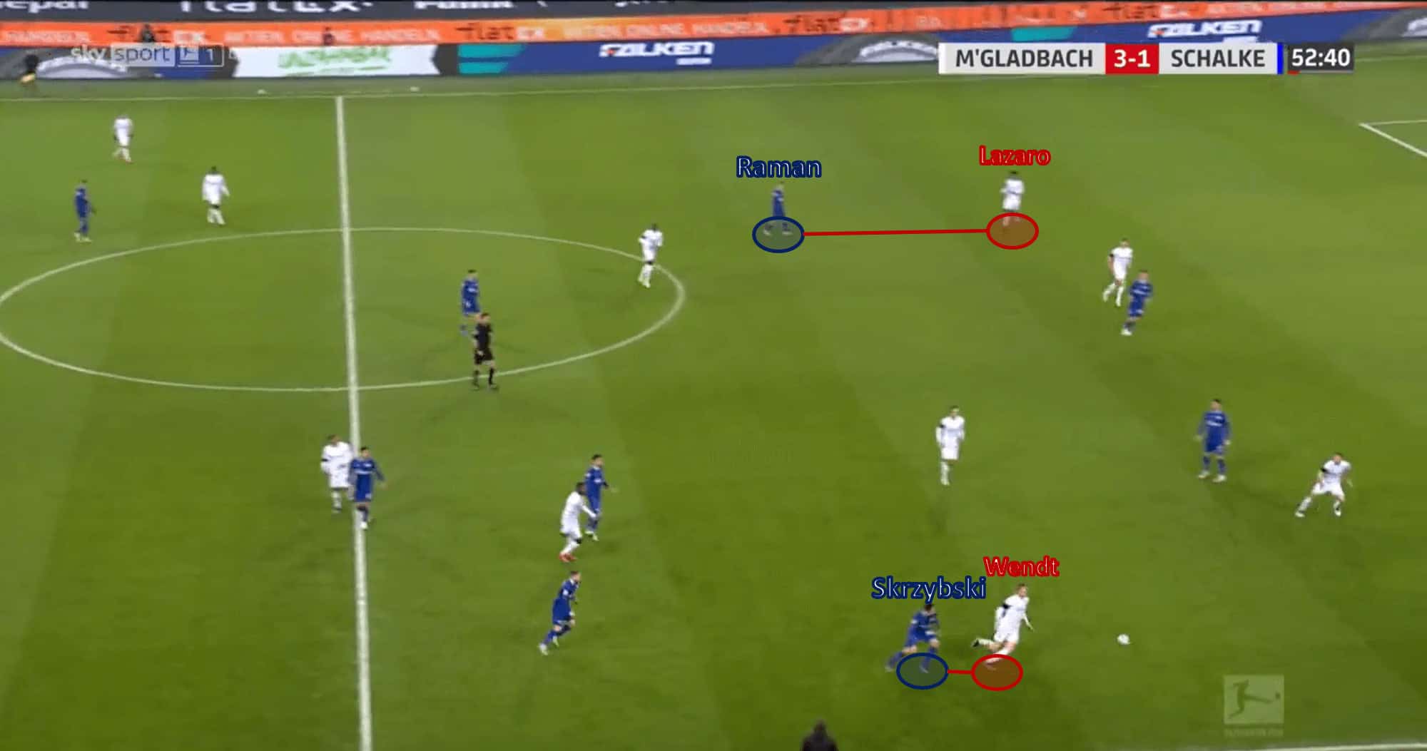 The only tweak to this tactical setup we saw in this game was through Lazaro dropping deeper than his full-back counterpart Wendt. This was largely to counteract Raman on the left wing. Due to Raman’s typically preferred role of centre-forward, he pushed high up the pitch, and in Gladbach’s man-oriented pressing system, this pushed Lazaro back further than he might have liked.