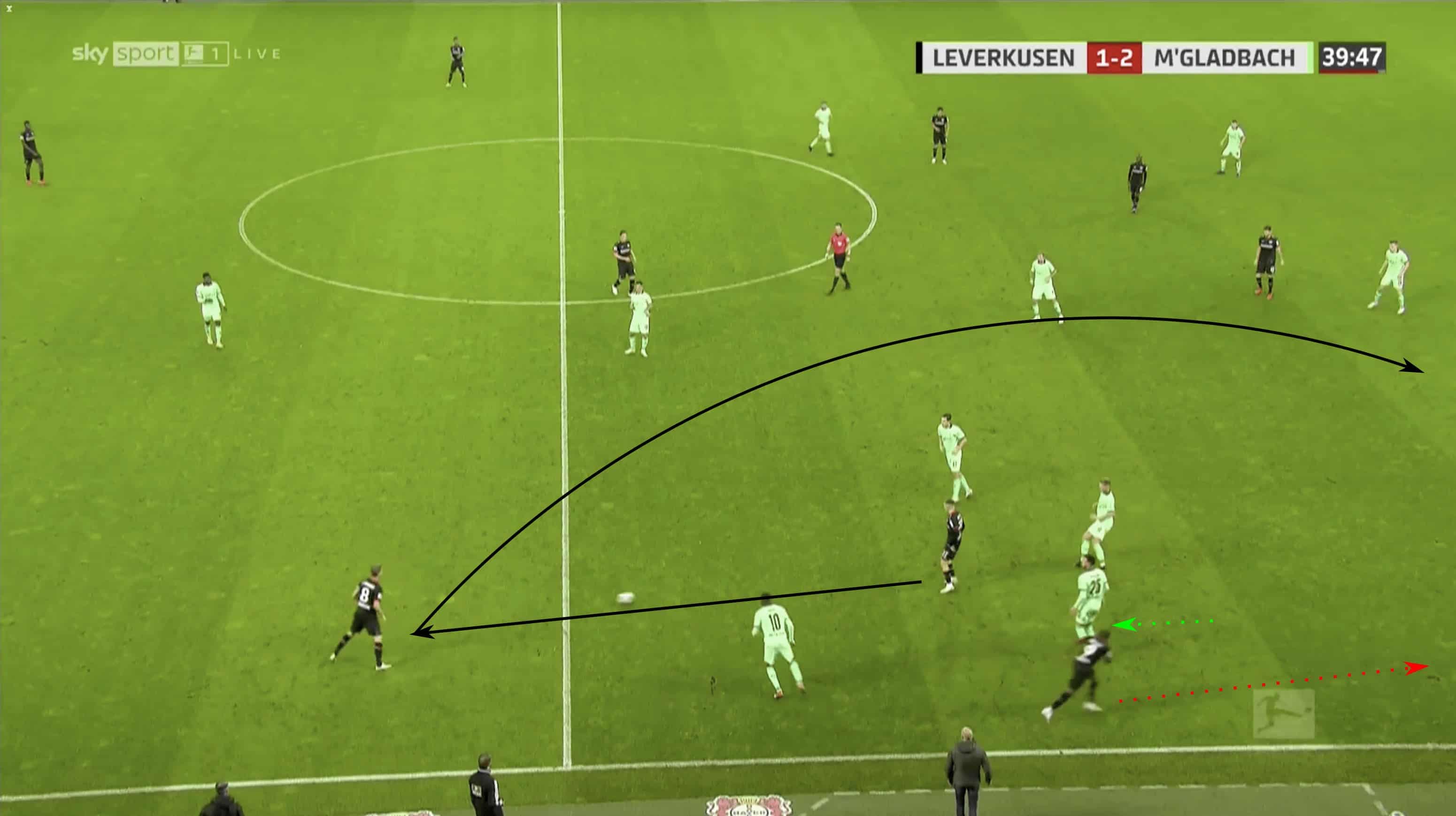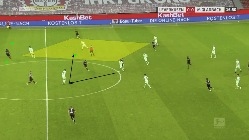 Bayer Leverkusen had most of the possession in this match with a total of 59%. They used the possession to try and move Gladbach’s defence and exploit available space. They were most effective in doing so when attacking down the right flank, focusing on the left side of Gladbach’s defence. The majority of the time, they looked to get players (mainly Ramy Bensebaini) out of position to exploit that space.