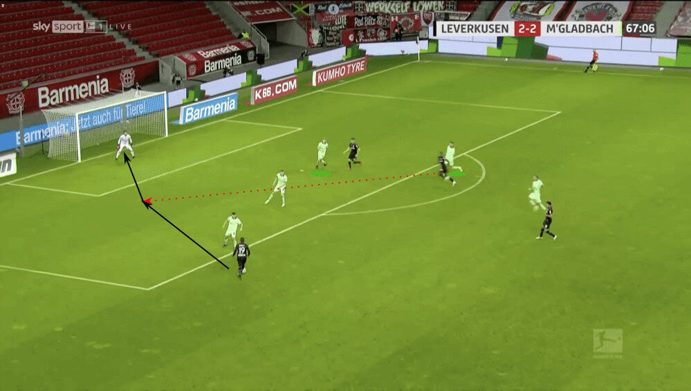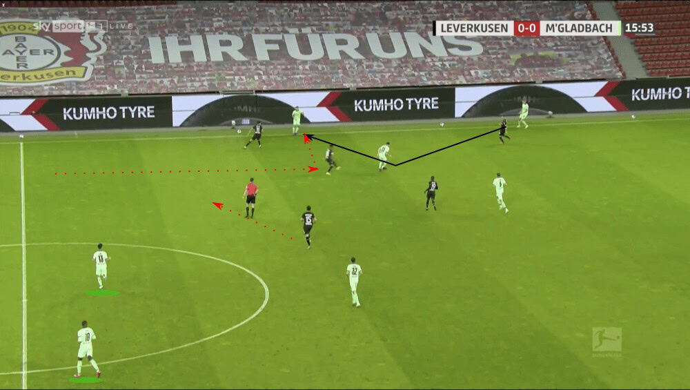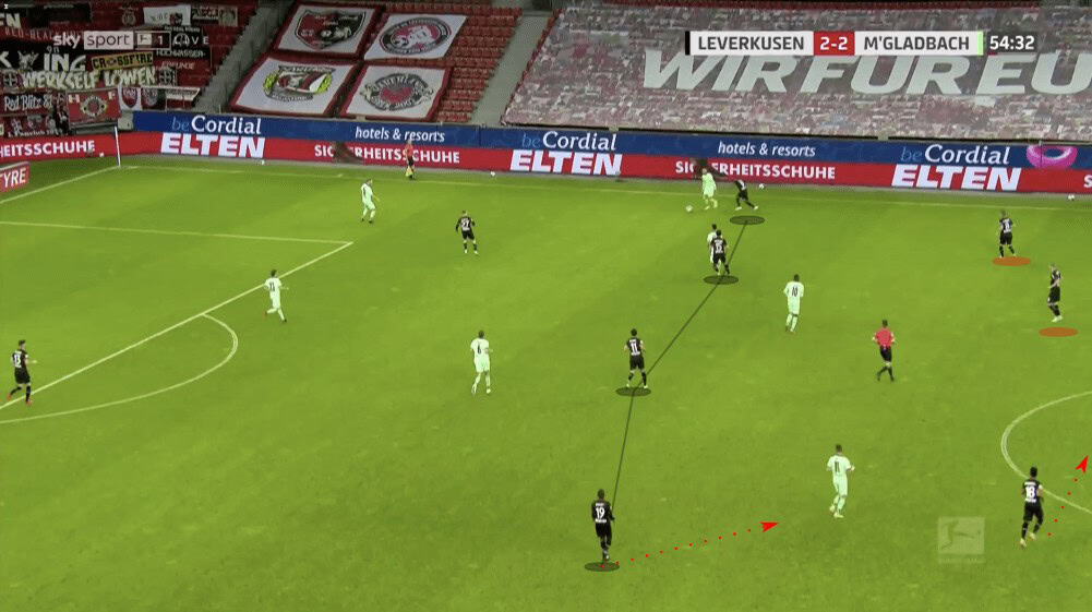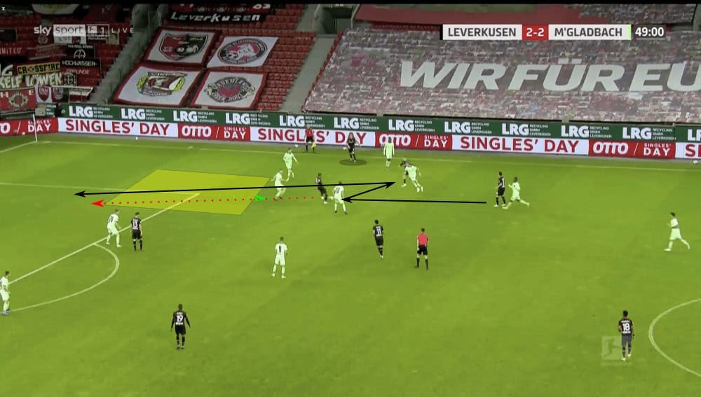 The two men in the half-space, Wirtz and Bailey, combined after Bailey had received the pass from Baumgartlinger. Bender quickly stepped into play, which ‘pinned’ Bensebaini and kept him occupied. This meant that Elvedi was forced to pressure Bailey, opening up the space in behind him. Bailey used his speed after laying the ball off, and Leverkusen was suddenly able to deliver a back-cross from inside the high-assist area. All of this was made possible because the Leverkusen players were able to make room for themselves in the half-space to receive the ball, checking away from defenders and creating enough space to operate. While they weren’t able to score, it was clear that they were targeting both Bensebaini and Elvedi.