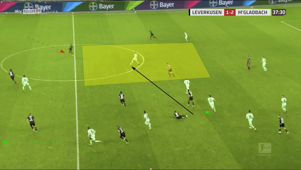 As a result of the Leverkusen press, Gladbach had to look elsewhere to create their chances. Their defensive structure and ability to find men in the centre of the pitch whilst regaining possession meant that they could still find chances to attack. Gladbach’s first goal came from their ability to find space in the centre of the pitch after winning the ball.