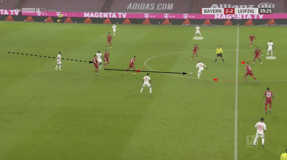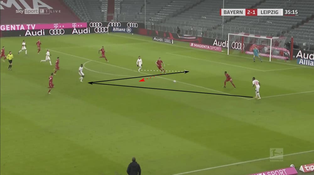 Leipzig’s second goal also came as a result of them attacking Bayern’s centre-backs, particularly with their speedier players. The controlled chaos that Leipzig builds can be overwhelming for defenders, causing them to make split-second decisions.