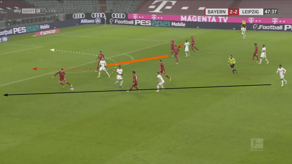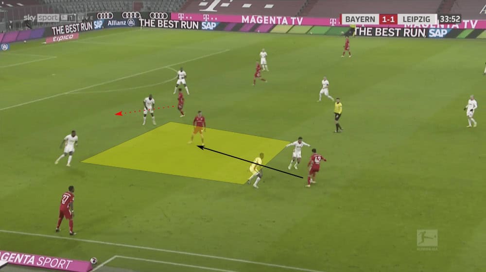 Because their vertical entry to these spaces was denied, Bayern was forced to try and find access to the half-space from the wing. Leipzig’s defensive structure worked for the most part, but the problem is that it’s difficult to prevent Bayern from accessing that space at all. And so Bayern’ first goal is a result of them accessing the half-space from their horizontal movement.