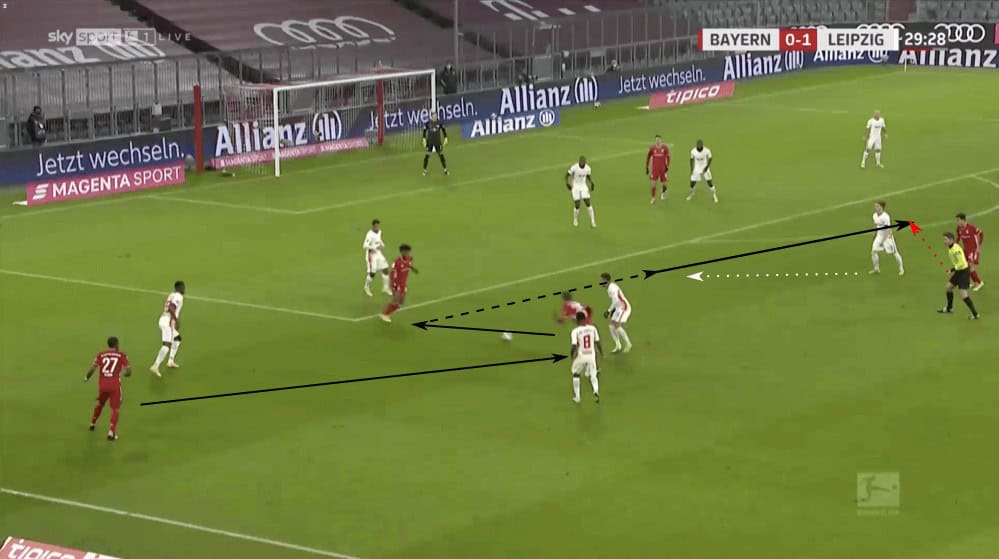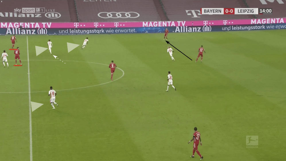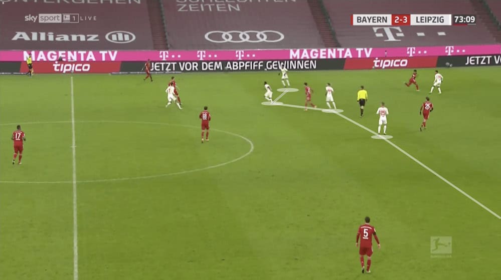Bayern’s consistent high line and high press makes them vulnerable at the back because they commit so many men forward to win the ball higher up the pitch. Leipzig looked to target this by using their wingers (Nkunku and Kluivert) to occupy the space between the Bayern centre-backs and their corresponding outside-backs. This positioning, combined with Forsberg dropping down off of Süle and Boateng allowed Leipzig to get in behind.
