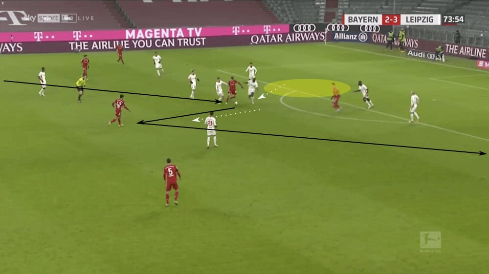 On Bayern’s final goal, the initial pass into Müller came from Süle, who was positioned much wider than normal. This was a direct result of Leipzig’s defensive setup. Süle’s pass came from the edge of the wing and was played before Leipzig had an opportunity to completely slide over and prevent access to the centre of the pitch.