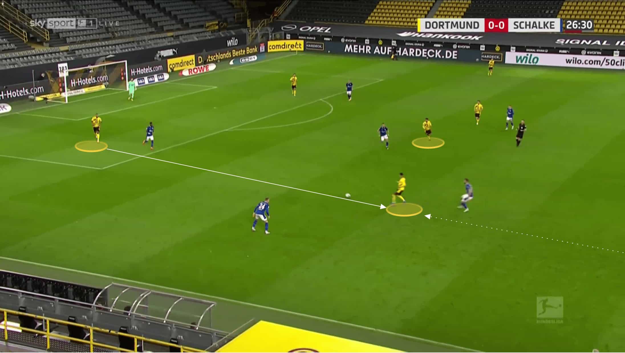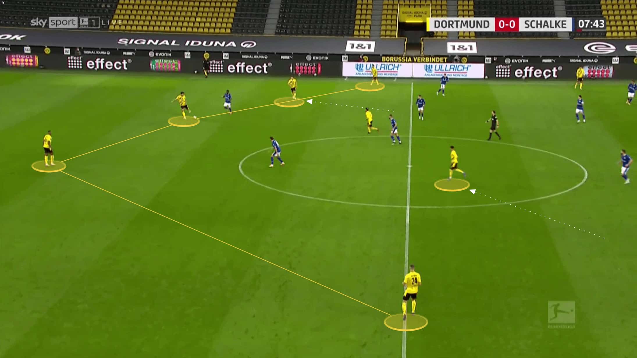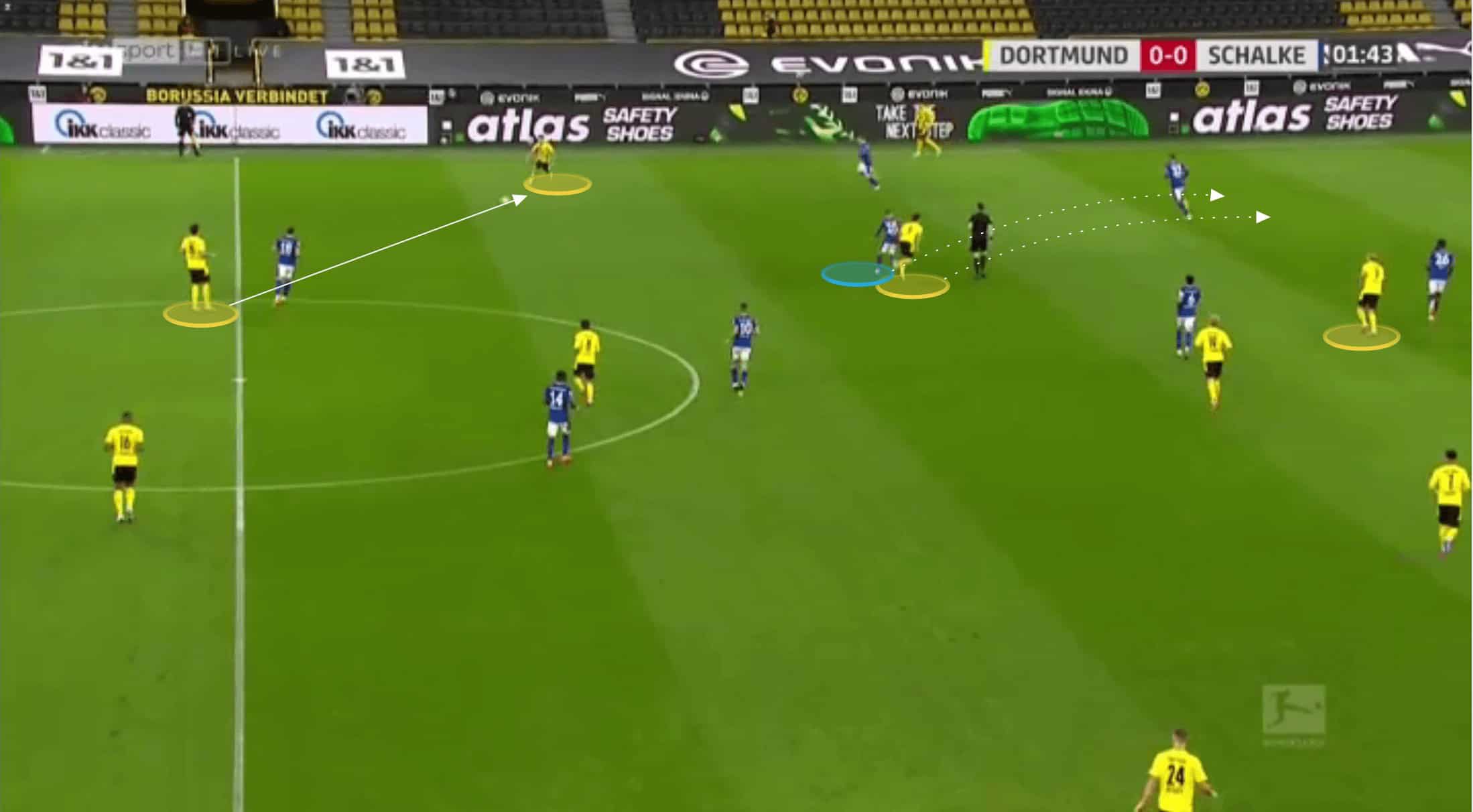 Sancho again would drop into the midfield area where he could receive directly in the half-space with Dahoud immediately inside.