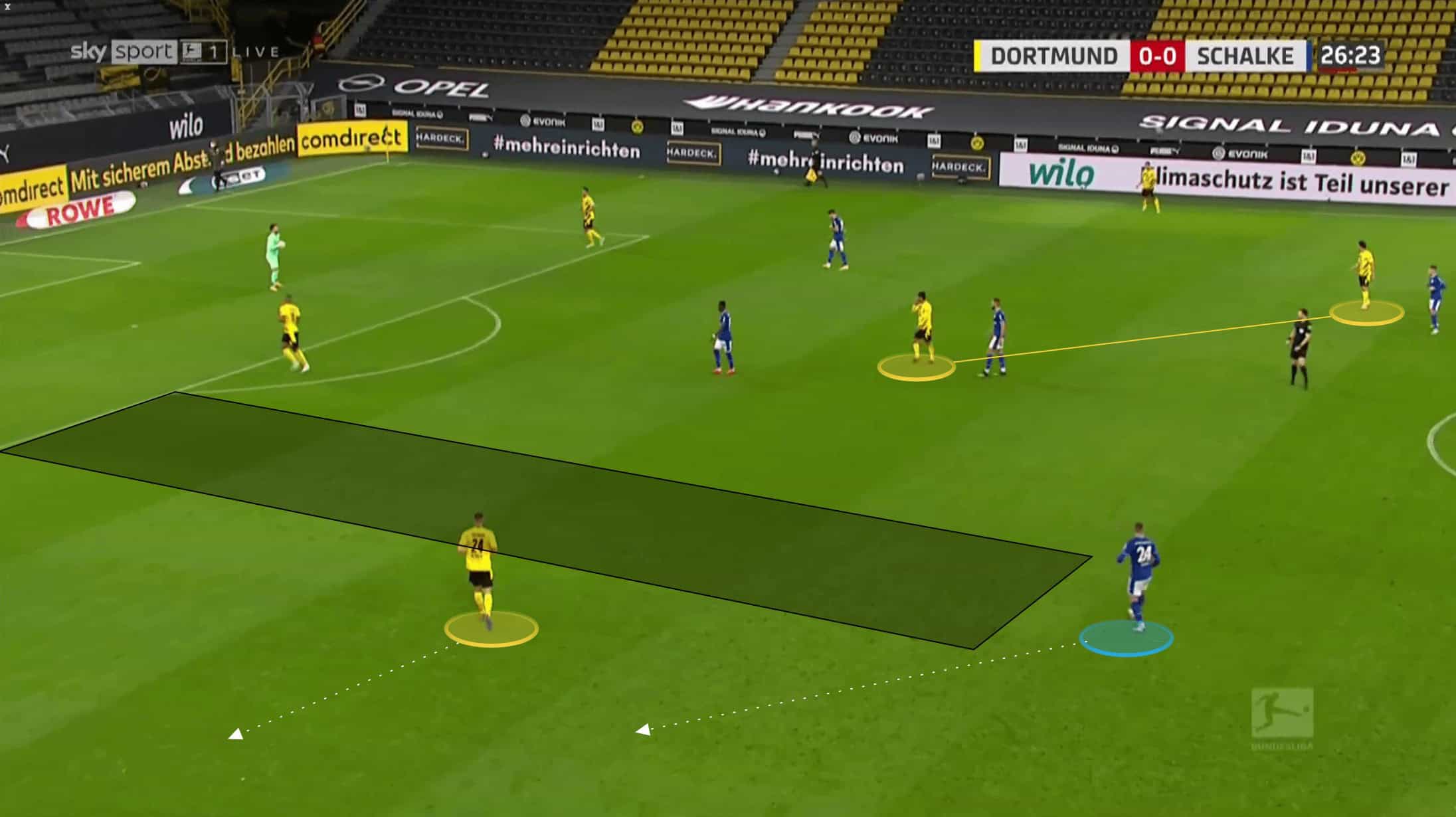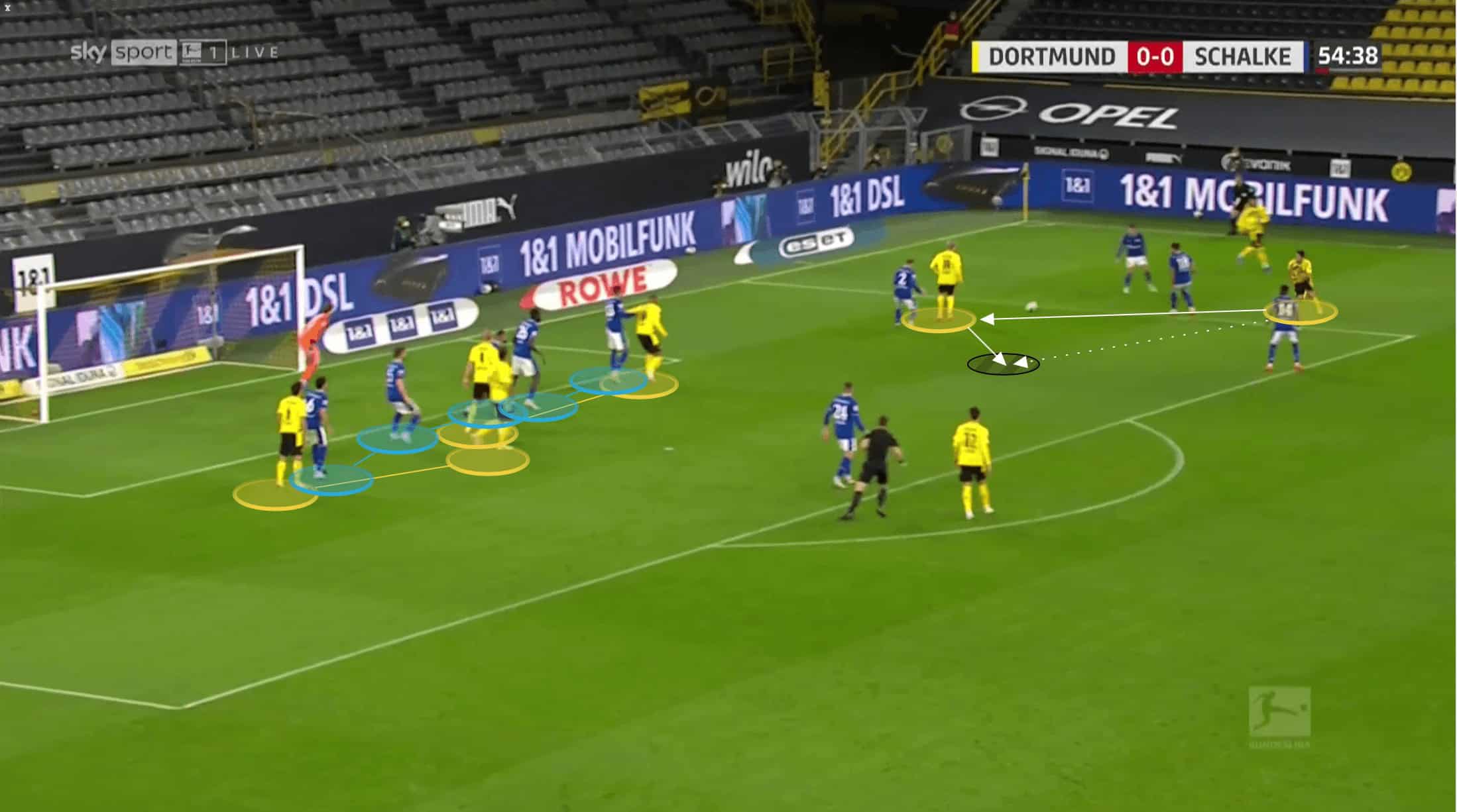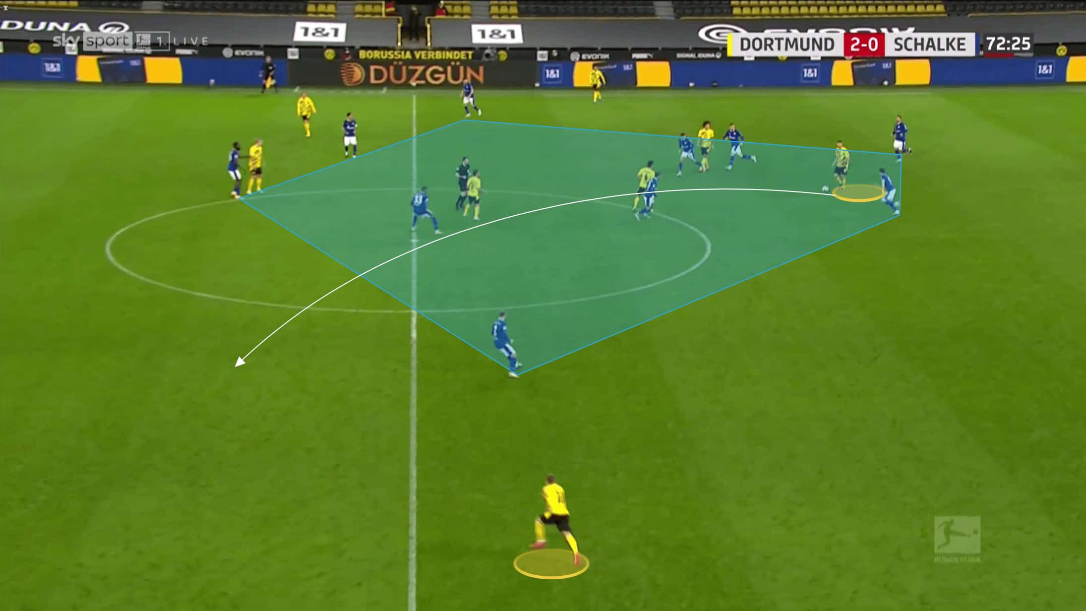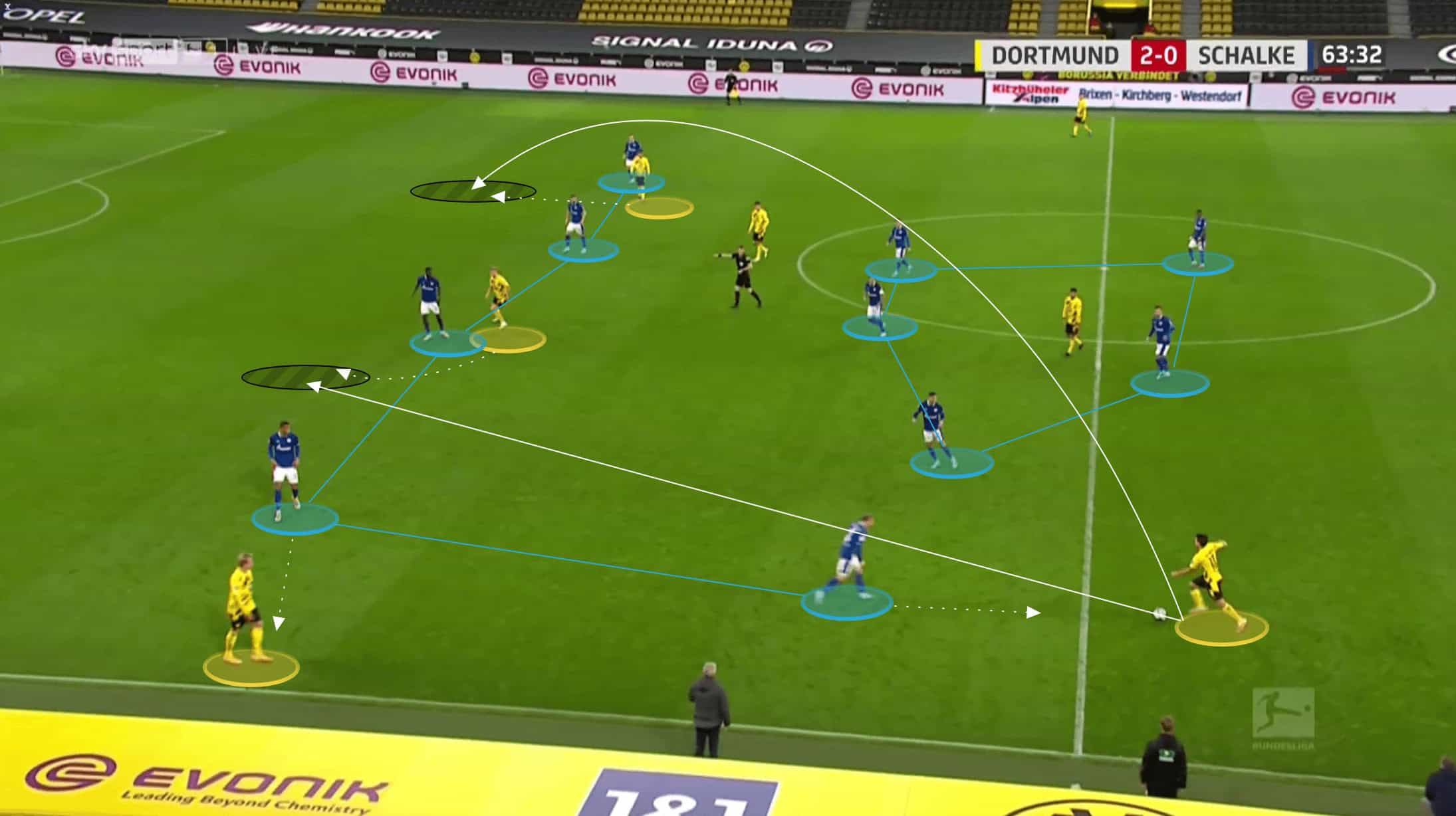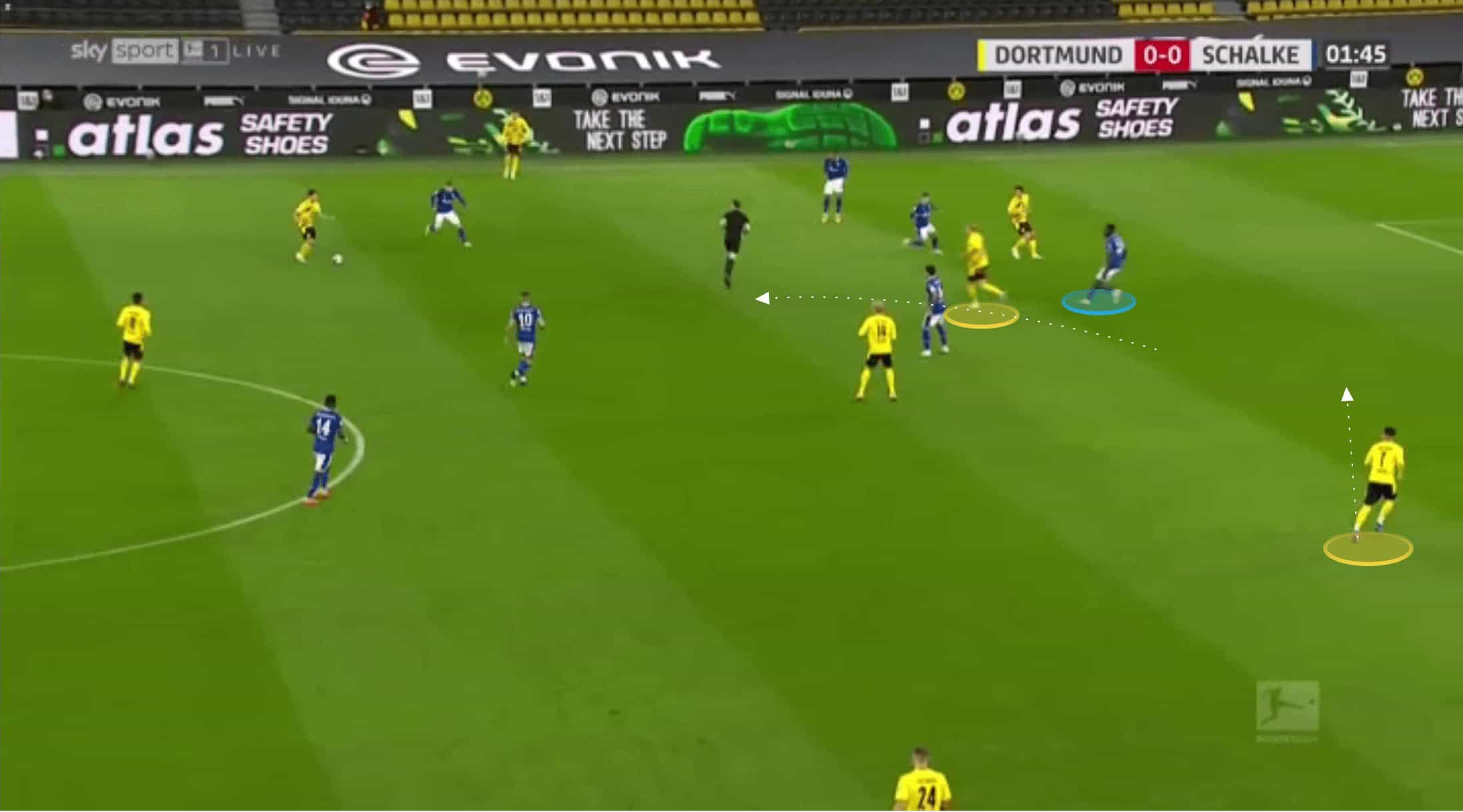 Below we can see how both Raphel Guerreiro and Meunier are about as wide as they can be as Hummels has possession, whilst Delany has dropped in to create a back three. Brandt is out of shot, playing close to Haaland at this point, but to ensure that Schalke’s midfield three have to stay alert, Sancho drops in himself to stop Dahoud from being isolated.