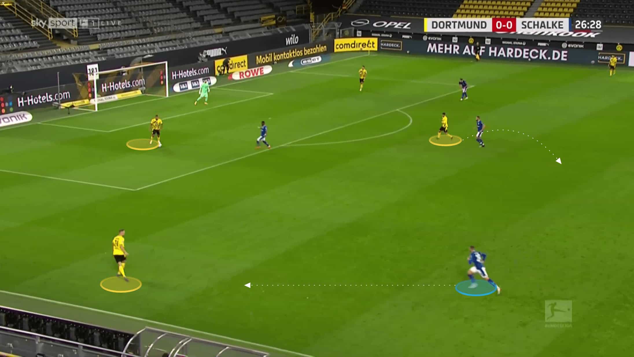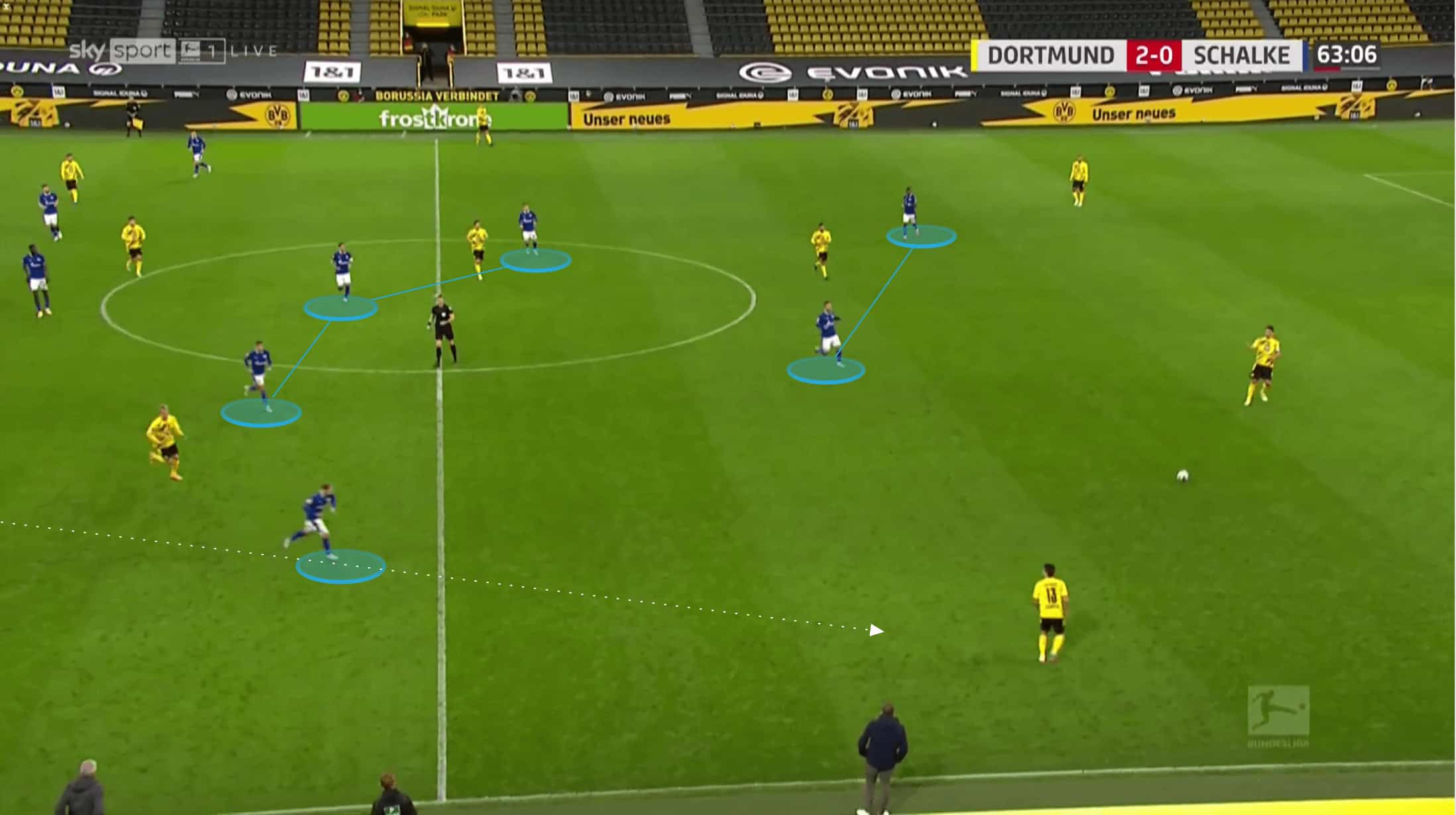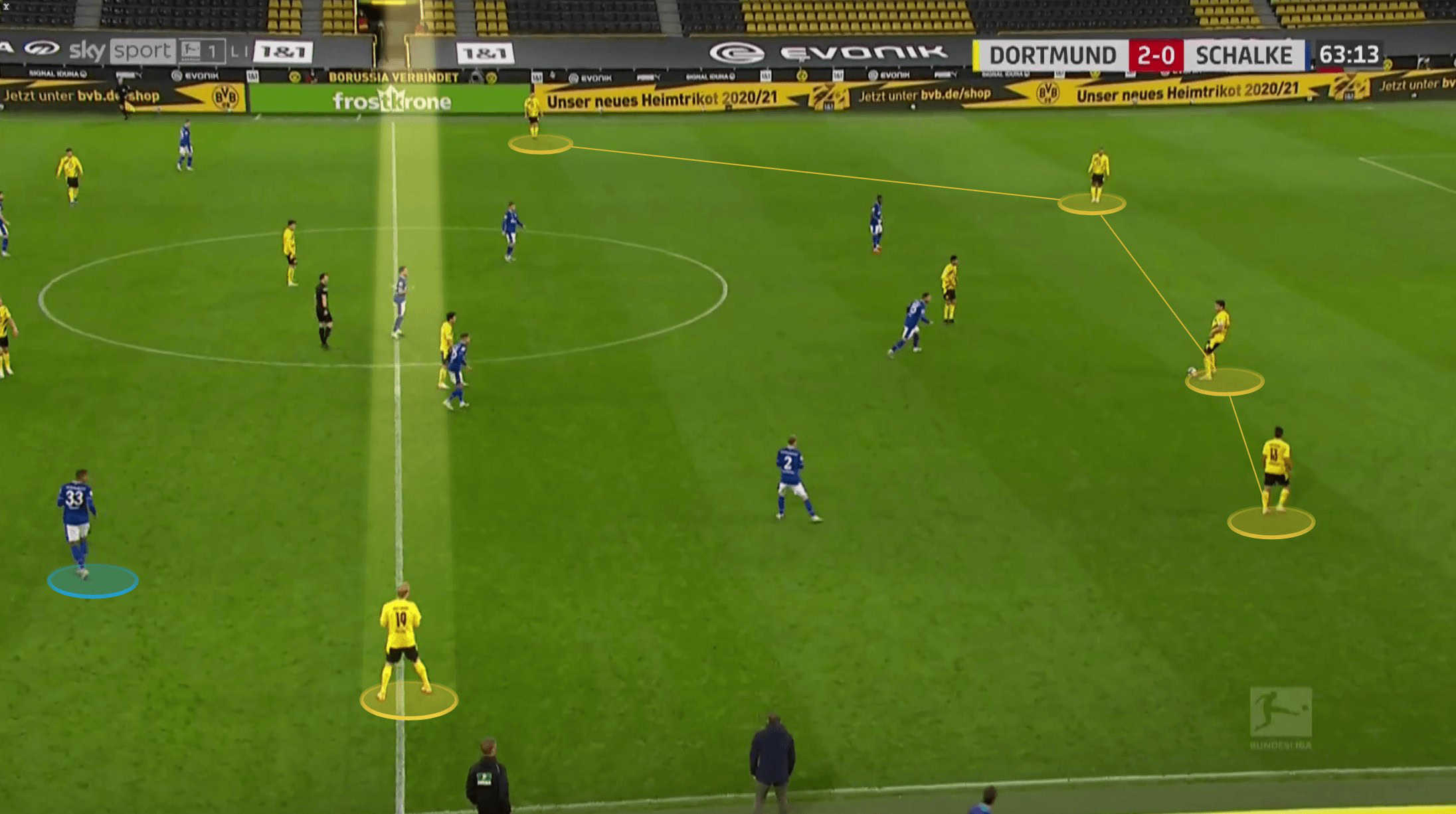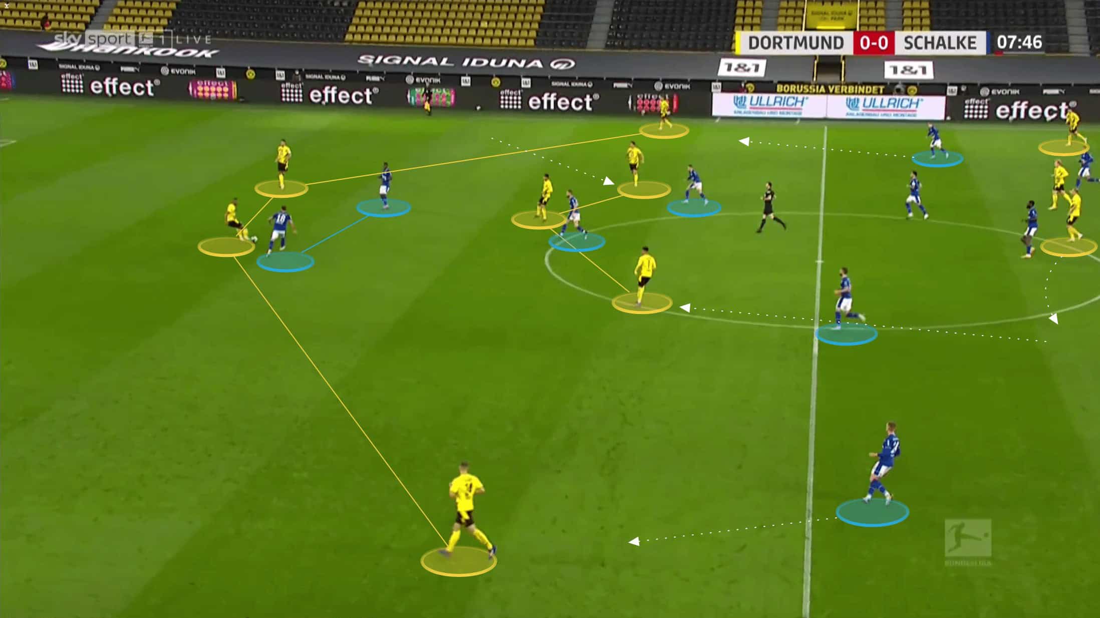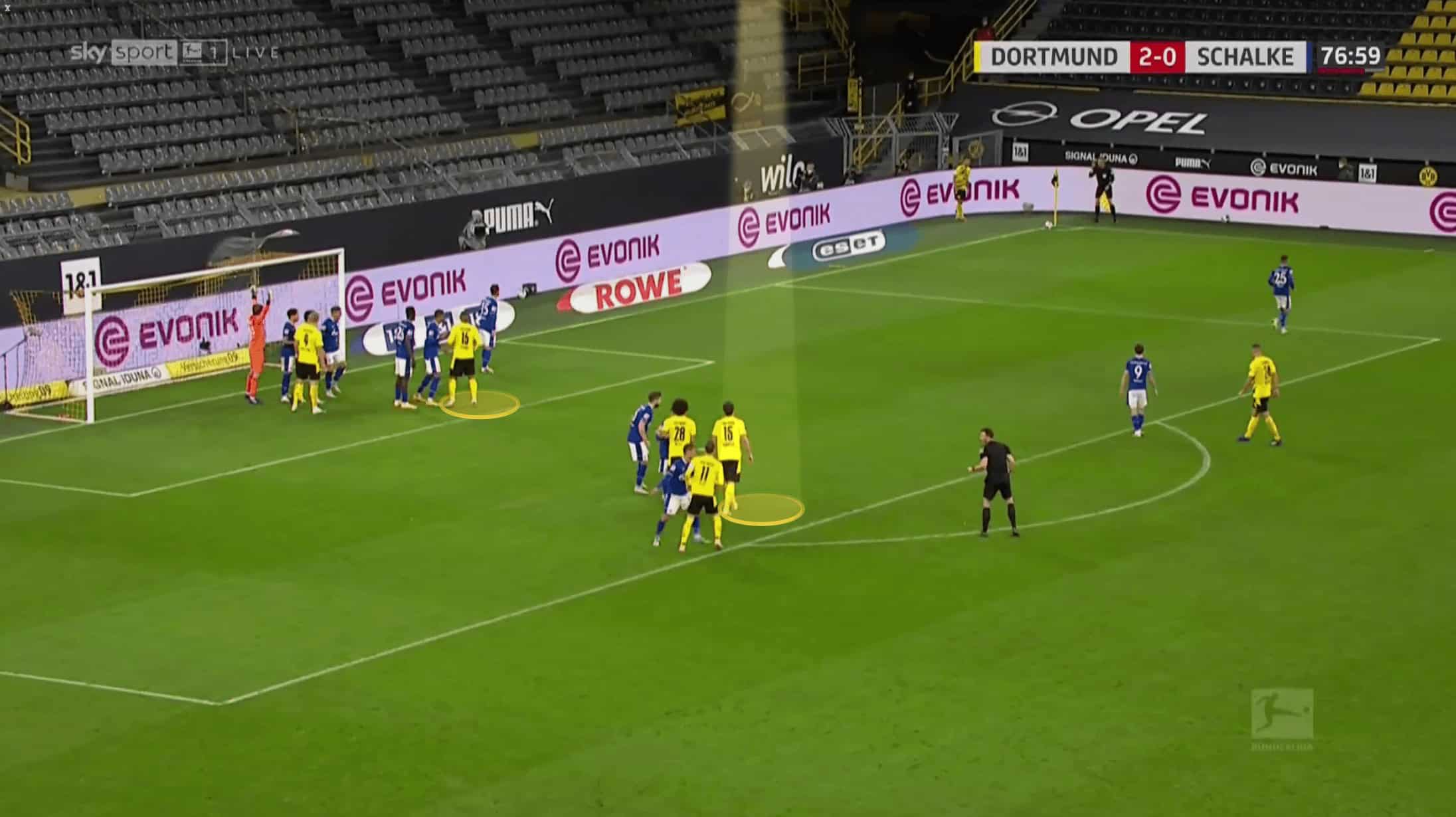Below we can see how both Raphel Guerreiro and Meunier are about as wide as they can be as Hummels has possession, whilst Delany has dropped in to create a back three. Brandt is out of shot, playing close to Haaland at this point, but to ensure that Schalke’s midfield three have to stay alert, Sancho drops in himself to stop Dahoud from being isolated.