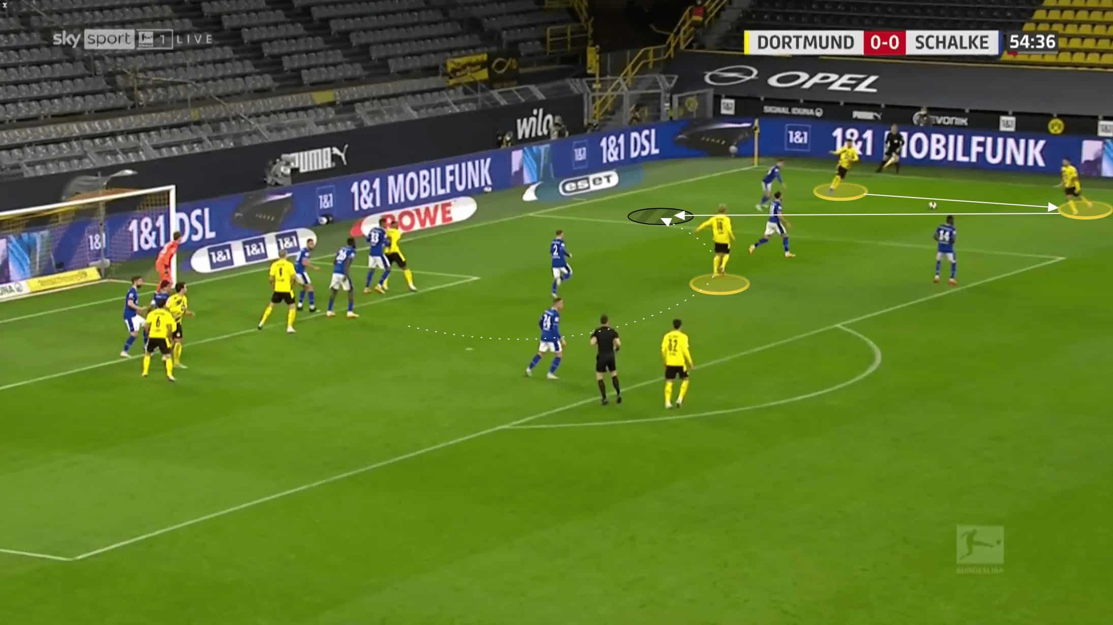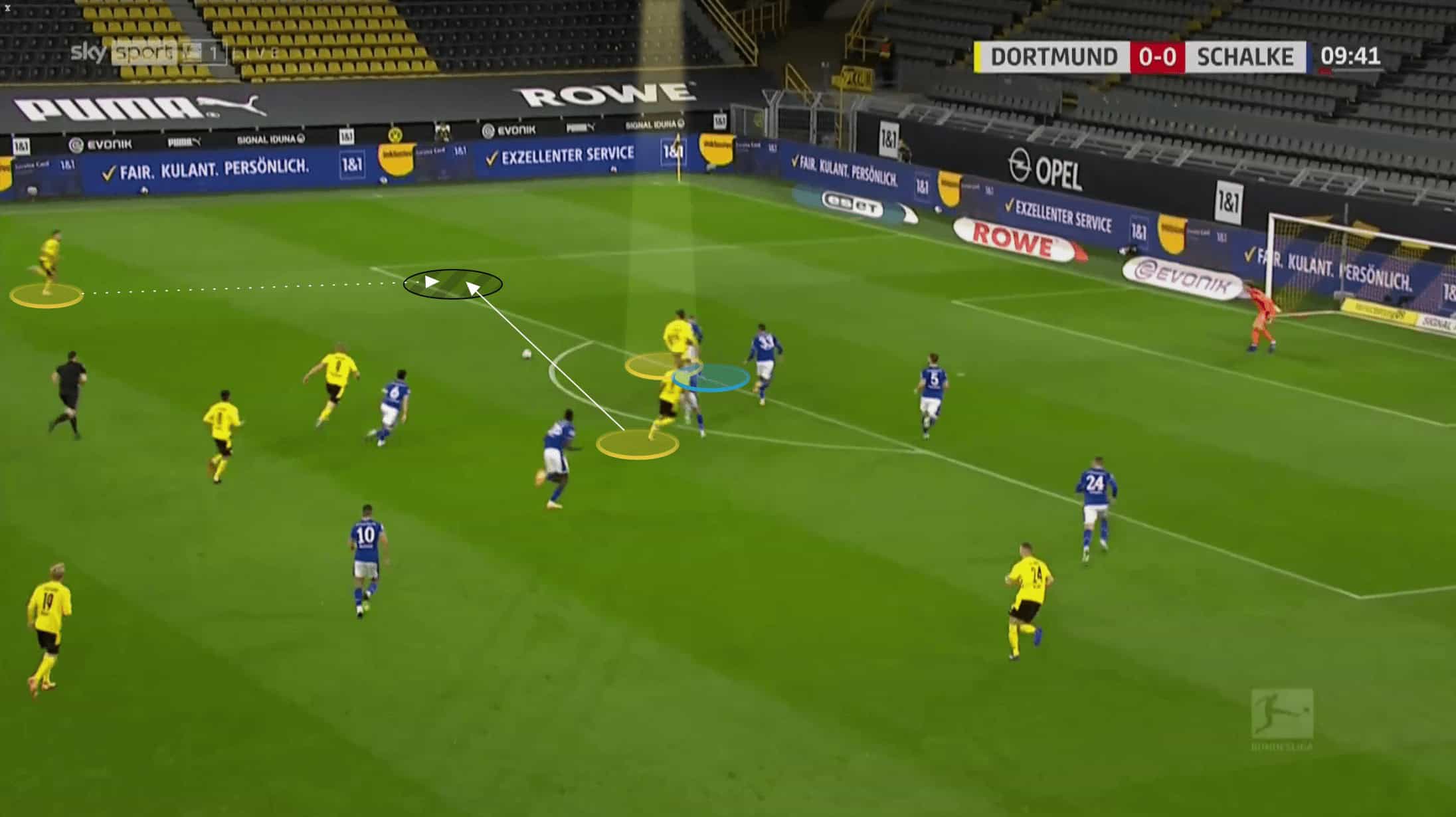 Knowing the wing-backs were going to push high, depending on the side which Dortmund had possession, Brandt could shift over to the same wing. If Schalke’s defence didn’t react and press him then he was a viable passing option. Otherwise, his run would bring the widest centre-back across with him, leaving enough space to find Haaland with a direct pass from the back line. On top of this, we can see how flat Schalke’s back line is here, with both Haaland and Sancho playing on the shoulder of their markers.