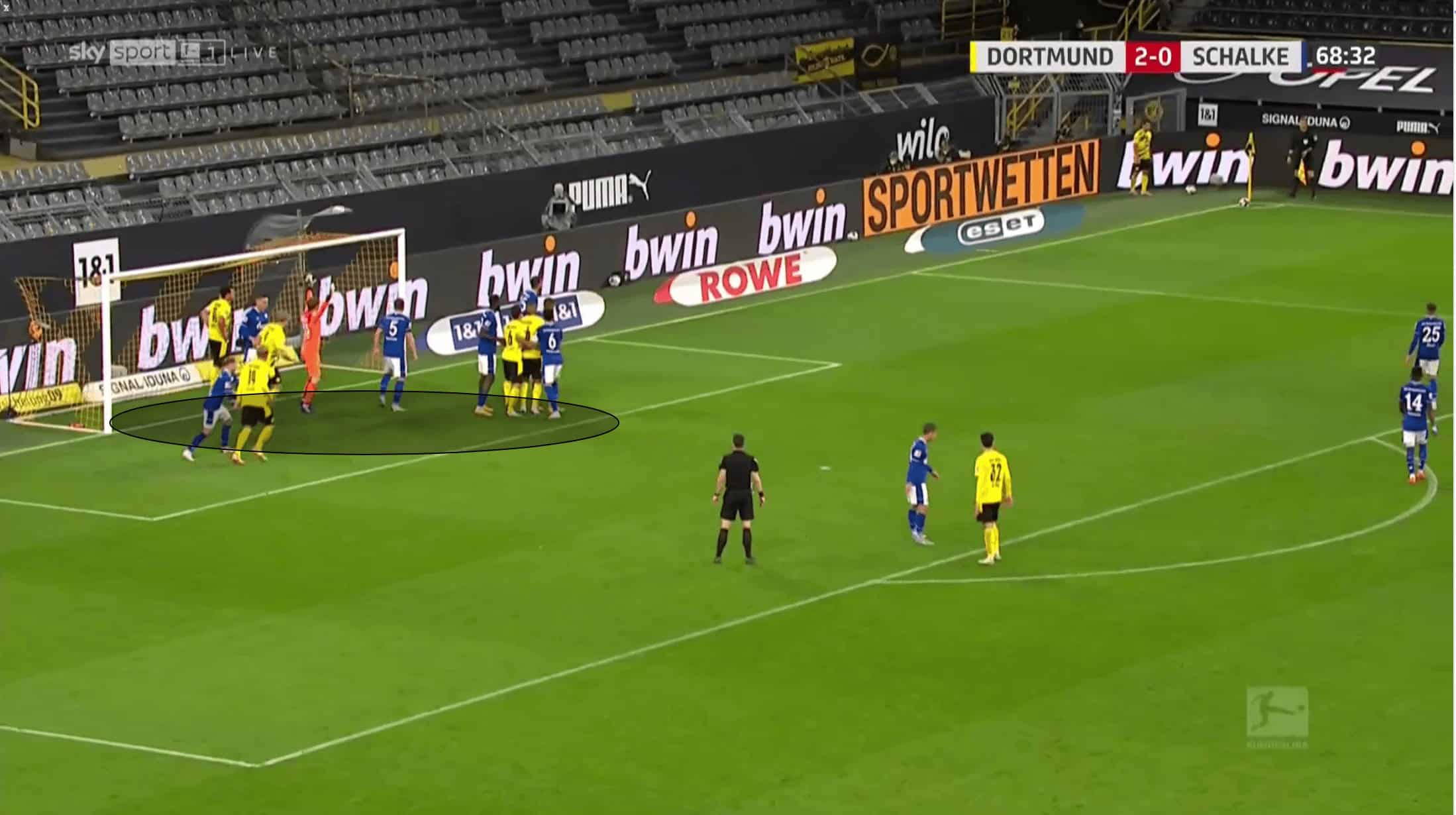 We can see in the image below how both of the Dortmund attackers starting inside the six-yard-box dart towards the corner-taker and in doing so take all of Schalke’s defenders who started in the six-yard-box out and towards the ball with them.