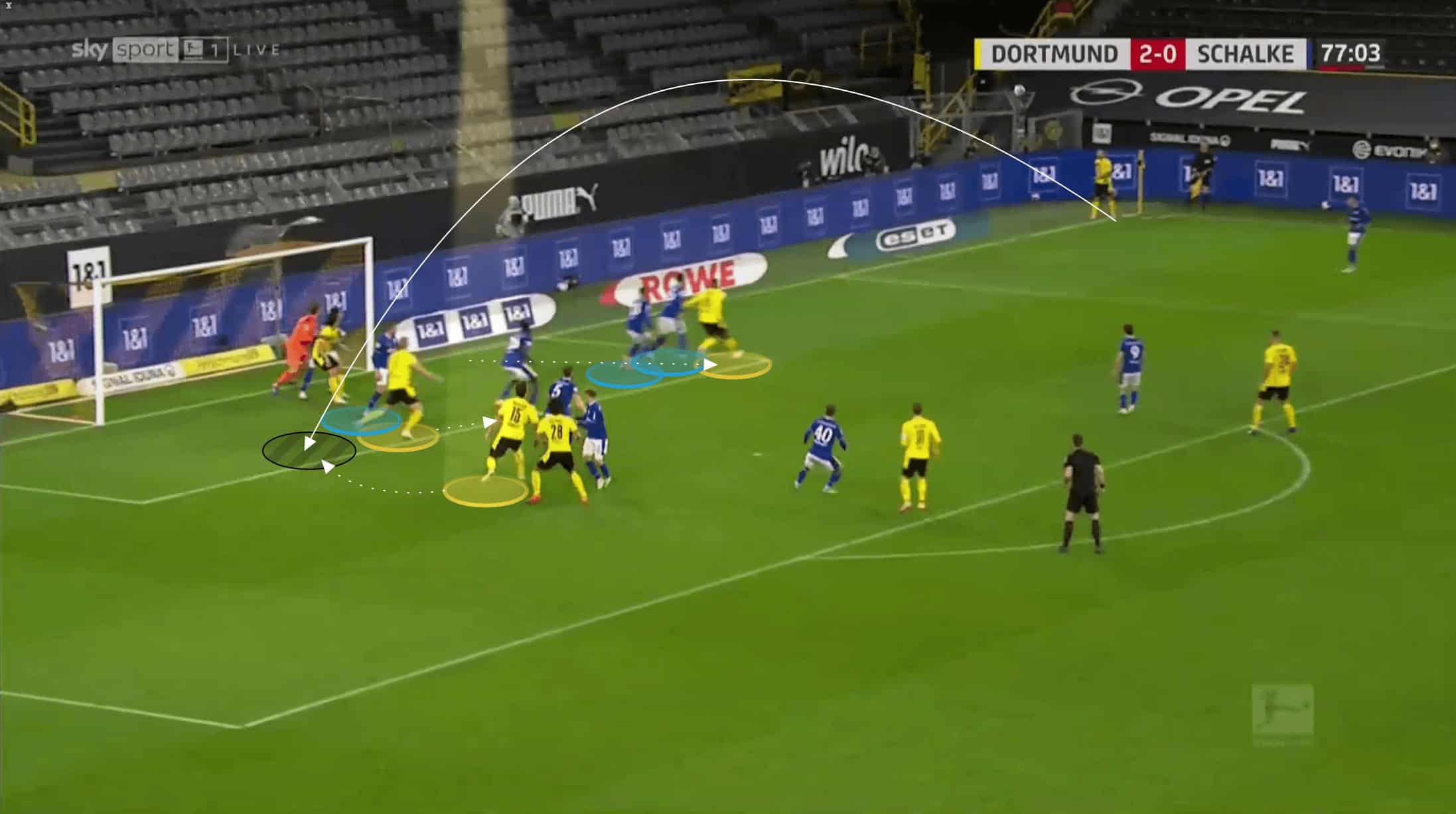 Dortmund looked to overload the six-yard box and then play short corners where they could quickly overload Schalke’s out-of-balance defenders and advance the ball inside with their sharp combinations once more.