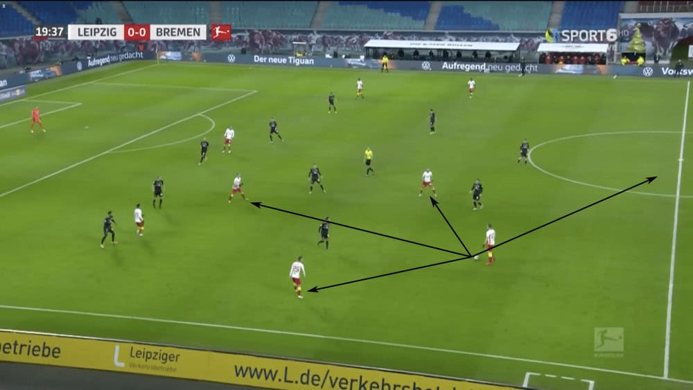 Marcel Halstenberg is in possession in the half-space, having dribbled forward in an attempt to attract defensive pressure. Werder were attempting not to pressure so that they could protect the space. Halstenberg has three immediate options that allow him to play a pass forward. As Leipzig seems to train, if he plays the most vertical pass, that will almost certainly be supported by runs from lower on the pitch, meaning that if Sabitzer received the ball, he has options to play the way he is facing. Halstenberg also had the option of passing the ball back to Upamecano or Orbán who can change the point of attack. These passing options from the central part of the pitch (relative to the wing) allow Leipzig to possess the ball with more legitimate threats toward goal.