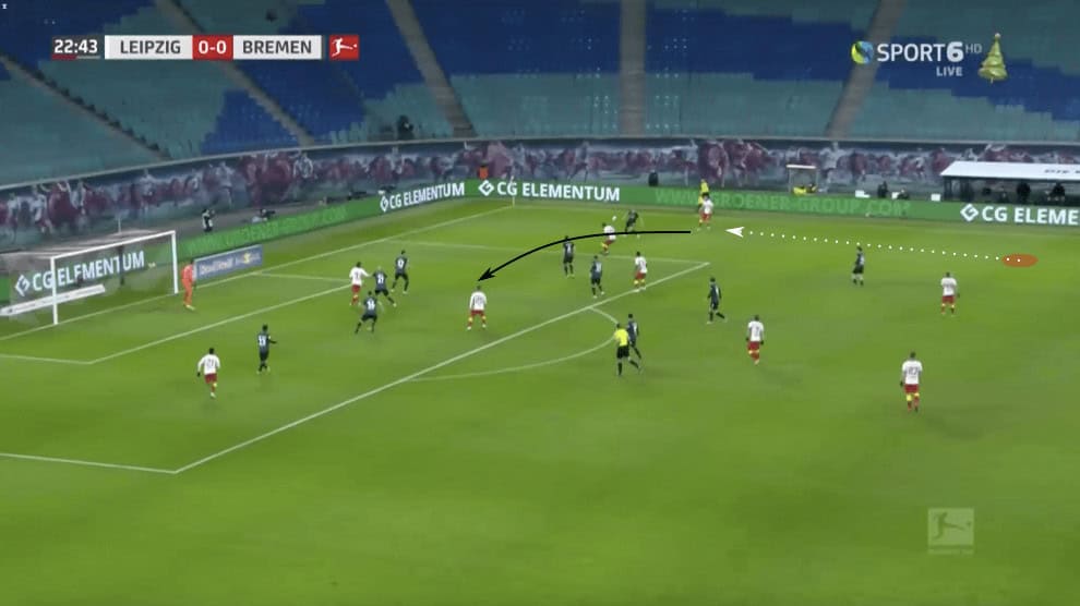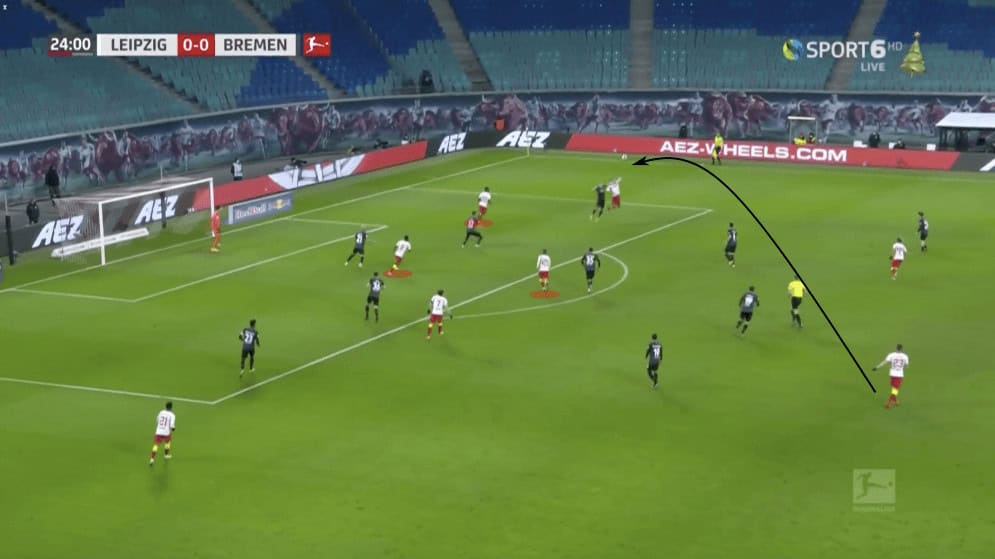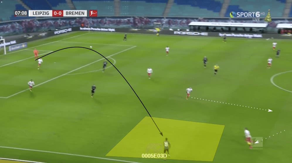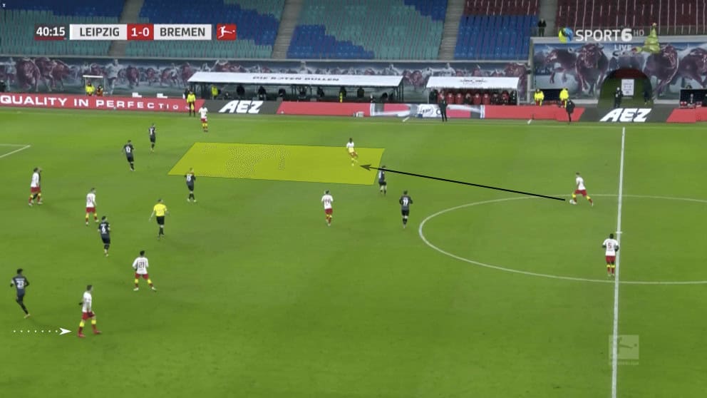 Nagelsmann appeared to trust his centre-backs to get high up the pitch as well, allowing them to develop numerical advantages by overloading spaces as they supported the attack. In the image above, Orbán progressed up the pitch on the right side. Both Haidara and Mukiele had moved in more centrally, allowing for the space to open up. Their central movement forced the Werder defensive structure to shift. This meant space opened up for Olmo, who was able to slip in behind the defender who was tracking Haidara. While his volley was blocked, Olmo’s chance in a high-scoring area came about because of Orban’s movement and ability to attract defensive pressure.