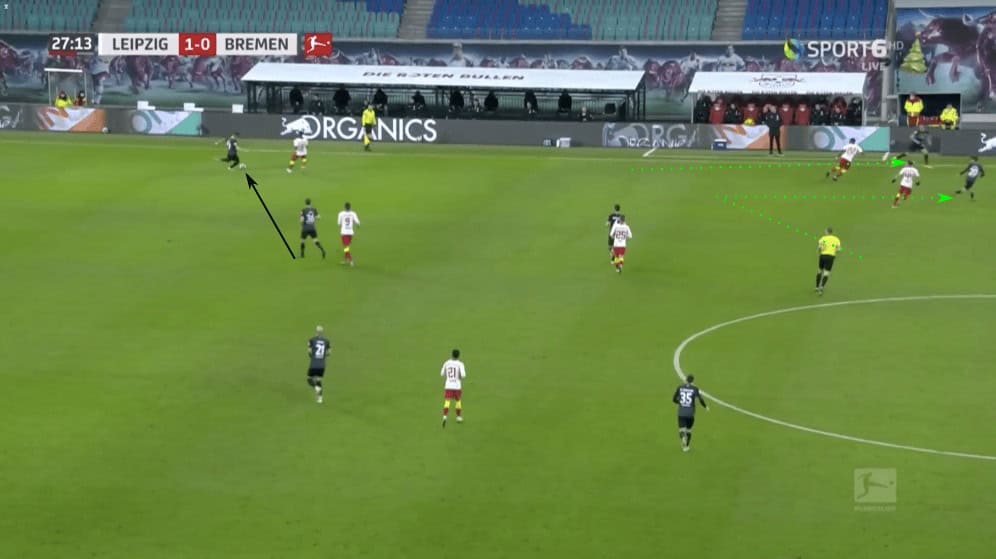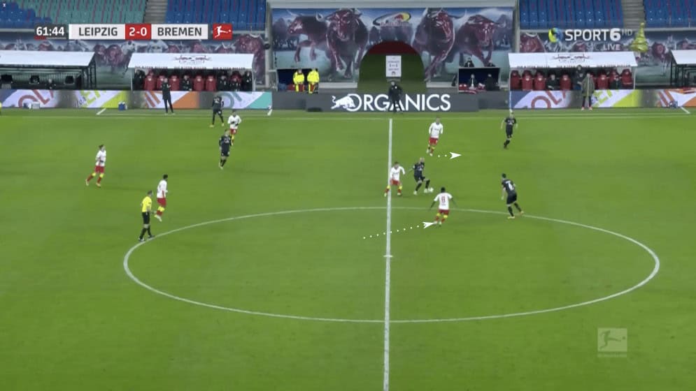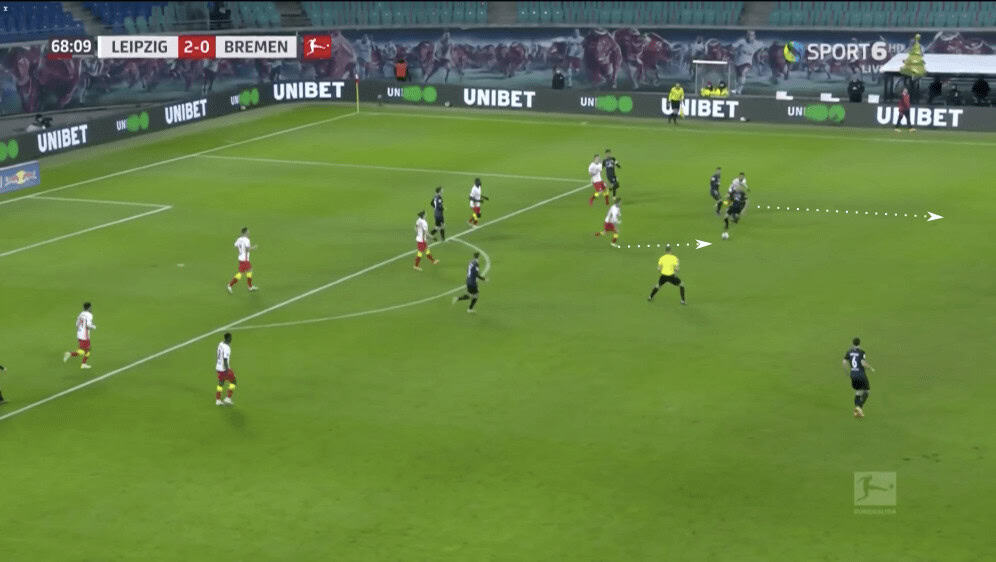 Werder was able to find a solution to progressing out of their own build-up zone, and that was done by dropping the outside-backs deeper. This made the amount of ground that Leipzig’s outside-backs had to cover much bigger. This allowed Werder to get more time on the ball. However, Leipzig’s layered press still posed problems.