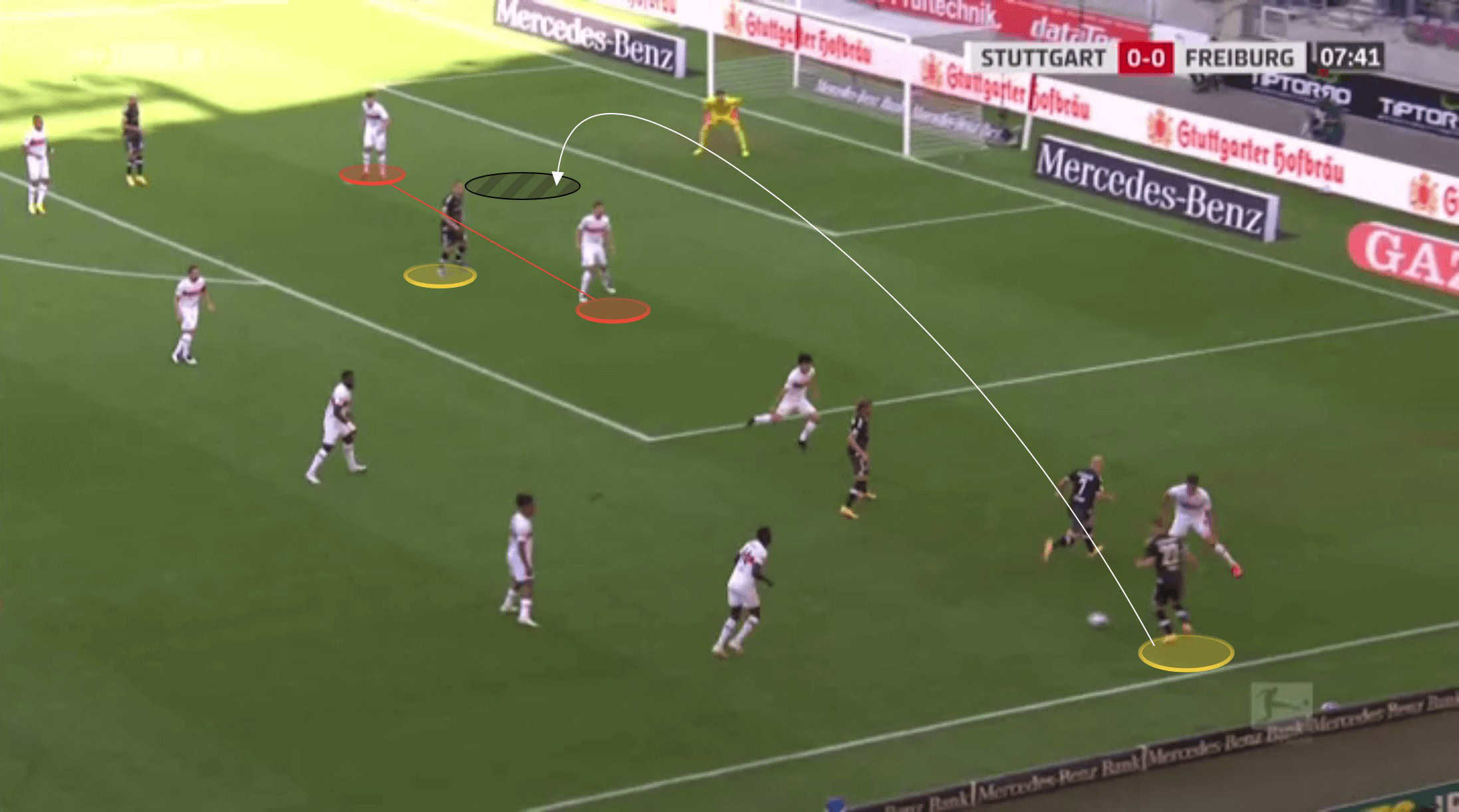 As such, Freiburg looked to press high and force these errors, employing a simple pressing structure to force Stuttgart onto the flanks, whereby they could cut out their options and regain possession in an attacking area.