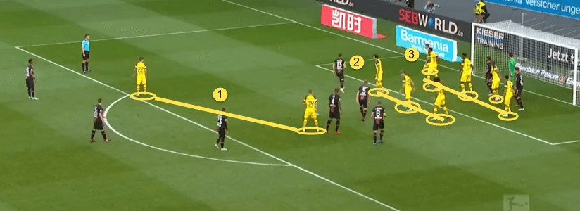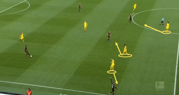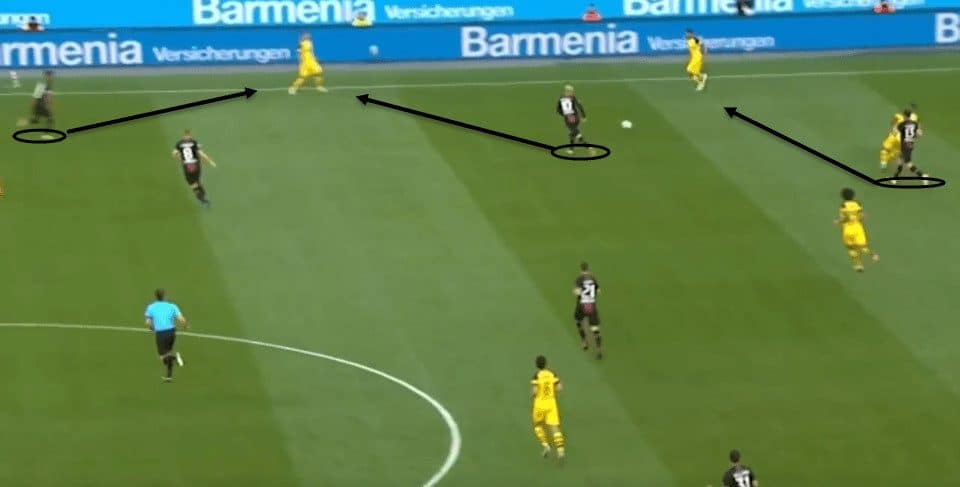 Dortmund instead took a more structured approach to defending, instead focusing on getting numbers behind the ball whenever Leverkusen attacked, or cutting off passing lanes rather than relying on power in numbers.