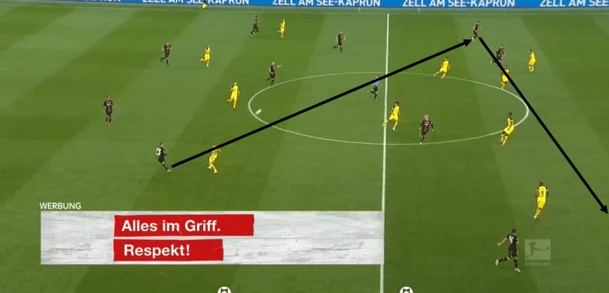 Bayer Leverkusen also adopted the approach of playing plenty of diagonal balls in order to bypass the centre of the pitch, which included this exchange with Leverkusen switching the play twice in quick succession.