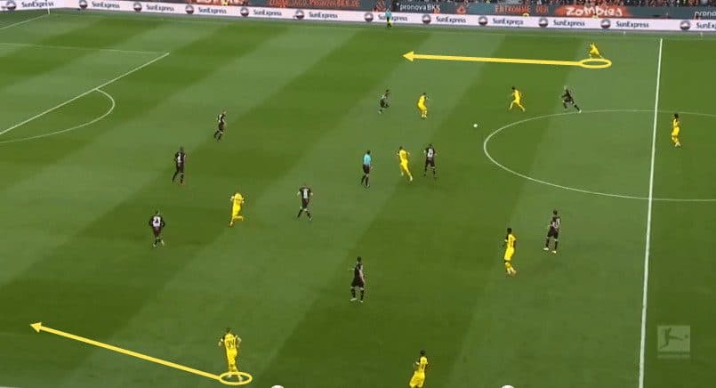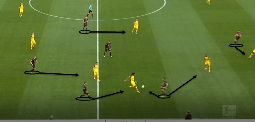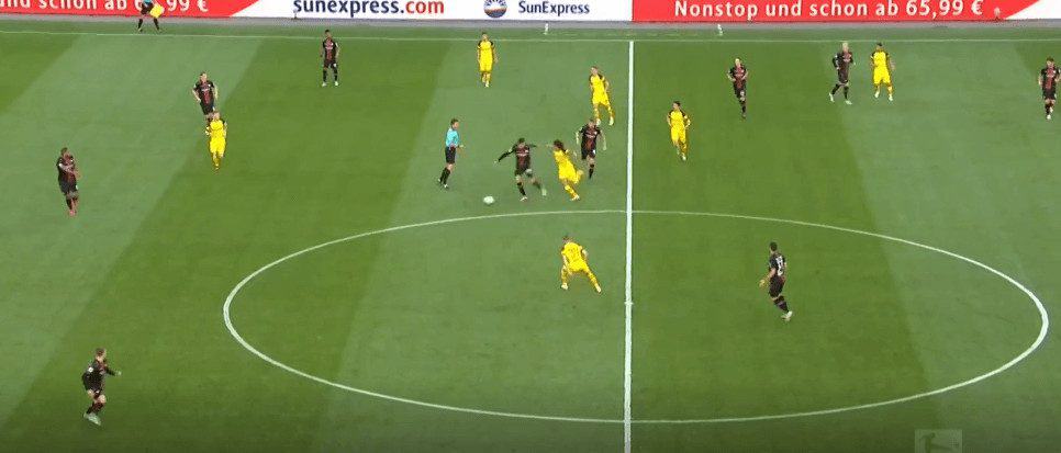In the above example, Dortmund don’t press the Leverkusen player on the ball (except for the player behind the ball!), instead dropping back and ensuring that any immediate passing option is cut off – forcing the Leverkusen player to play a longer ball – increasing the chances of a turnover in possession