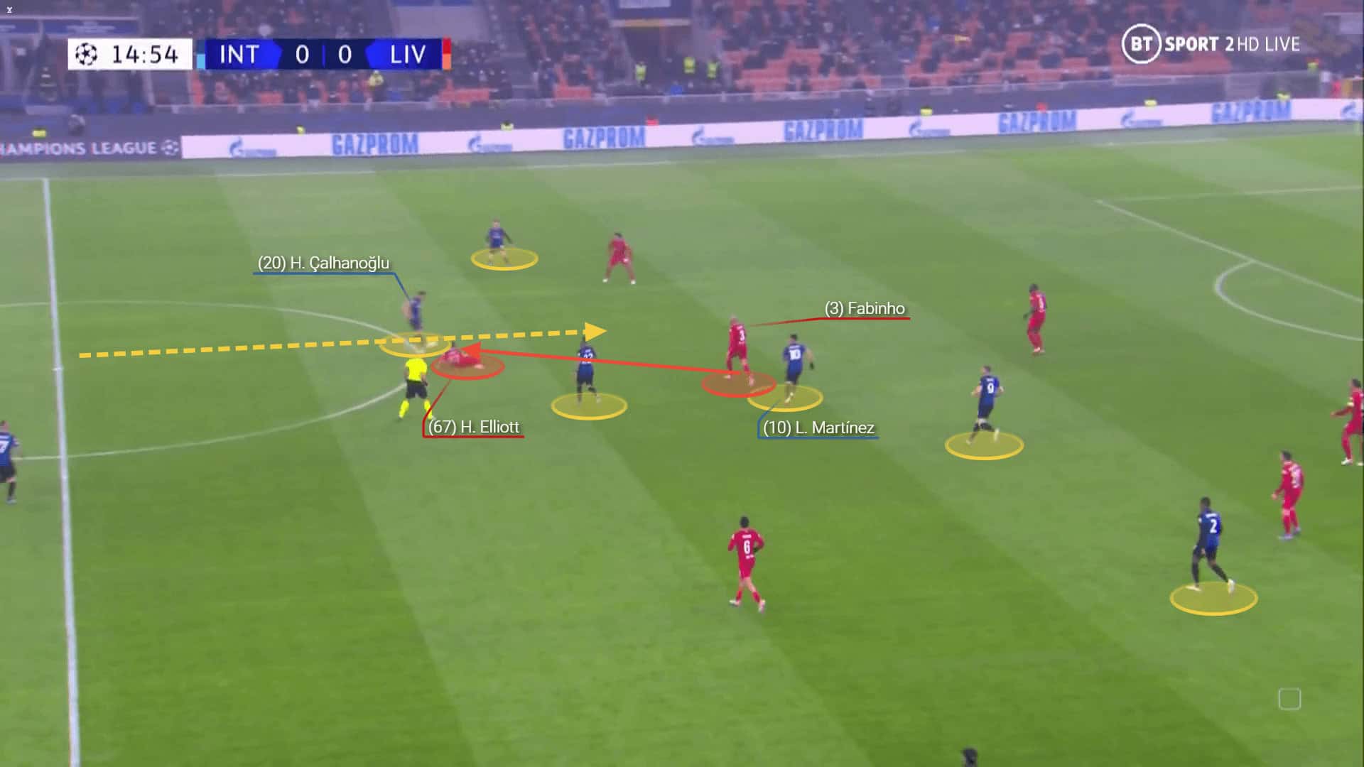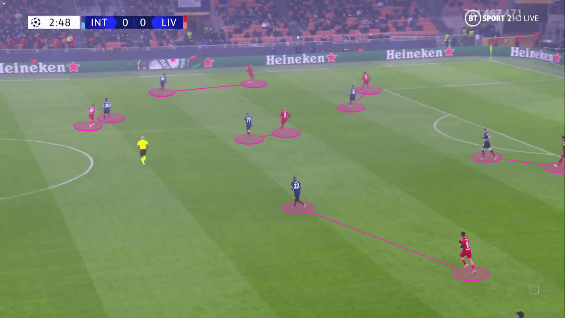 Inter would invite the press on many occasions and try to retain possession at the back, in their efforts to open the passing lanes and progress the ball. With Liverpool being pressing masters and trying to recover the ball in the advanced areas, forcing the opposition into inaccurate passing, this would often work, as the Reds would overcommit to their press. This allowed Inter to build up fluently on multiple occasions, displaying their link-up-play abilities.