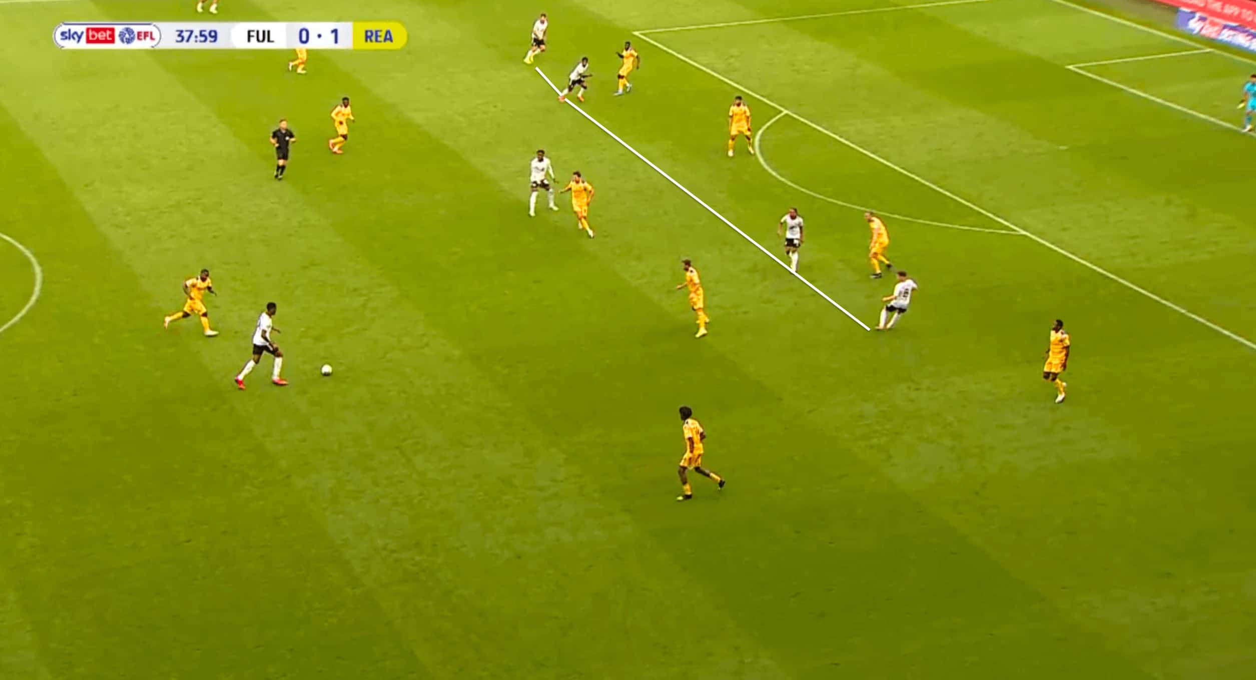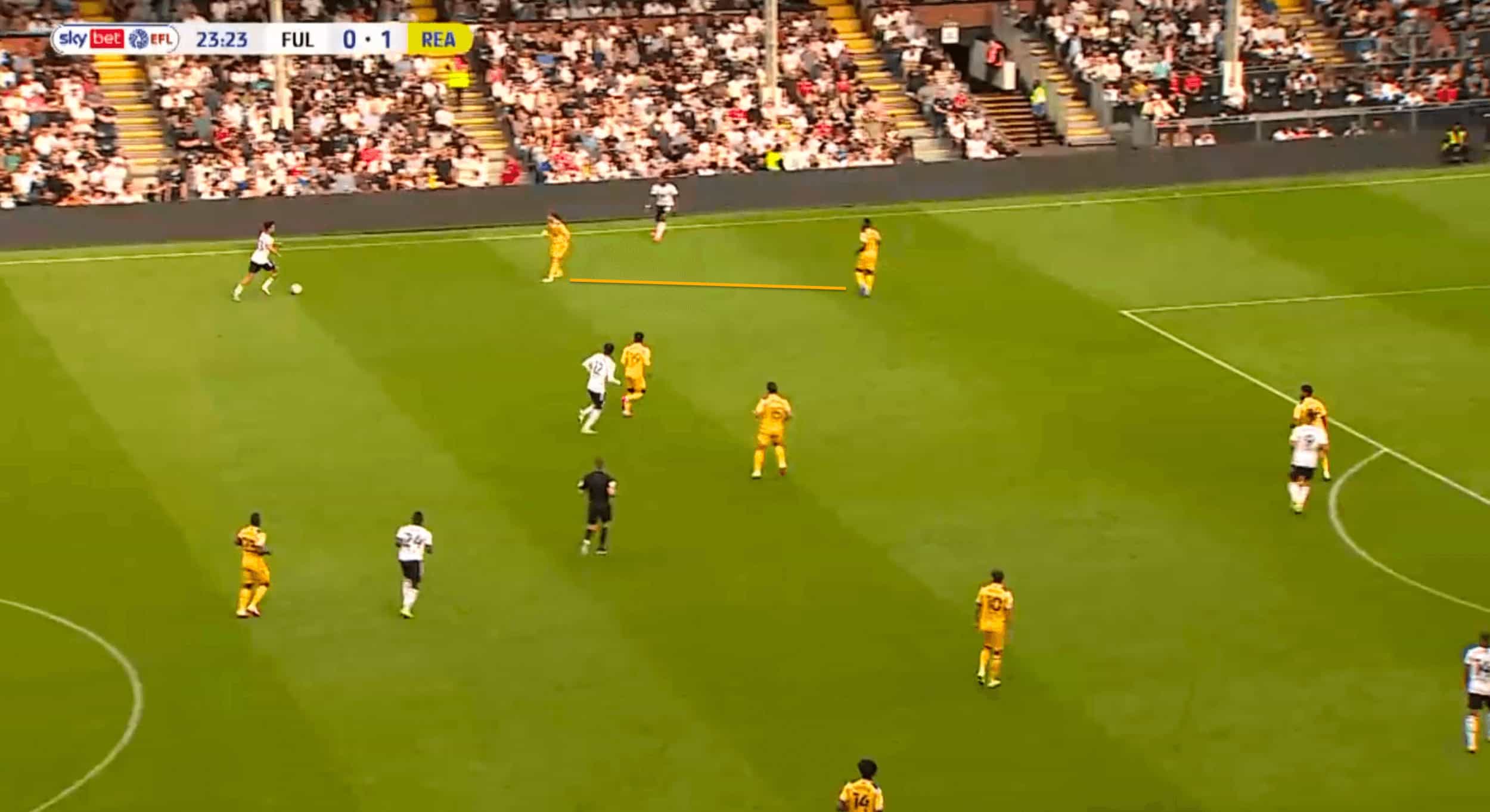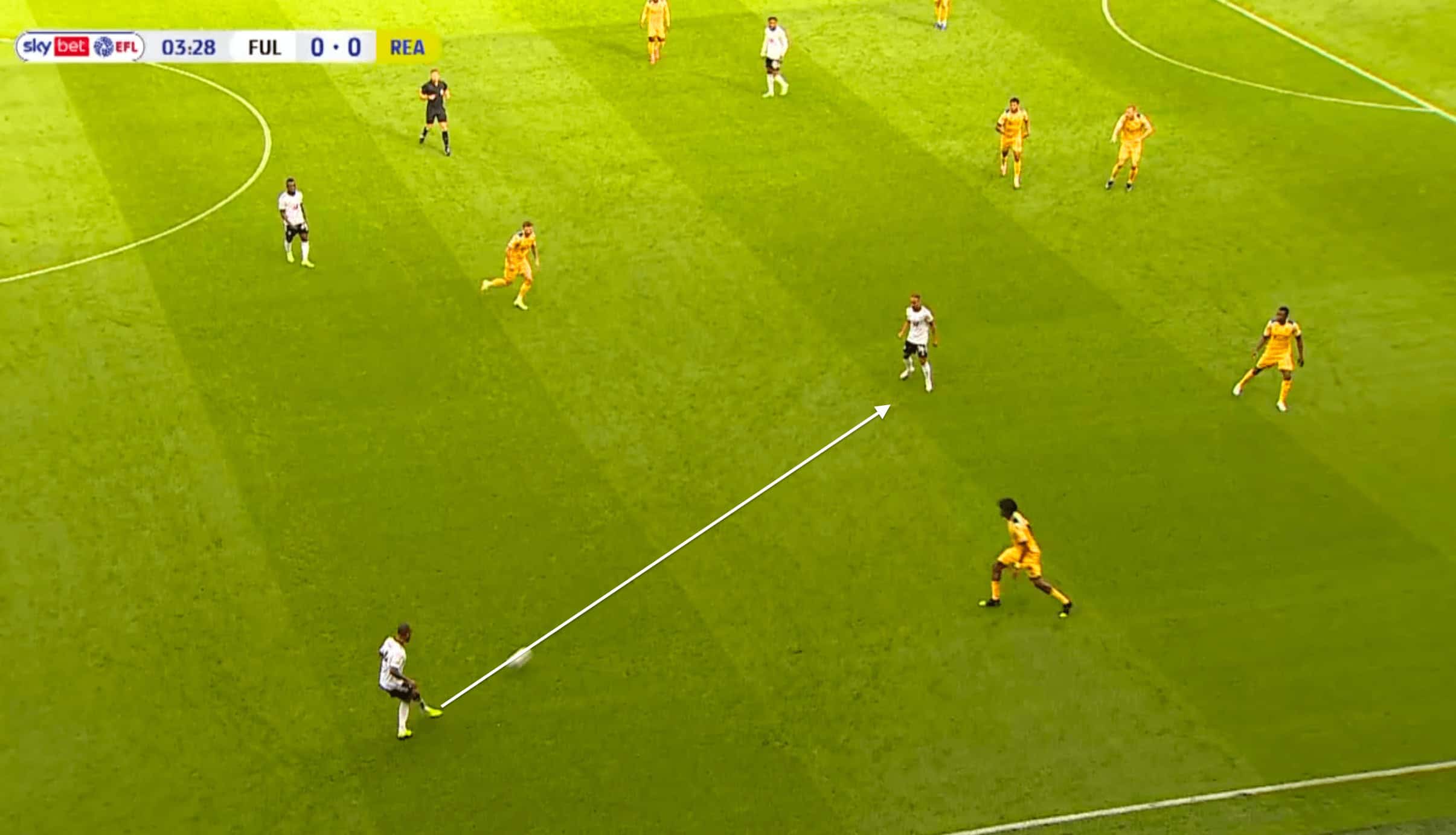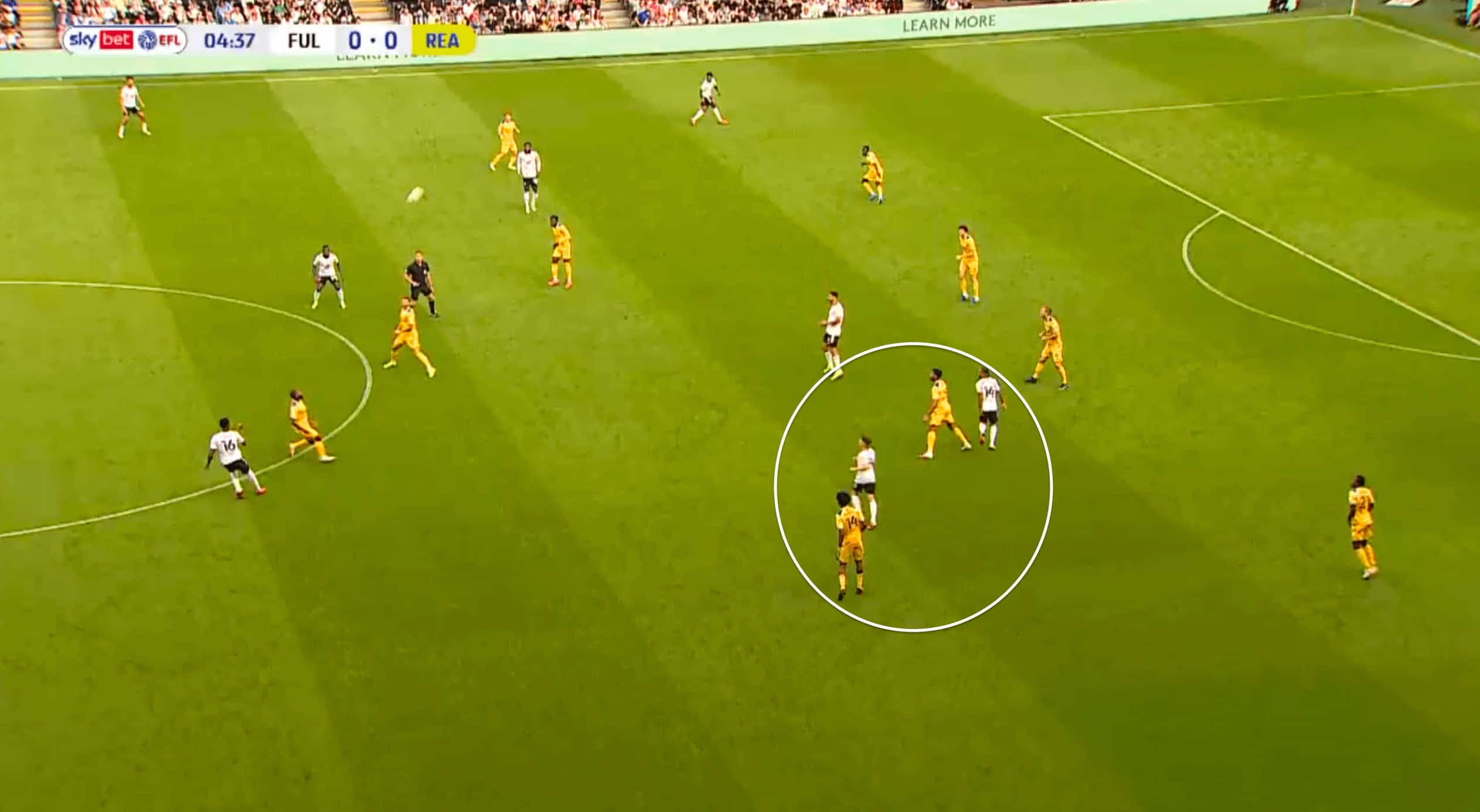 In some instances, Reading were very wary of their threat down the flank that they decided to cover shadow the wings while leaving the half-spaces free. The idea was that it could have stopped them from defending a lot of combinations whereas Fulham wasn’t that equipped to do the same thing when a player received the ball in the half-space. We can see the ball-near winger’s body orientation covering the flanks while the passing lane to Reid in the half-space is open. This is an unusual tactic as half-spaces are much more valuable than the wide regions to teams in possession, though was a bold one and did impact Fulham.