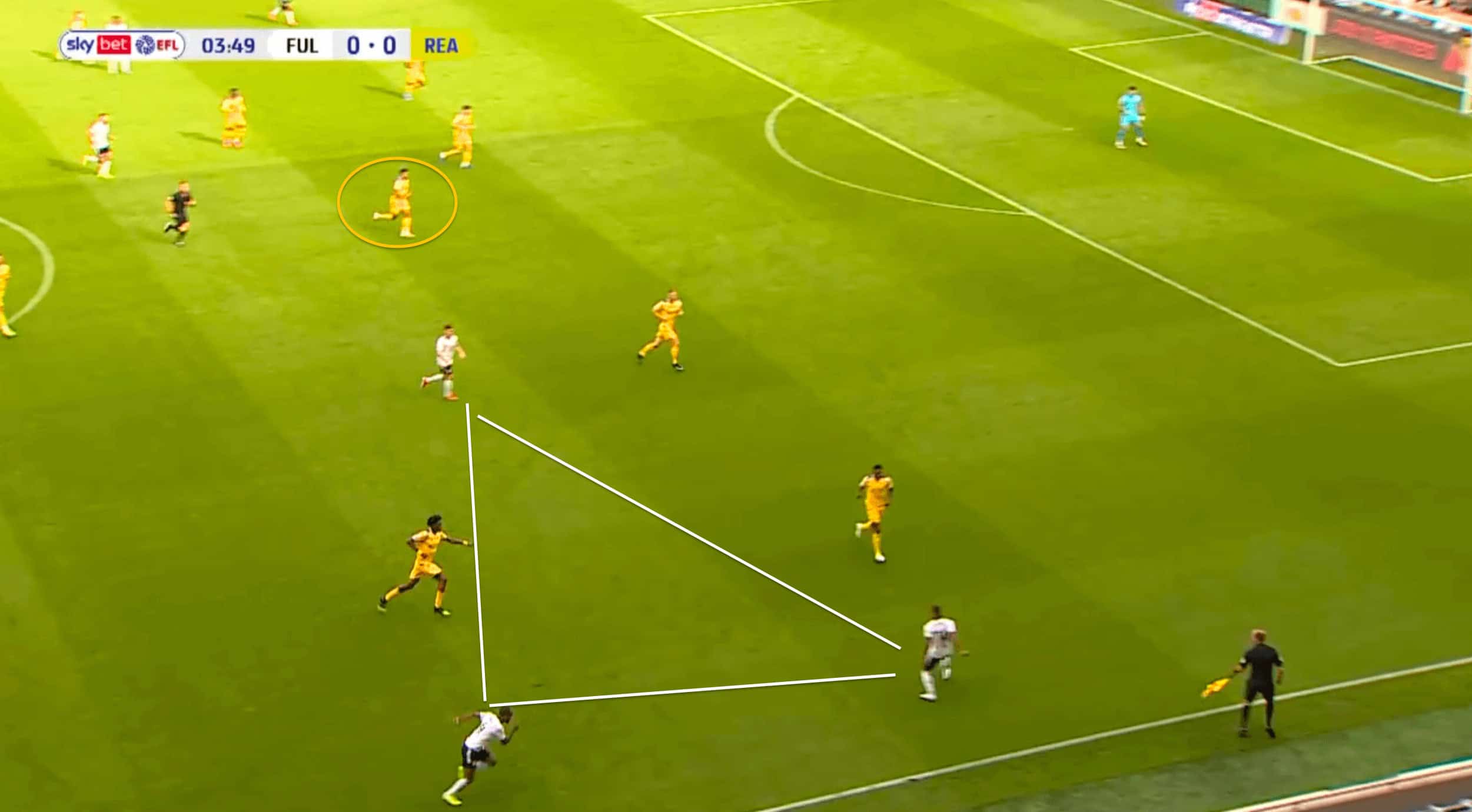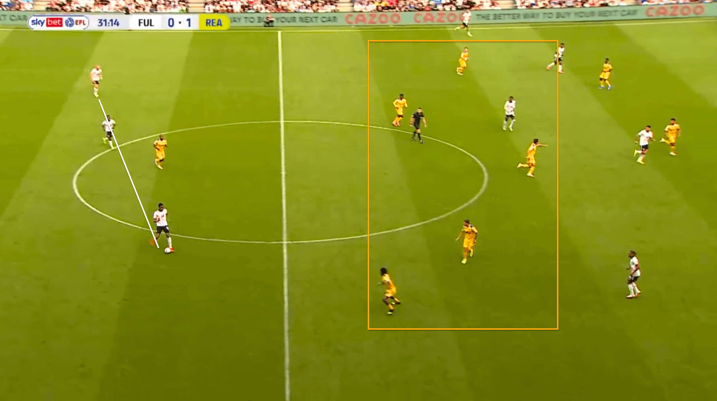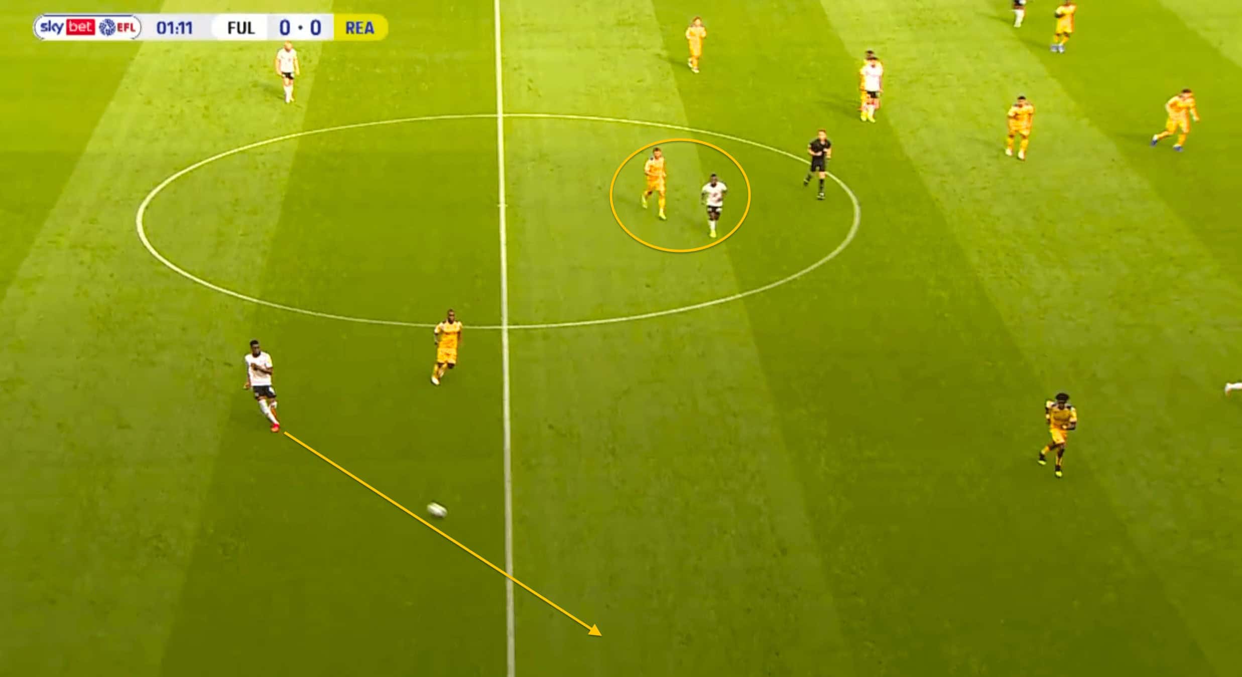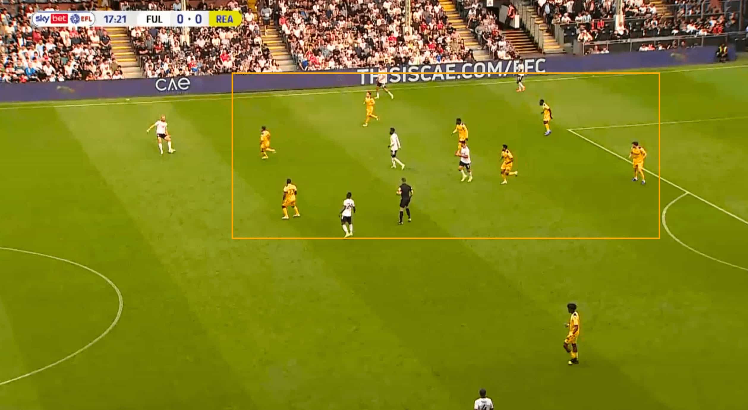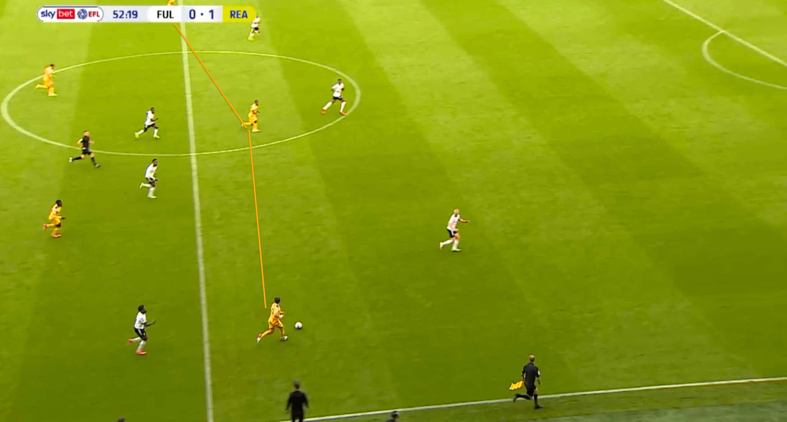 In some instances, Reading were very wary of their threat down the flank that they decided to cover shadow the wings while leaving the half-spaces free. The idea was that it could have stopped them from defending a lot of combinations whereas Fulham wasn’t that equipped to do the same thing when a player received the ball in the half-space. We can see the ball-near winger’s body orientation covering the flanks while the passing lane to Reid in the half-space is open. This is an unusual tactic as half-spaces are much more valuable than the wide regions to teams in possession, though was a bold one and did impact Fulham.